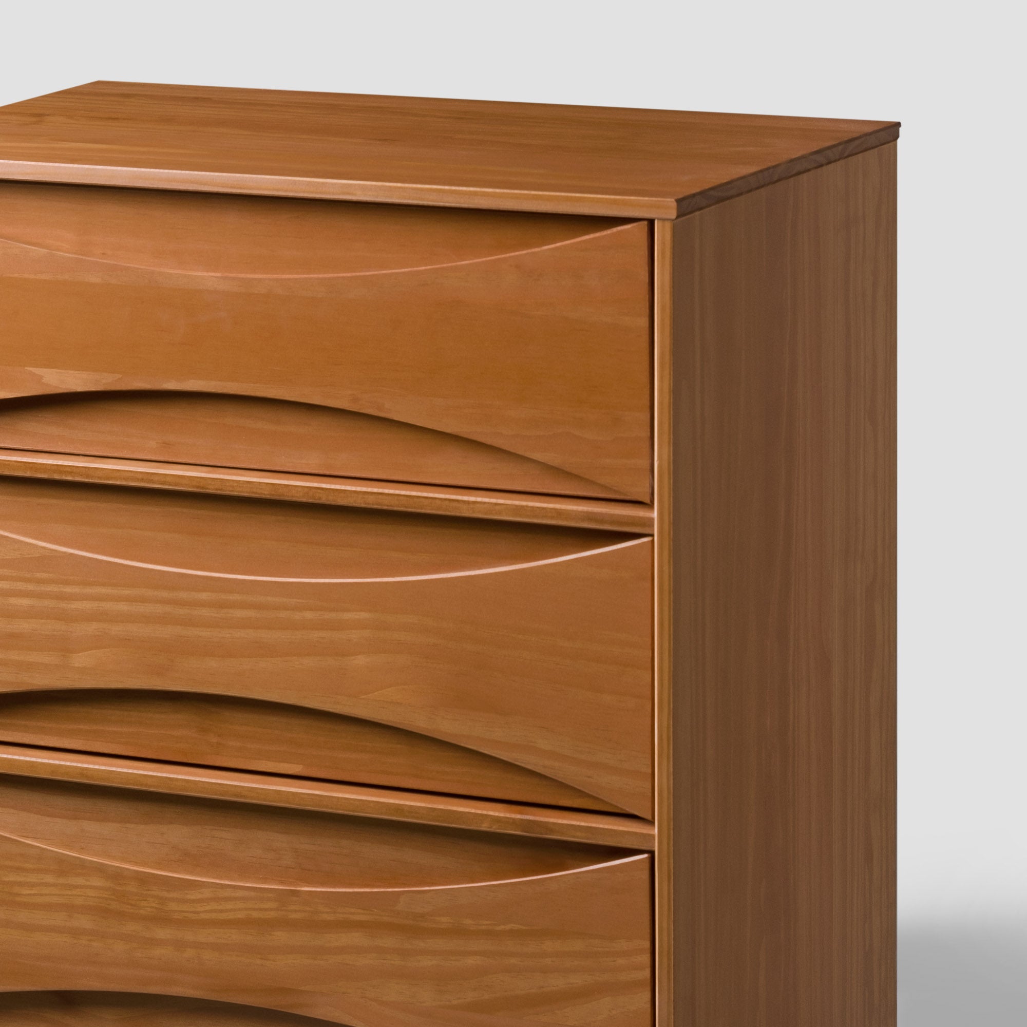 - Curved, beveled detail on each drawer for a unique, modern appeal