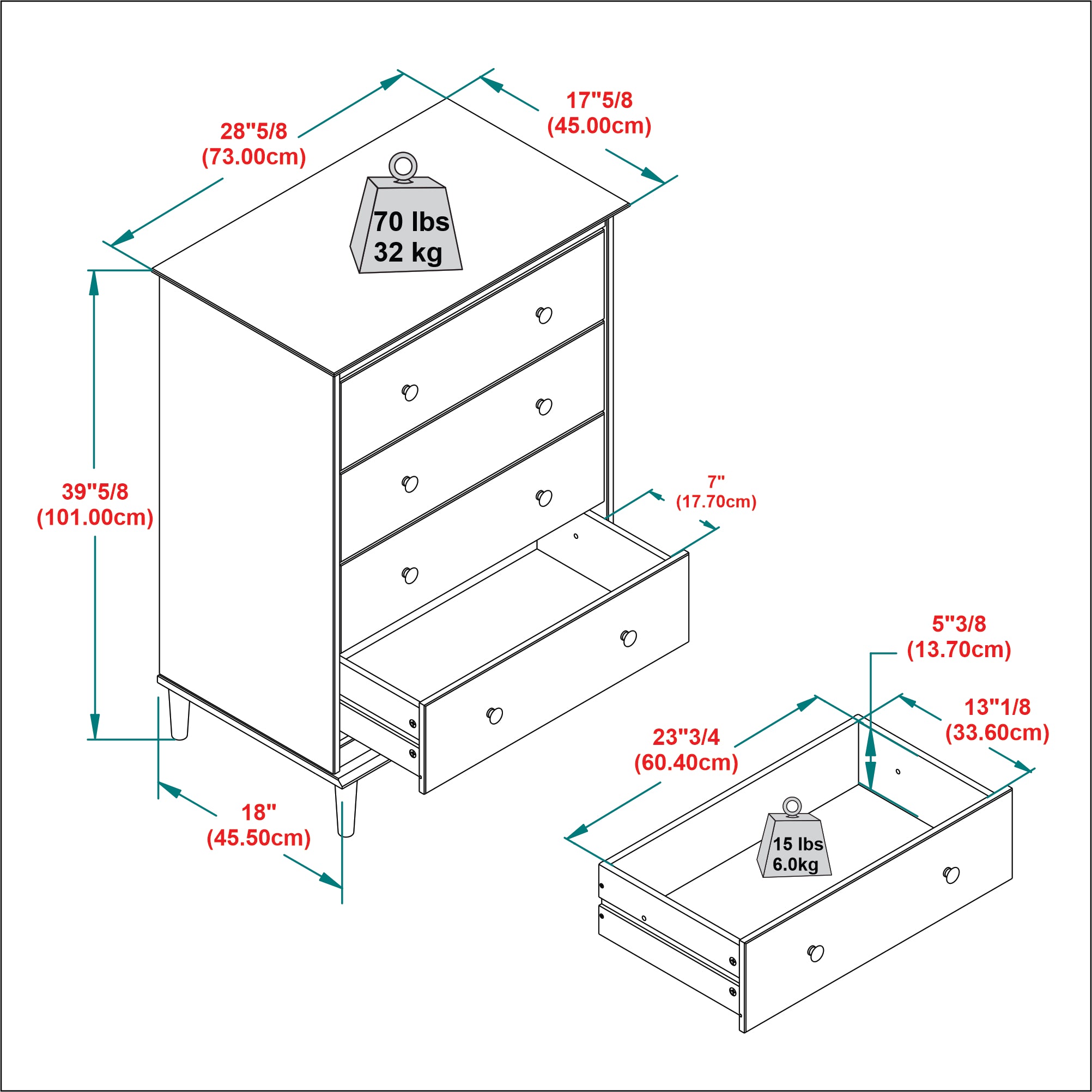- Dimensions: BR4DDRWT-T 4-Drawer Solid Wood Dresser BR4DDRWT-T - 39.63" H x 28.63" L x 18" W
