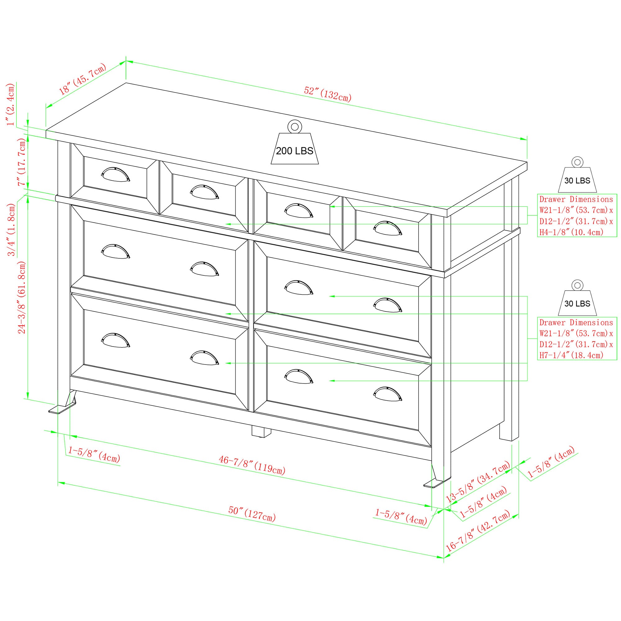 - Framed drawer faces, telescoping drawer glides, Faux double top drawers (6 drawers to look like 8), Drawer weight capacity of 10 LBS Estimated Assembly Time: 120 min