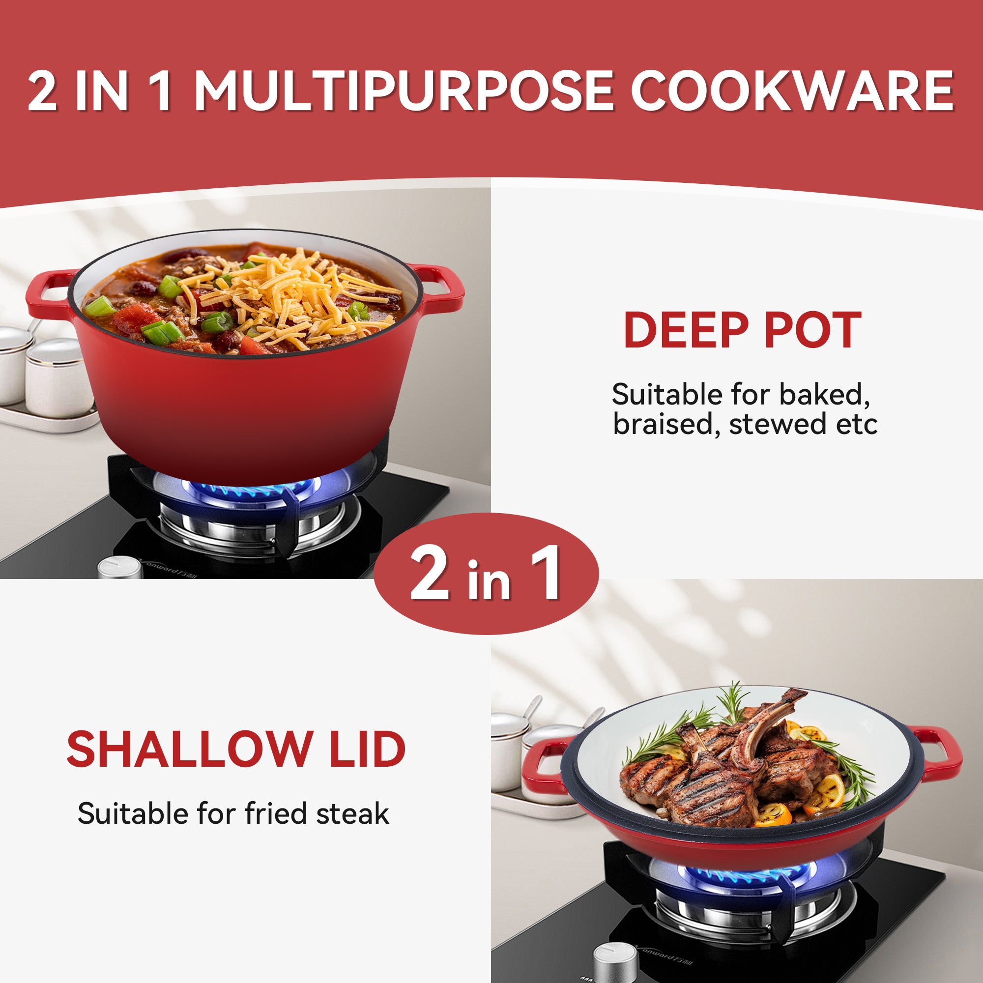 - 2-IN-1 CAST IRON DUTCH OVEN SET: This cookware set includes 6qt dutch oven and 2qt lid.Owning this dutch oven pot is equivalent to having both a stew pot and a frying pan skillets. Allowing you to cook two different dishes simultaneously without getting flustered; You can stew delicious chicken in a cast iron stew pot while cooking steak in a frying pan. Greatly saves time.