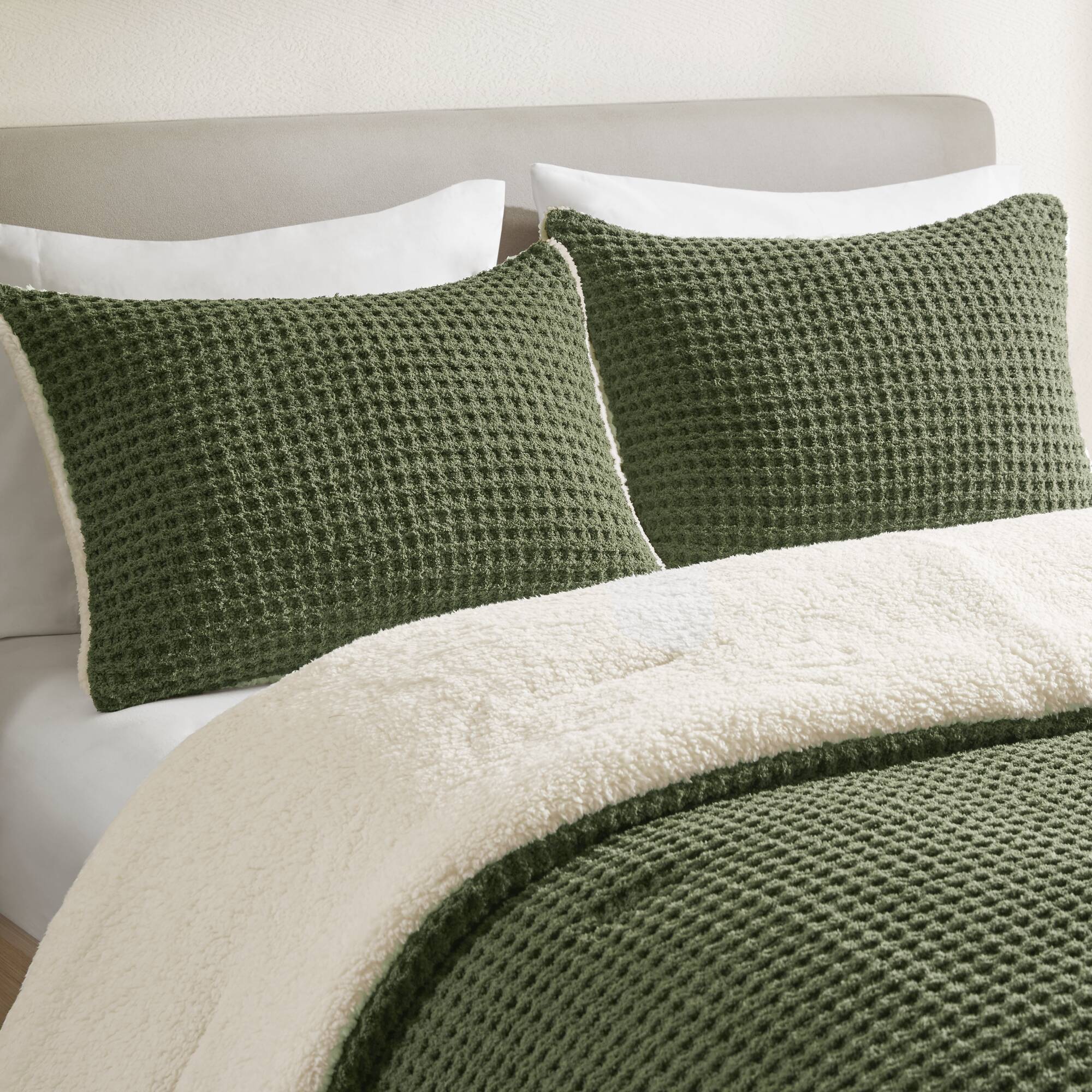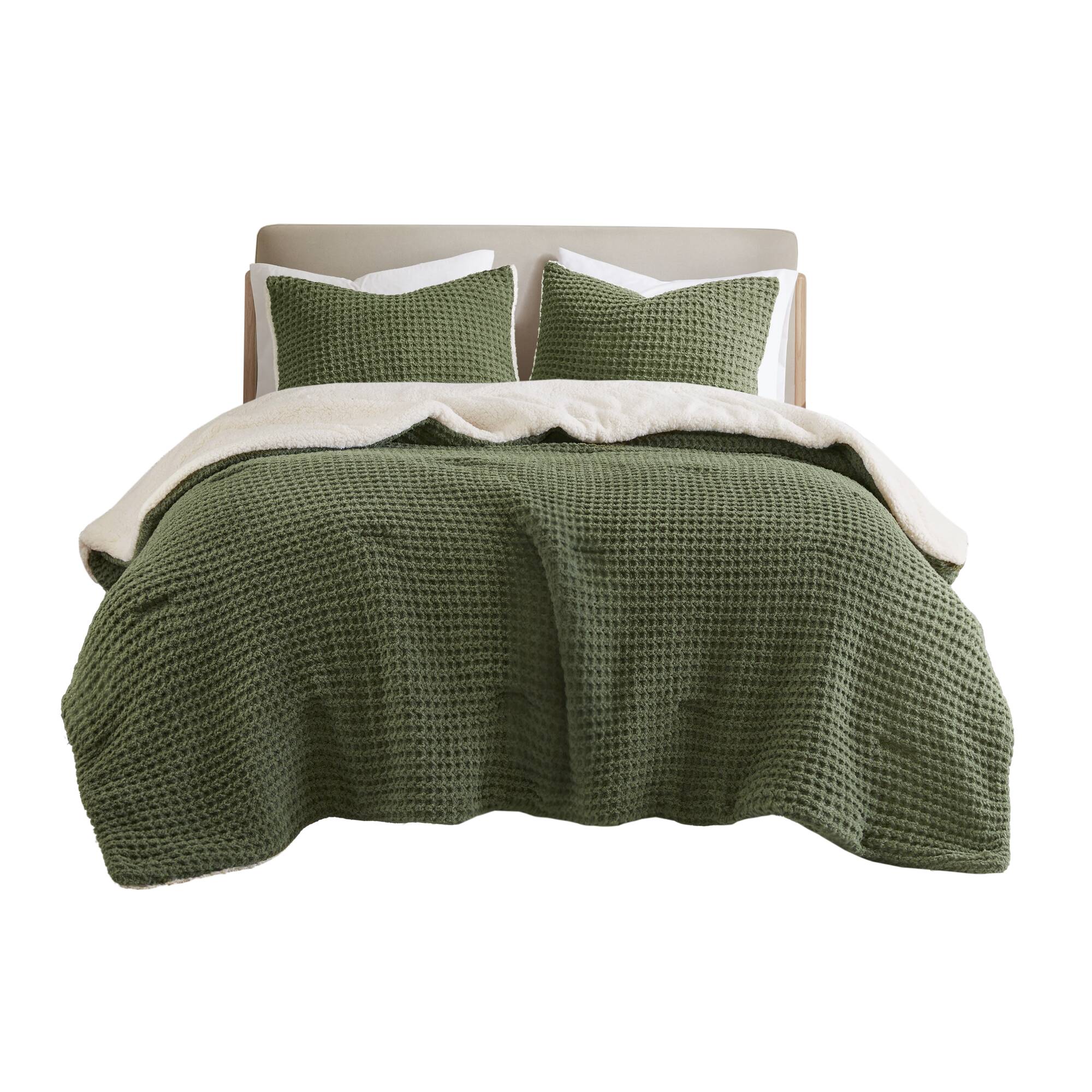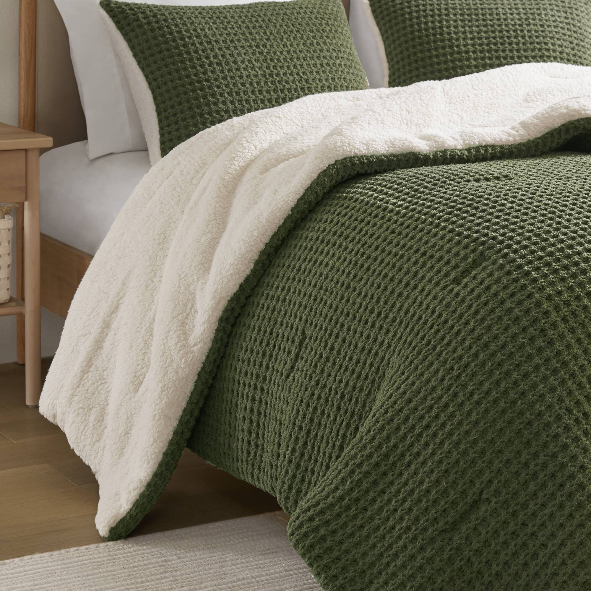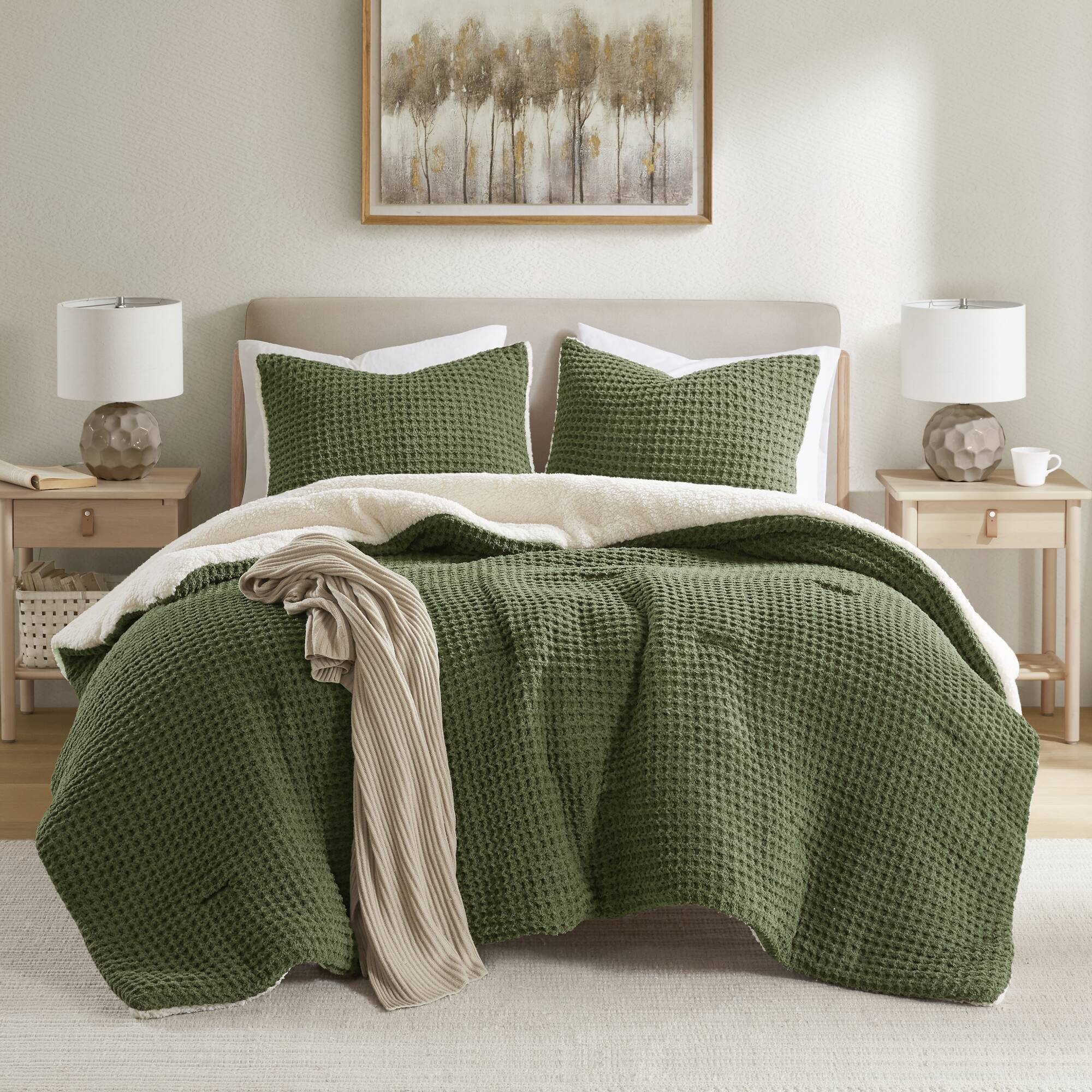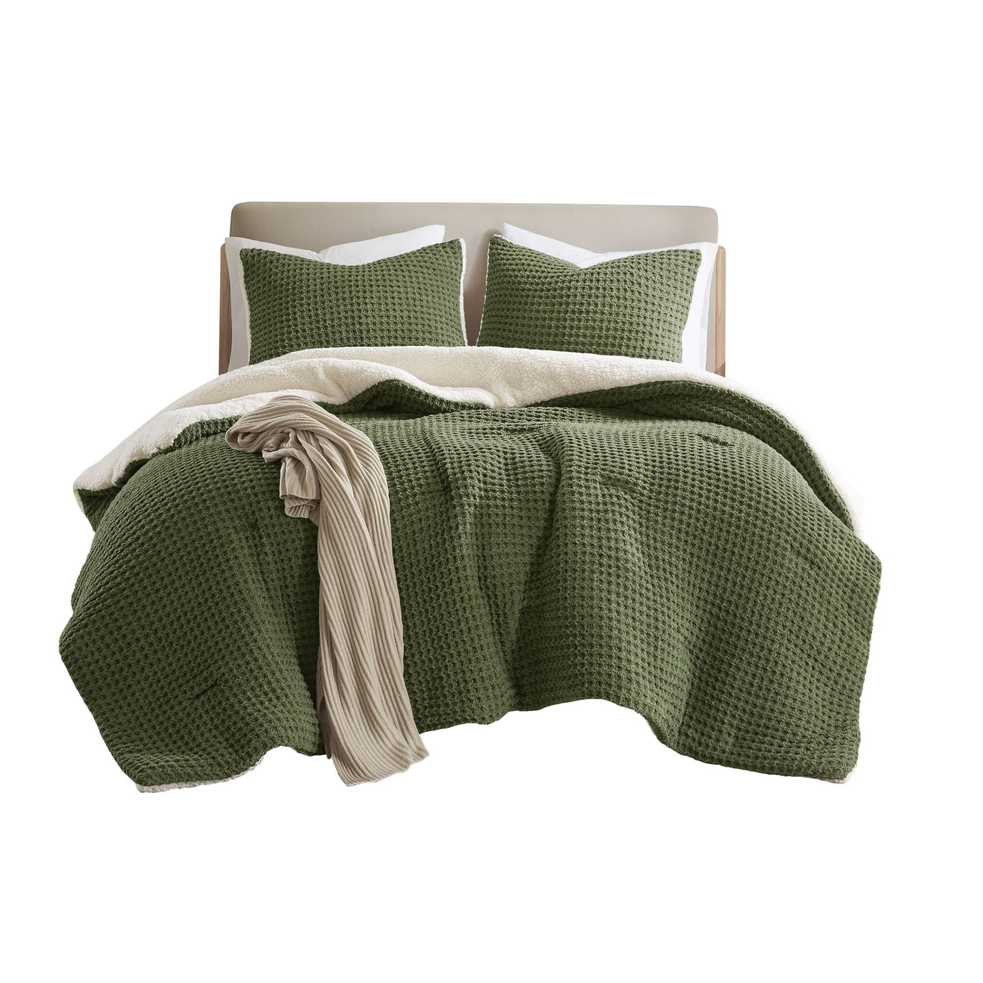 Elevate your bedroom with this cozy twin comforter set in a sophisticated olive tone. Plush waffle-knit chenille on the top pairs with soft ivory sherpa on the reverse for year-round comfort and textural contrast. Thoughtfully constructed with a knife edge and jump-tack stitching, this set delivers a tailored look while the lightweight polyfill adds loft without bulk—ideal for layering or using on its own.