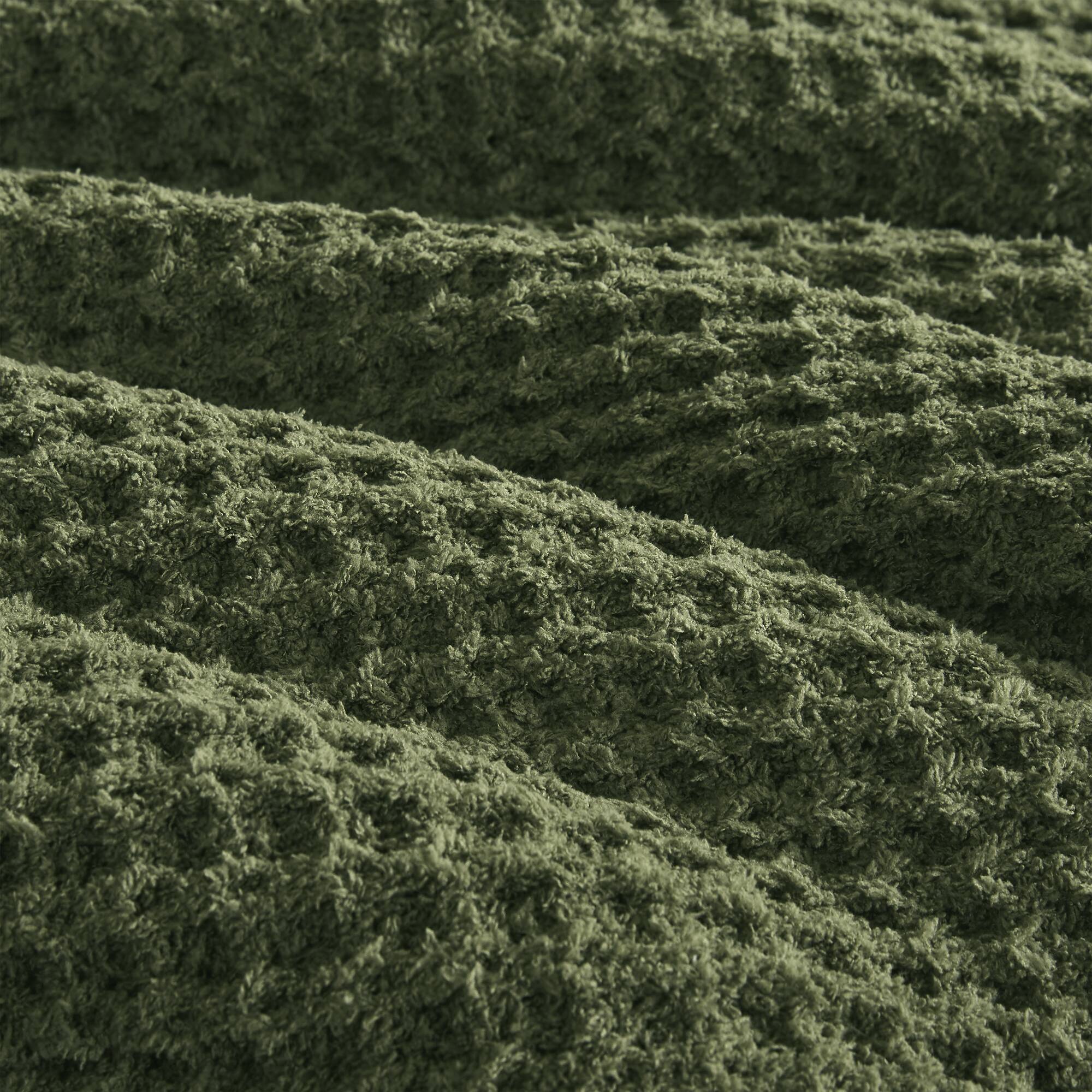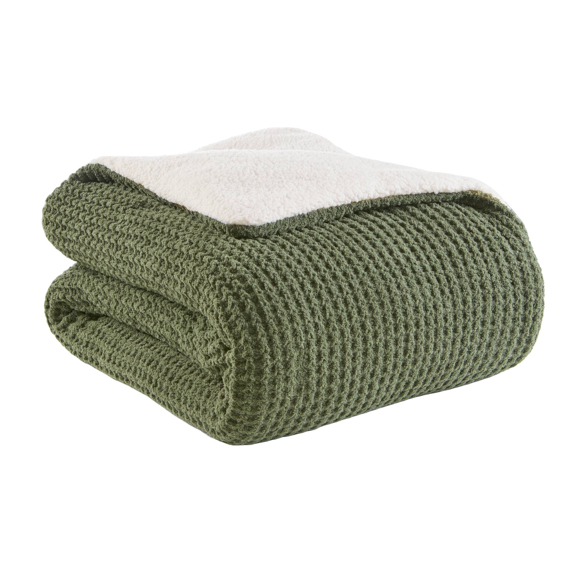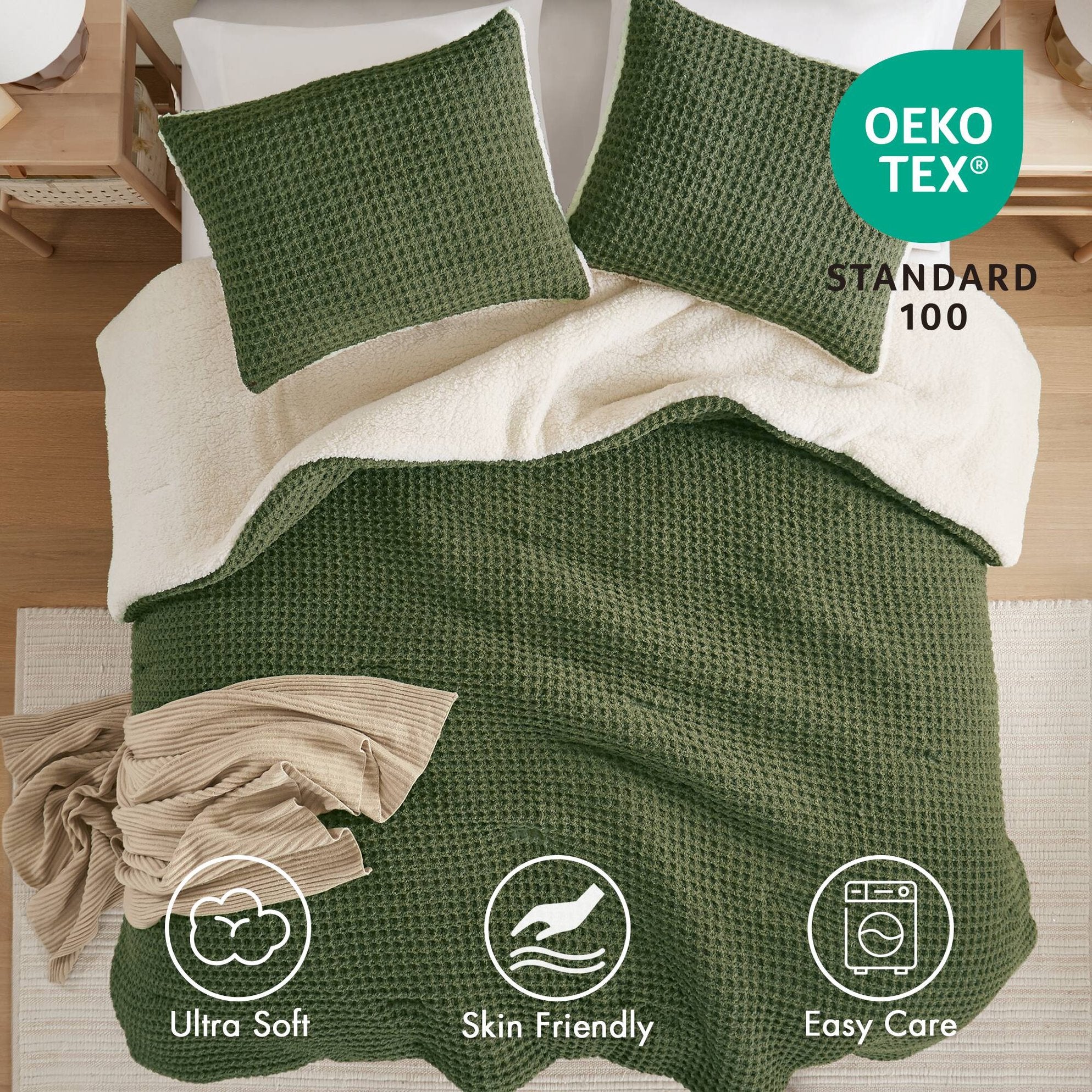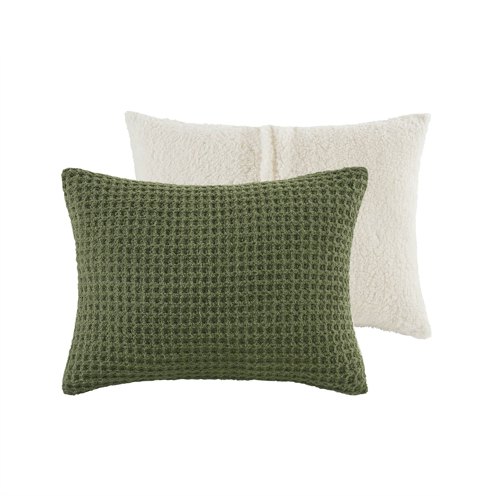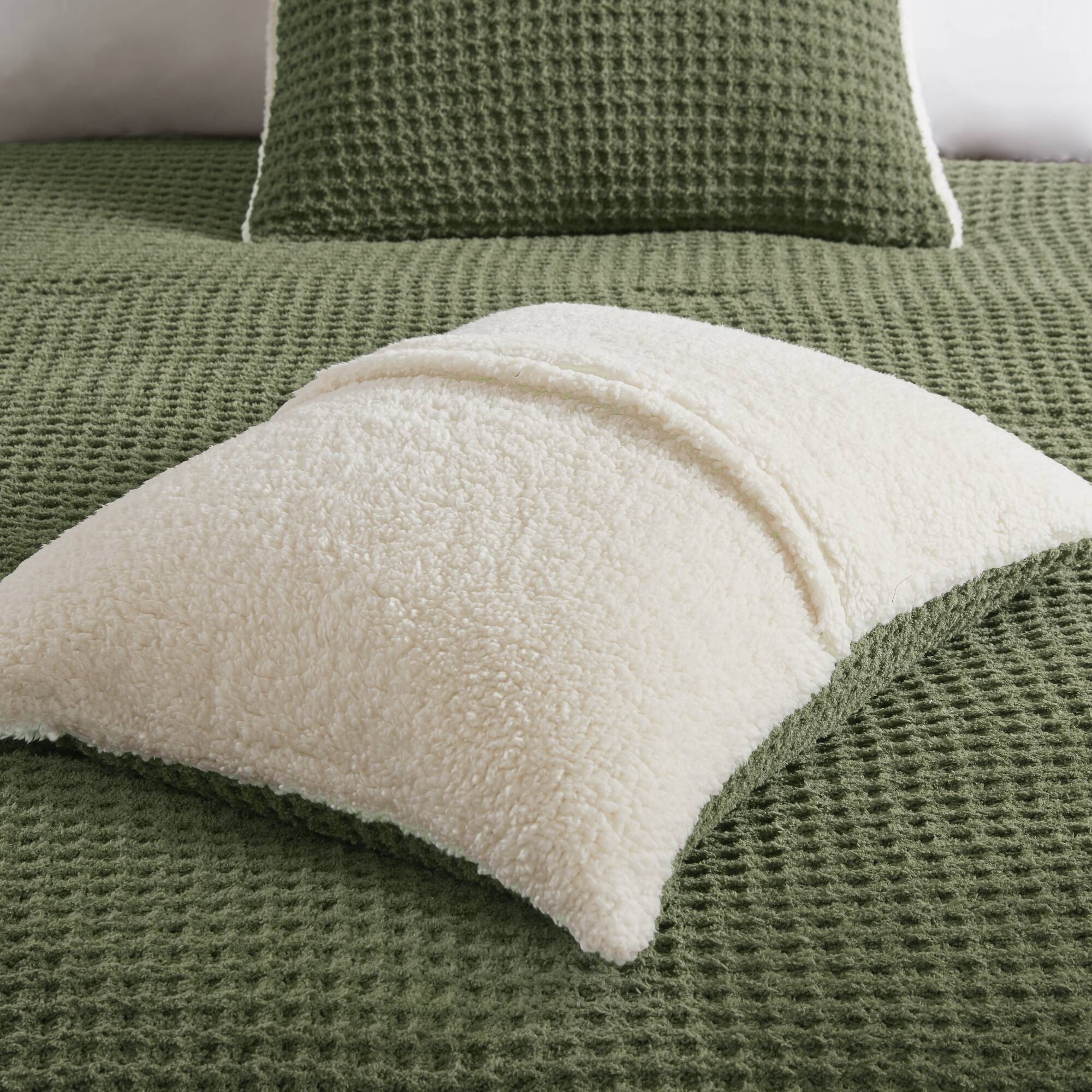Elevate your bedroom with this cozy twin comforter set in a sophisticated olive tone. Plush waffle-knit chenille on the top pairs with soft ivory sherpa on the reverse for year-round comfort and textural contrast. Thoughtfully constructed with a knife edge and jump-tack stitching, this set delivers a tailored look while the lightweight polyfill adds loft without bulk—ideal for layering or using on its own.