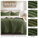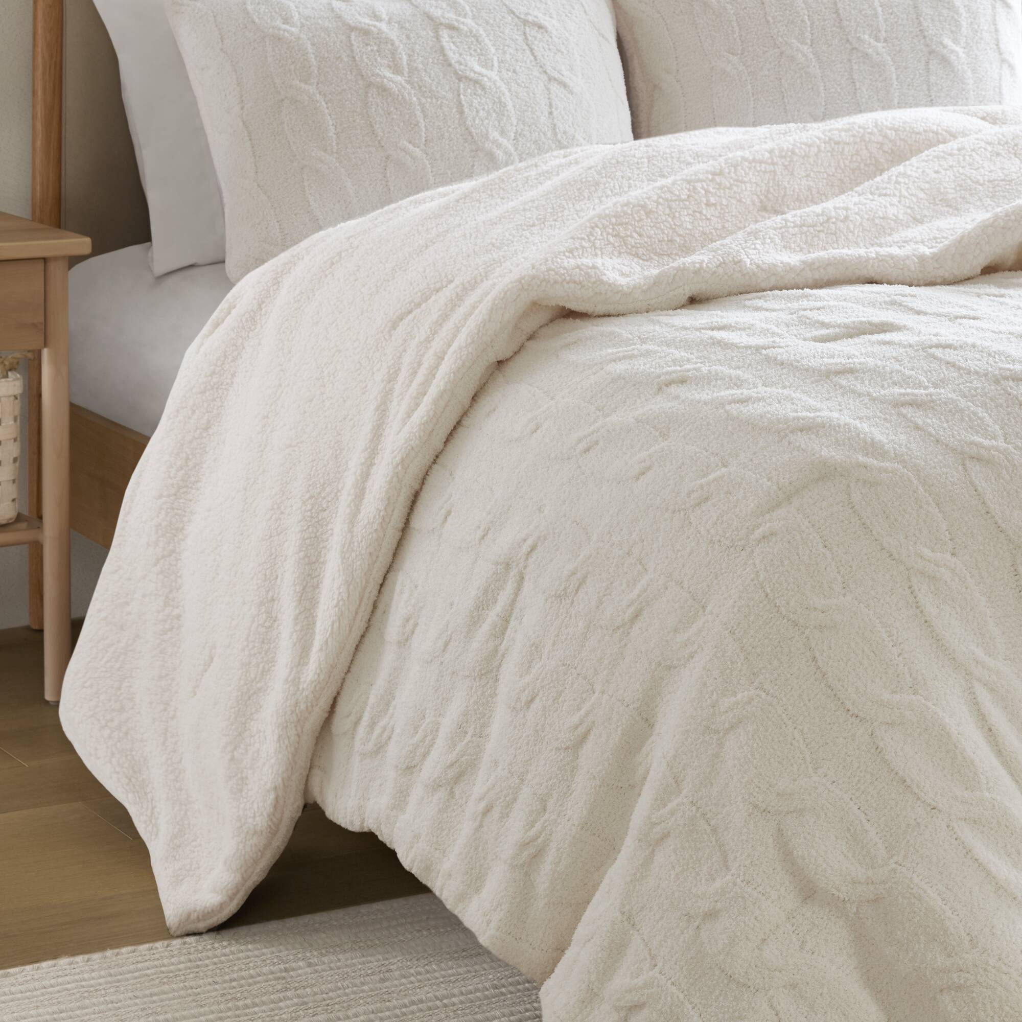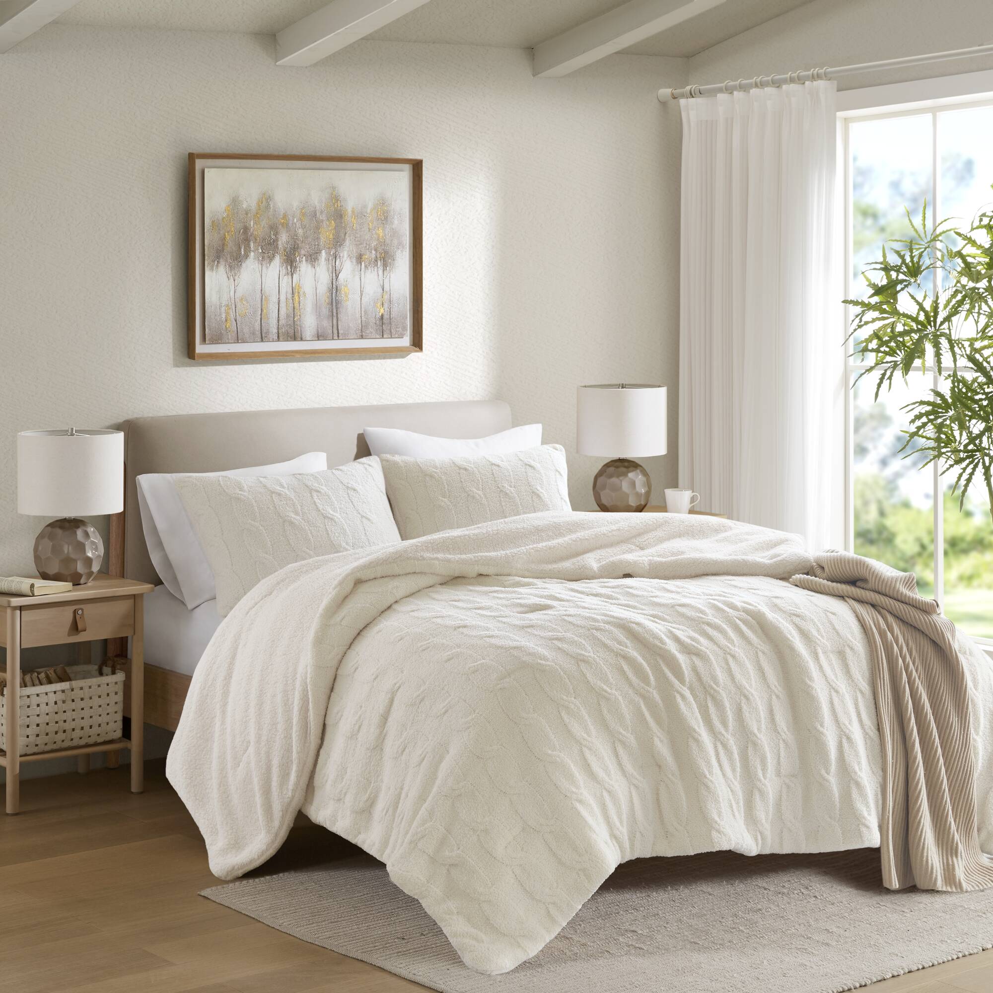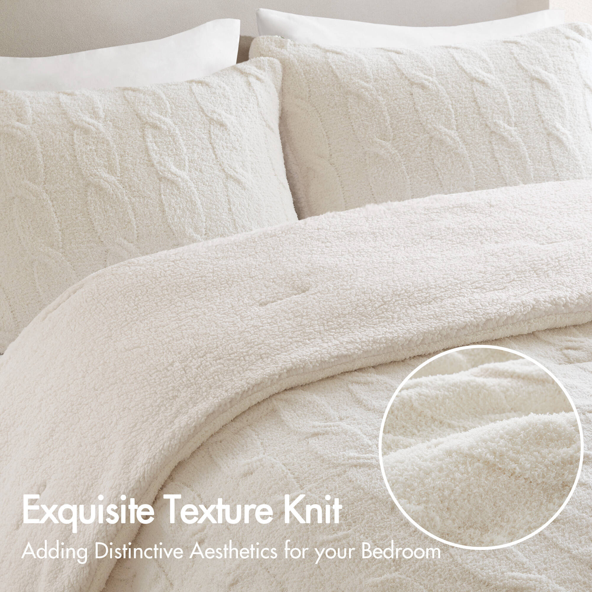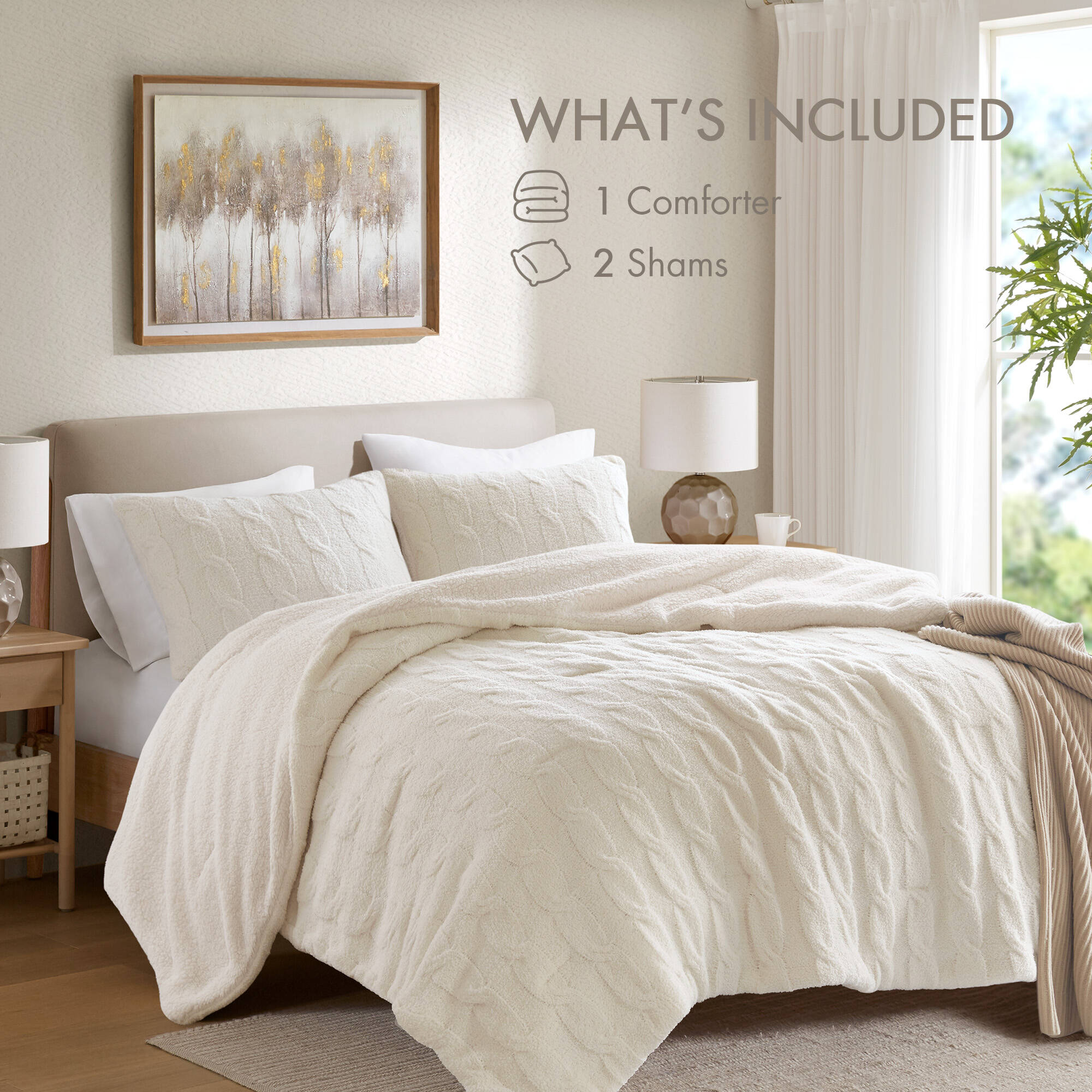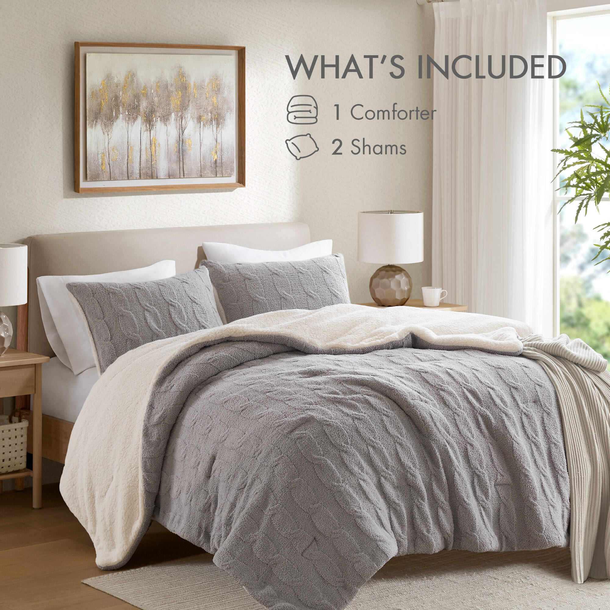 Elevate your bedroom with this cozy twin comforter set in a sophisticated olive tone. Plush waffle-knit chenille on the top pairs with soft ivory sherpa on the reverse for year-round comfort and textural contrast. Thoughtfully constructed with a knife edge and jump-tack stitching, this set delivers a tailored look while the lightweight polyfill adds loft without bulk—ideal for layering or using on its own.