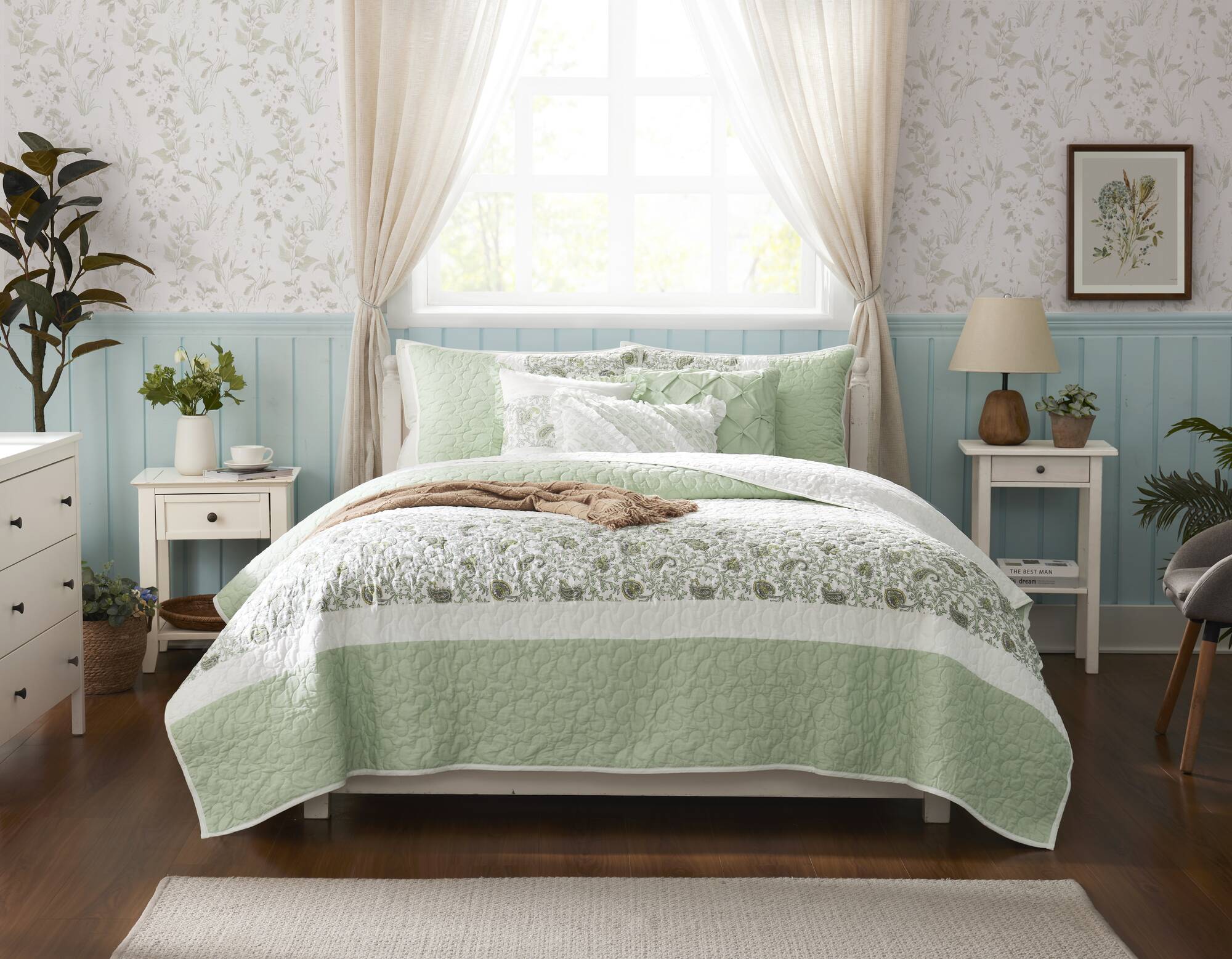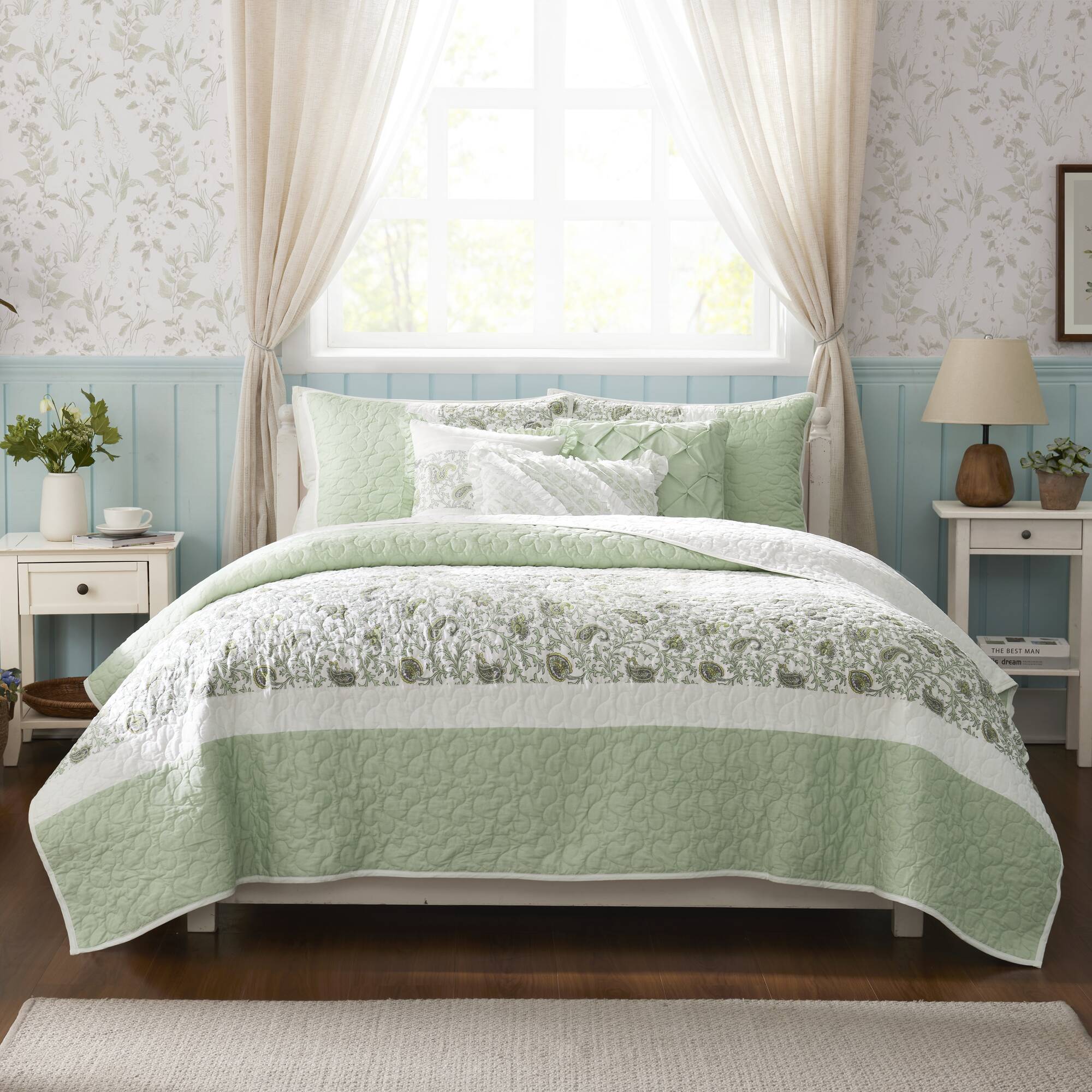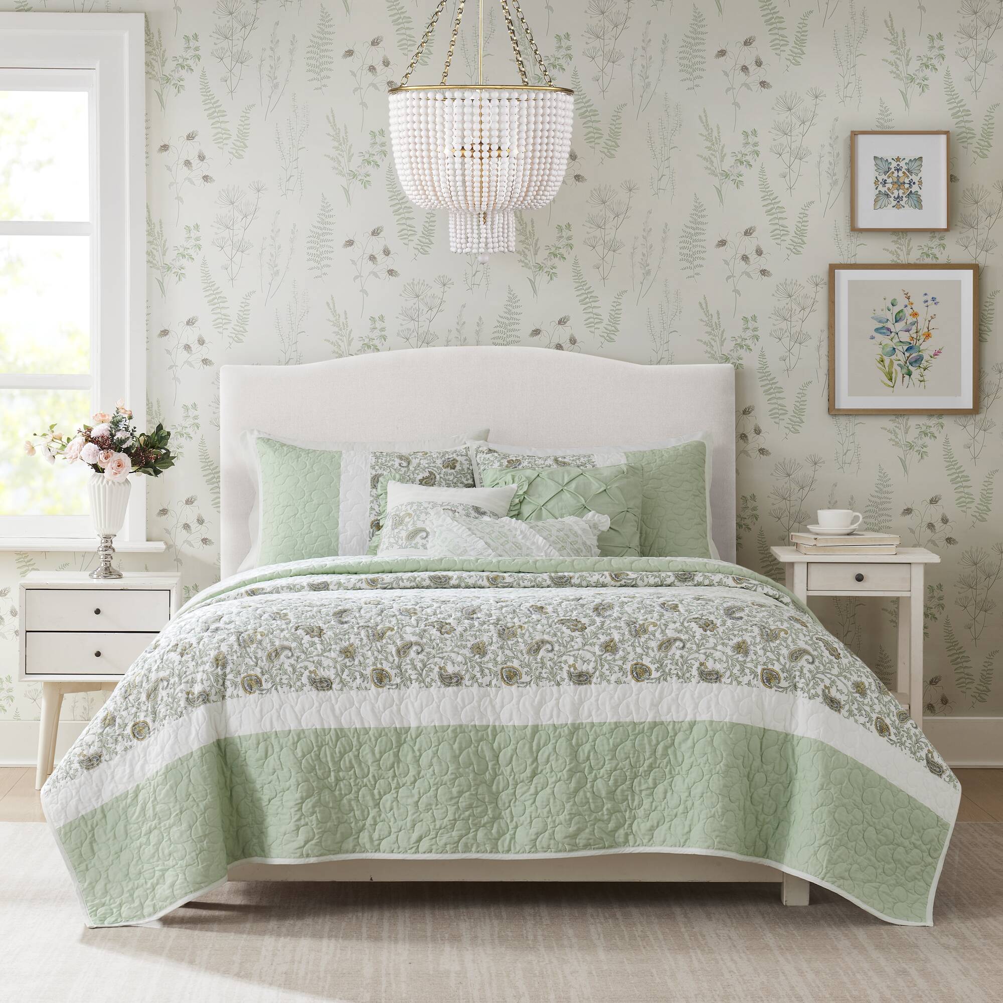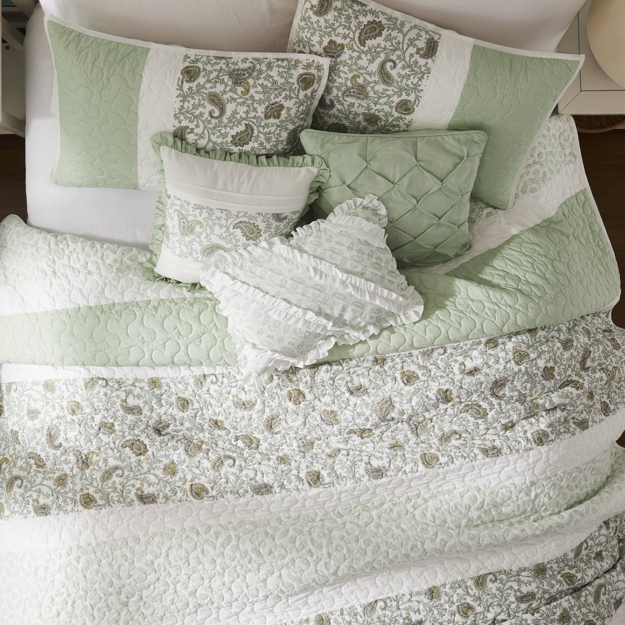 - 【Elegant Floral Design】 The Madison Park Dawn 6-Piece Floral Quilt Set showcases a floral print on cotton percale, with pintucked details, lace taping, and a ruched flange on decorative pillows for a shabby chic, cottage-inspired look.