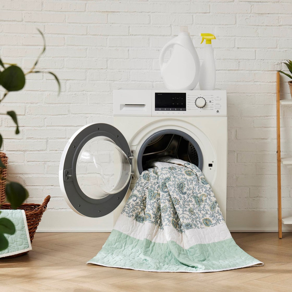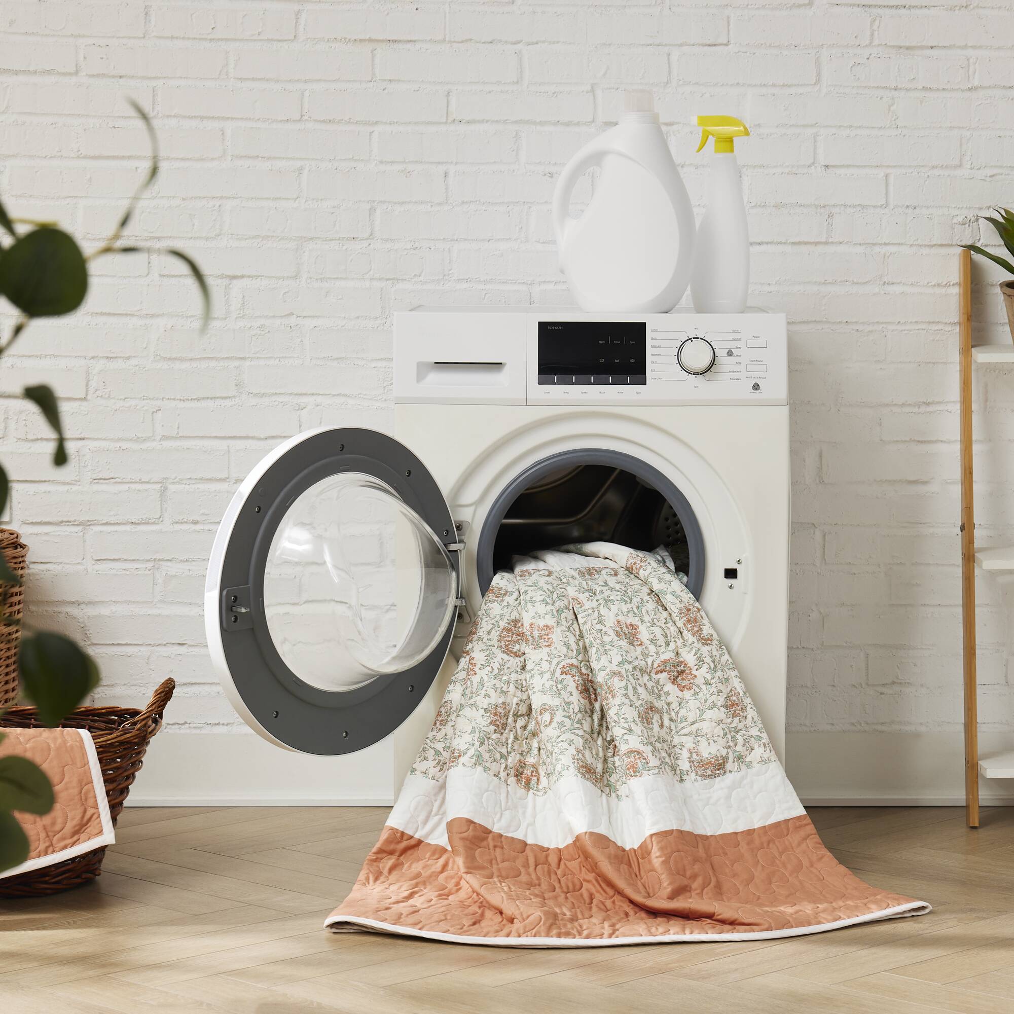 - Materials: Quilt/shams: cotton percale printed face with cotton/polyester construction and 90% cotton filling; decorative pillows: cotton/polyester shell with polyester filling.
