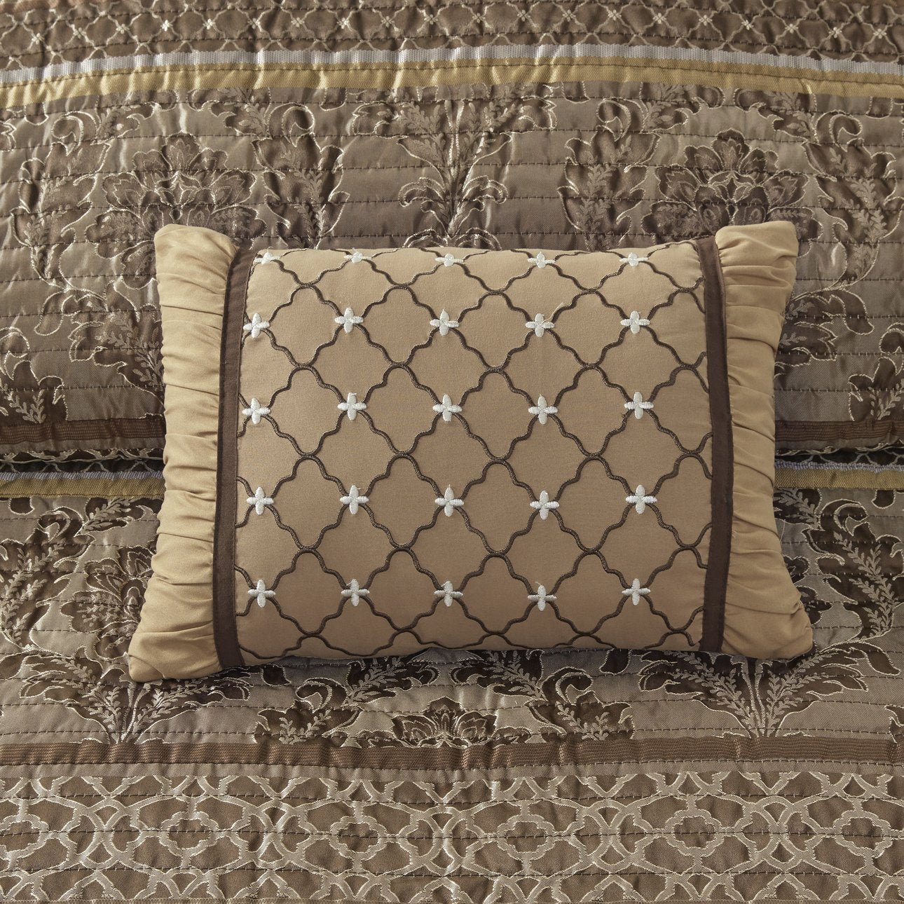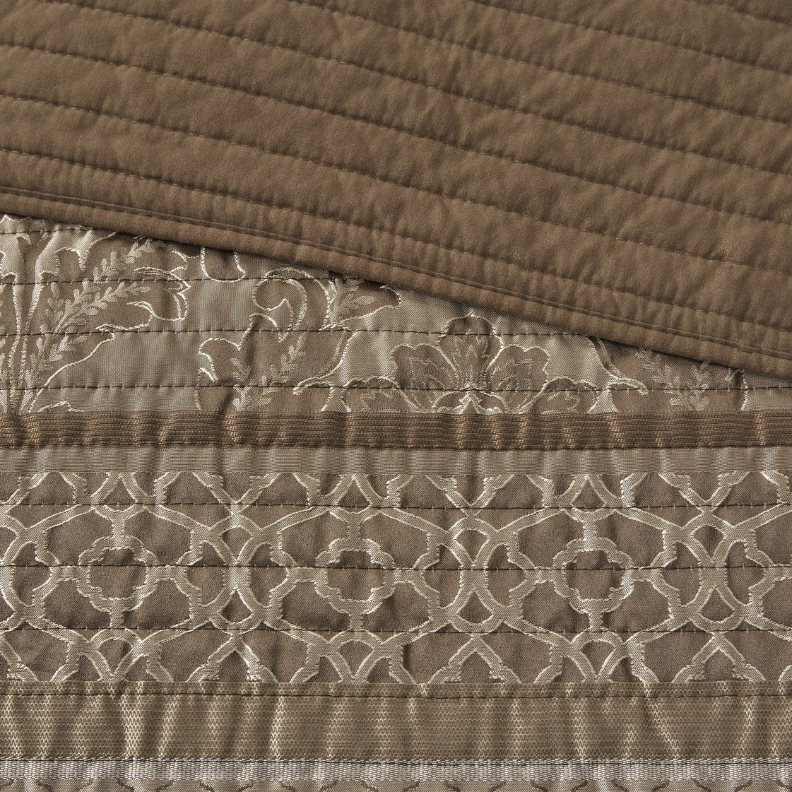Elevate your bedroom with the Bellagio 6-piece reversible quilt set — a sophisticated blend of texture, pattern and warm metallic accents that instantly refreshes your decor. Rich chocolate-brown jacquard is detailed with leaf, stripe and ironwork motifs highlighted by ivory stitching and gold accents, while three coordinated decorative pillows add layered depth and tailored finishing touches. The reversible design gives you two styling options for easy updates.