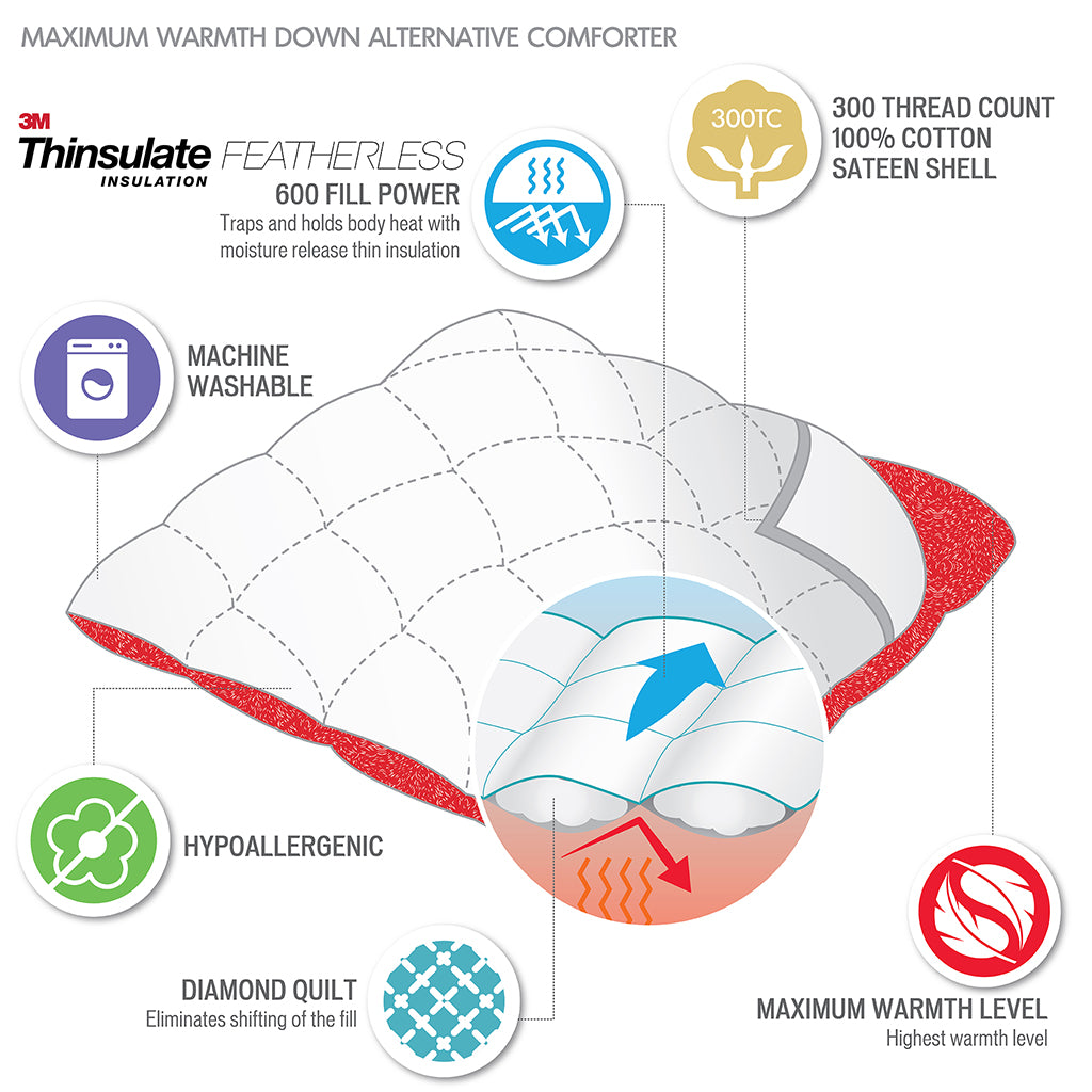 - Thinsulate fill weight twin 36 oz, full/queen 49 oz, and king 59 oz