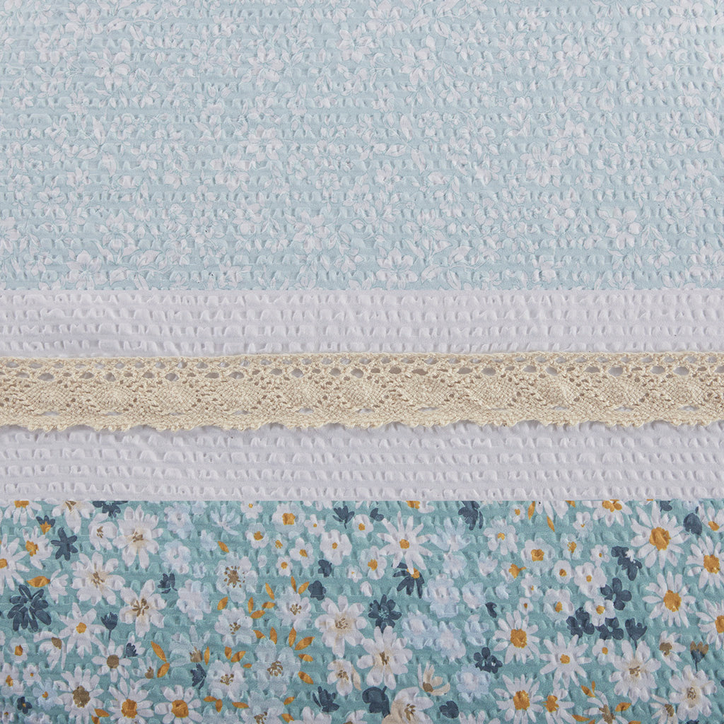 - Materials: Seersucker microfiber face with printed motifs and lace accents; solid microfiber reverse; 100% polyester fill and pillow construction.