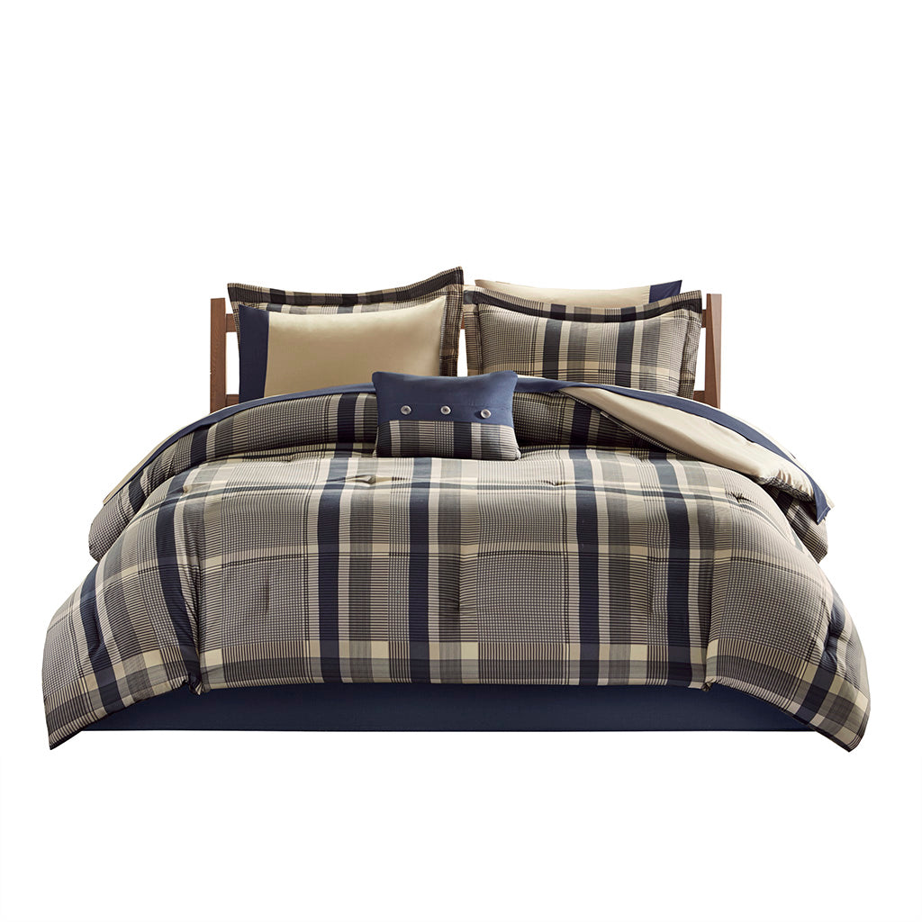 Bring a tailored, cozy look to your bedroom with this Twin XL plaid comforter ensemble. Designed in a modern navy and taupe palette, the set pairs a soft brushed microfiber comforter and coordinating shams with crisp sheets, a decorative pillow, and a tailored bedskirt for a polished, layered appearance. OEKO-TEX® certification ensures the fabrics are free from harmful substances, while the brushed microfiber construction delivers a soft, warm hand and easy-care durability.