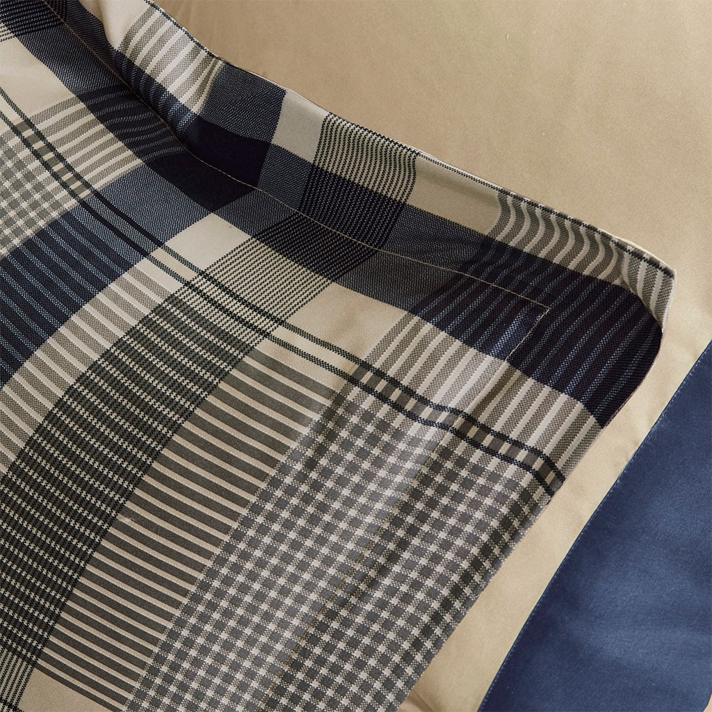 - Style details: classic plaid pattern in navy and taupe for versatile casual or transitional décor; matching navy flange adds a refined accent to the sheet set.