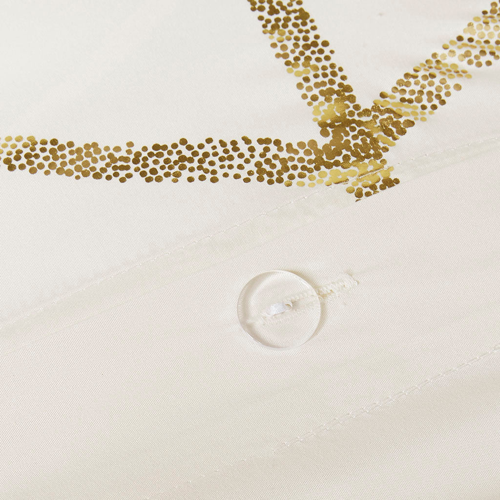 Refresh your bedroom with a glamorous yet versatile bedding ensemble that combines metallic accents, soft microfiber comfort, and thoughtful construction for easy care and long-lasting wear. The geometric gold metallic print on an ivory ground creates a modern, eye-catching focal point while matching shams and embroidered decorative pillows add layered texture and personality. Antimicrobial treatment helps maintain freshness by reducing odor-causing bacteria, and practical details—button closure and internal corner ties—keep your comforter securely in place.