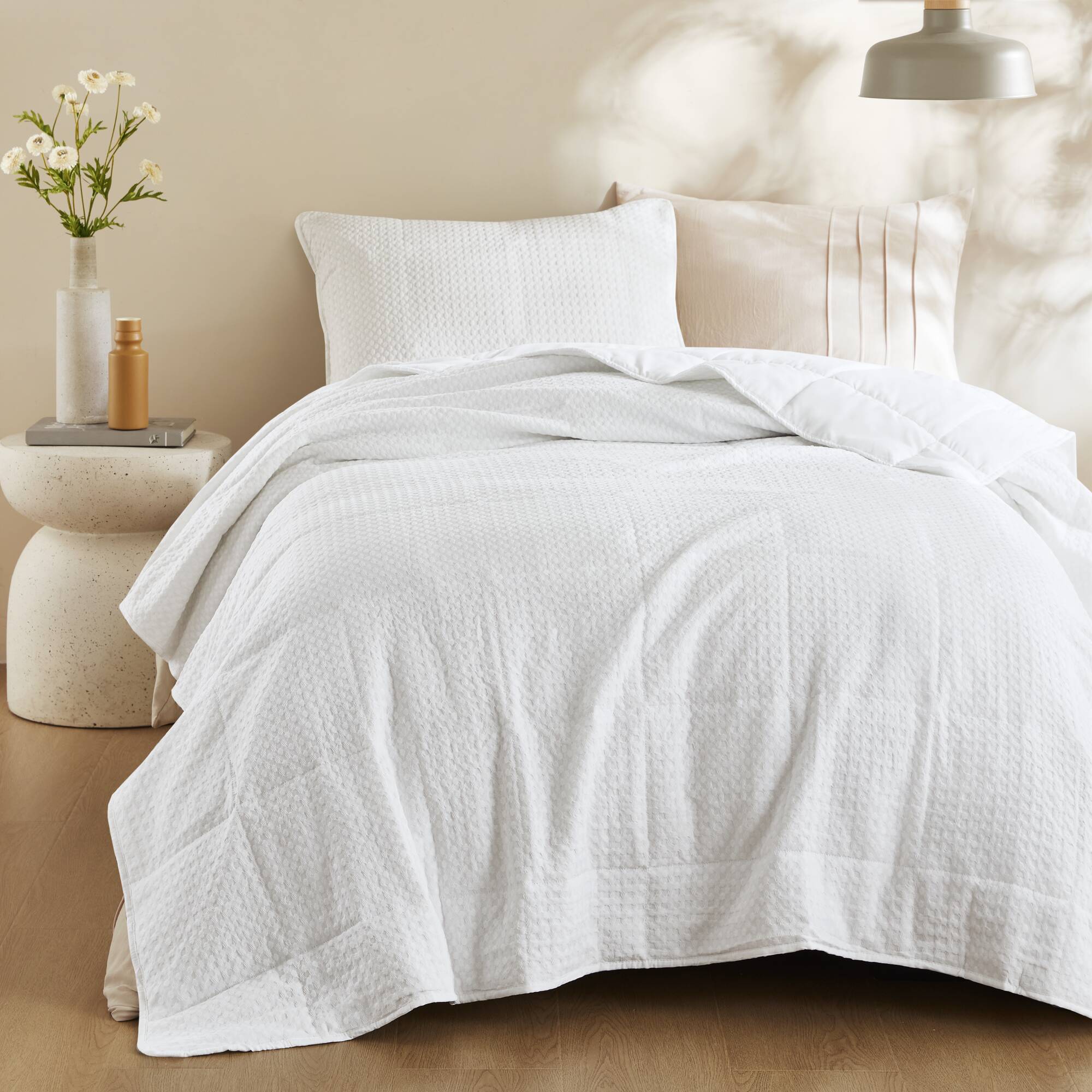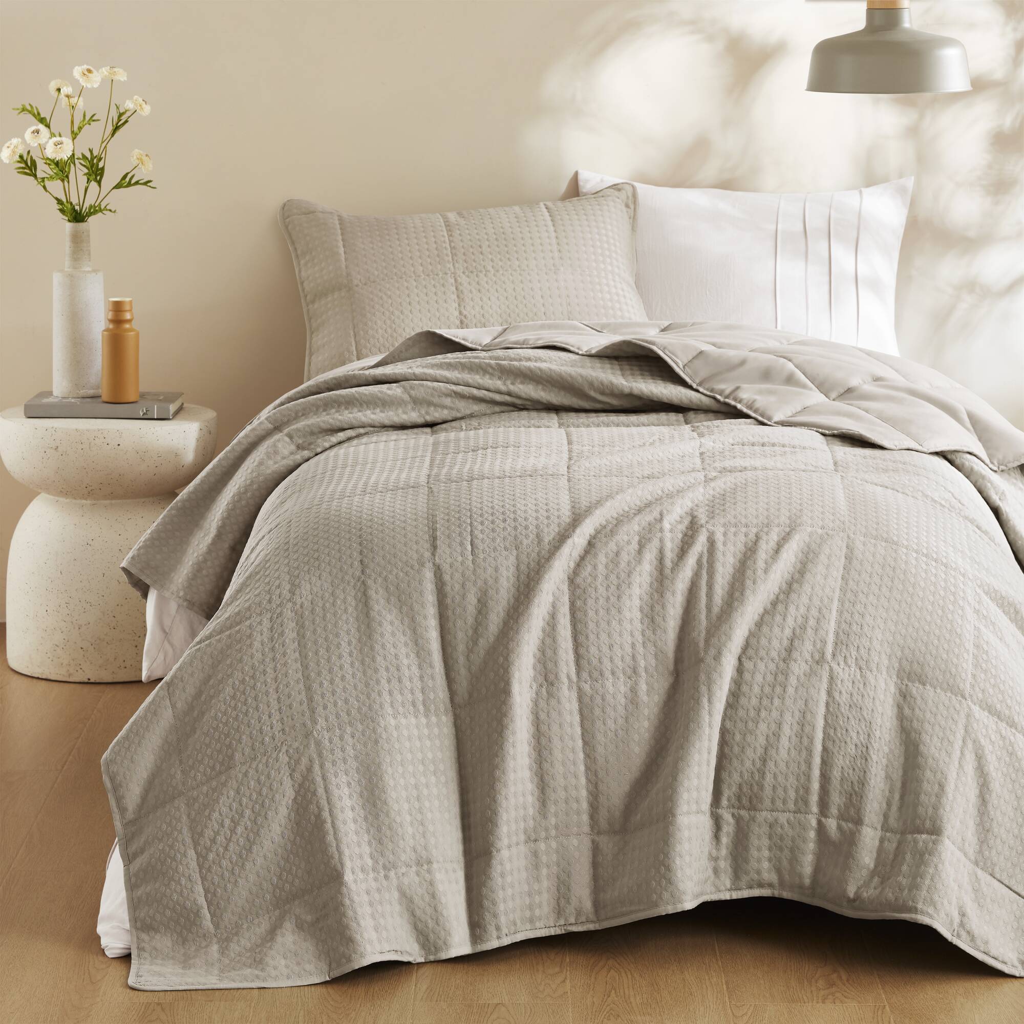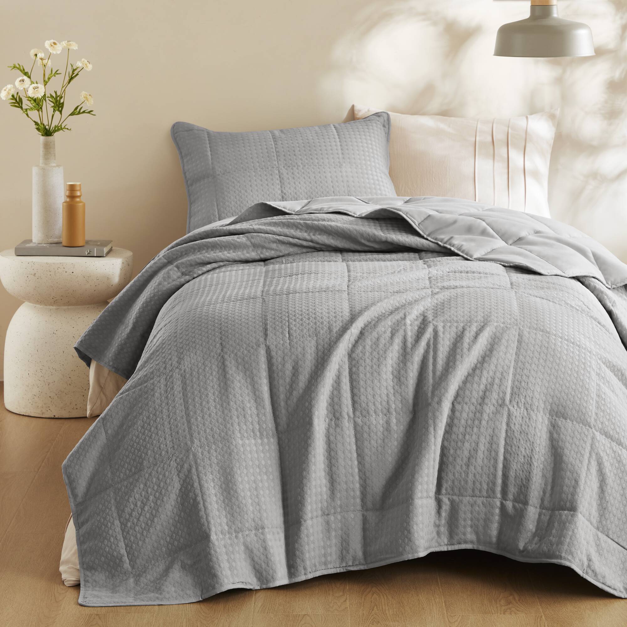 Refresh your bedroom with a refined, contemporary quilt set that blends classic quilting with an elevated waffle-weave texture for a soft, airy feel. Lightweight yet cozy, this set is designed for year-round comfort, offering breathable warmth and a plush hand that enhances both modern and transitional decor.