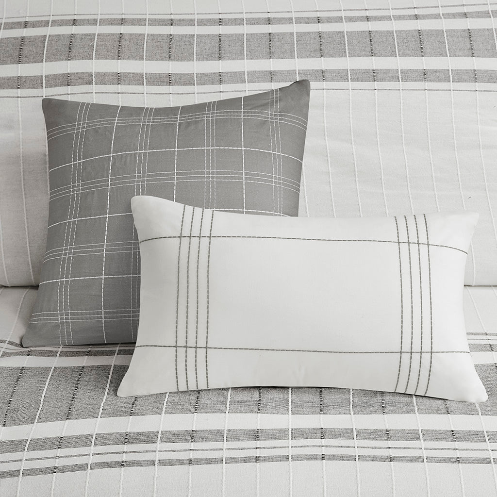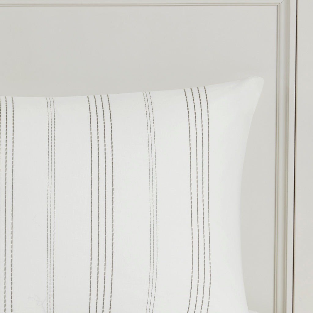 Bring relaxed coastal elegance to your bedroom with this refined 5-piece cotton jacquard duvet set. Crafted in 100% cotton with textured woven stripes and subtle blue accents on a white ground, it blends farmhouse charm with modern comfort. The set includes a duvet cover with secure closures and decorative pillows that add layered texture and hypoallergenic filling for restful, dust-free sleep. OEKO-TEX certified and easy to care for, it’s a stylish, safe, and practical choice for everyday use.