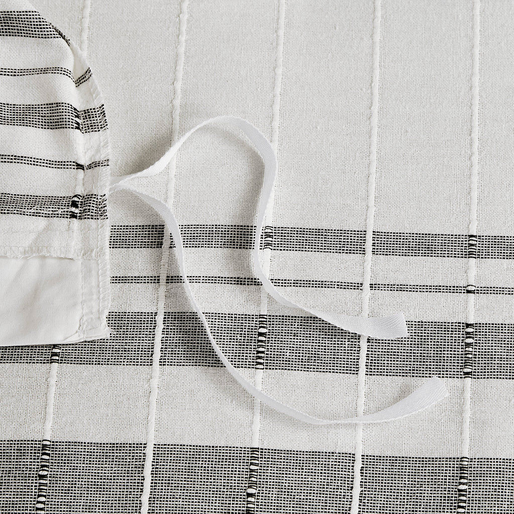 - Design: Vertical textured woven stripes with contrasting horizontal blue stripes on a white ground for a modest farmhouse/cottage look