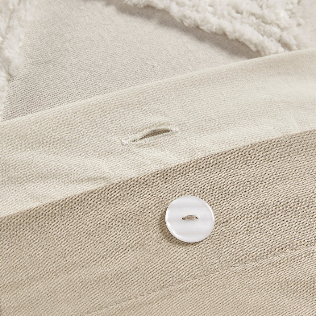 Bring farmhouse charm and cozy texture to your bedroom with this 3-piece cotton duvet cover set featuring chevron chenille tufting and a soft taupe botanical print on a natural white ground. Thoughtfully designed for everyday comfort and easy care, the set creates a layered, cottage-inspired look while offering practical details to keep your comforter in place.