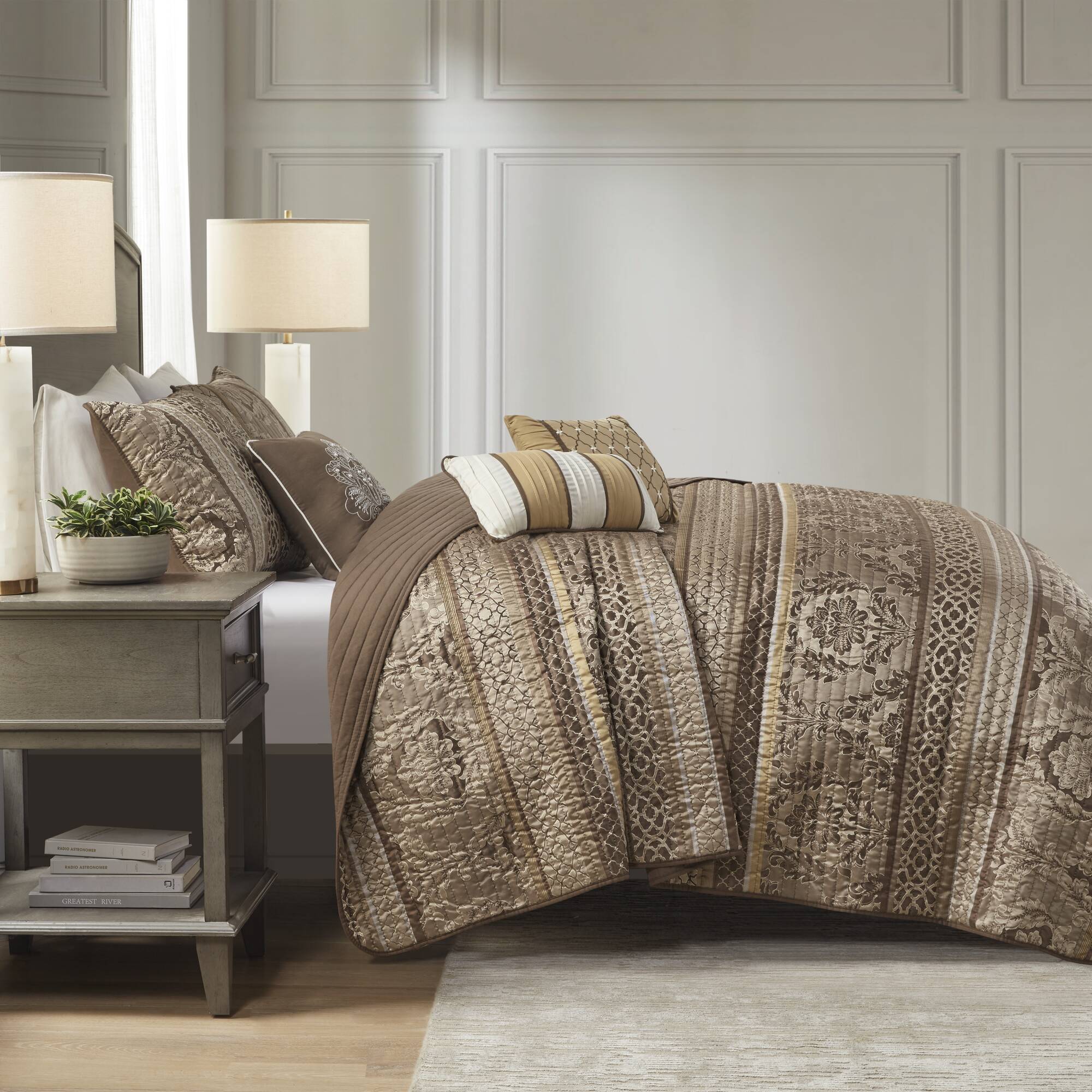 Elevate your bedroom with a richly textured, reversible quilt set that blends classic motifs and modern luxury. Crafted from polyester jacquard, this coordinated six-piece ensemble delivers instant sophistication with layered patterns, elegant stitching, and complementary decorative pillows for a finished, hotel-quality look.