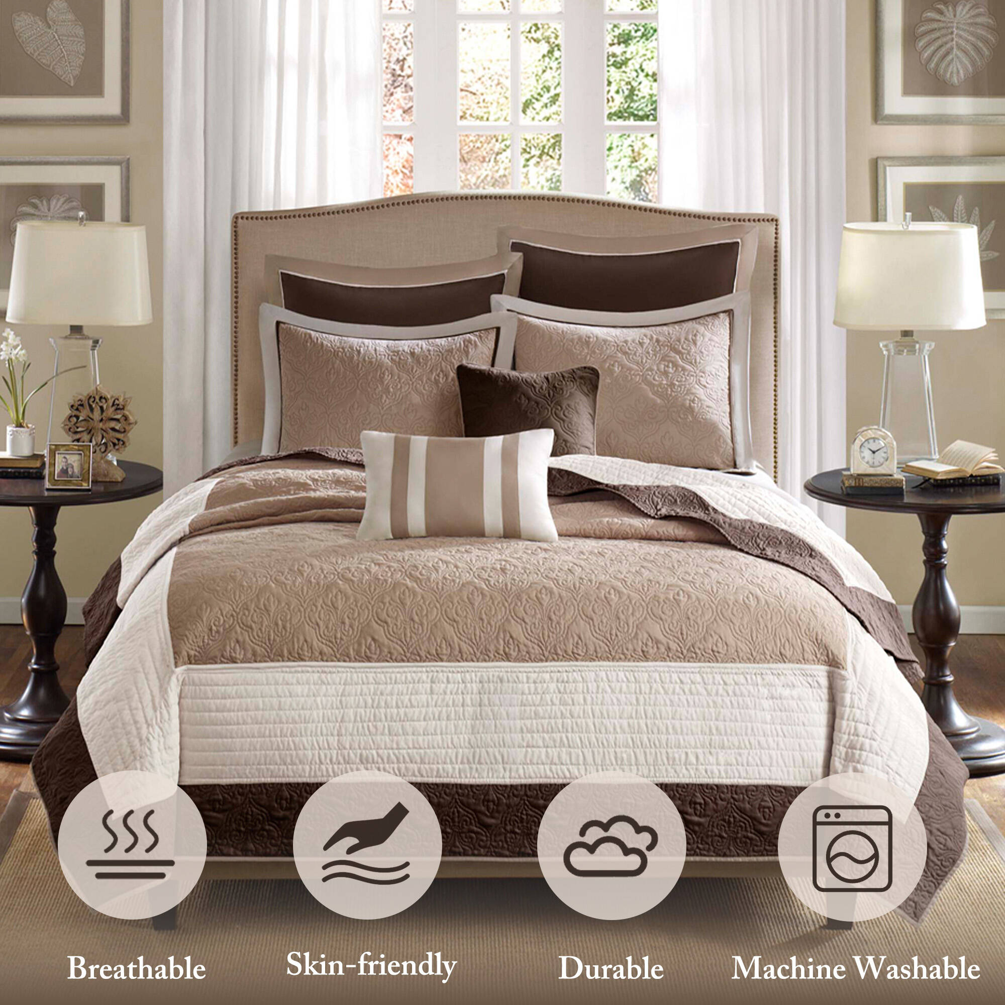Elevate your bedroom with a refined, hotel-inspired look using this 7-piece quilt ensemble. Combining timeless Damask quilting with a transitional modern aesthetic, the set provides year-round comfort and polished style—perfect for creating a curated, inviting sleep space with minimal effort.