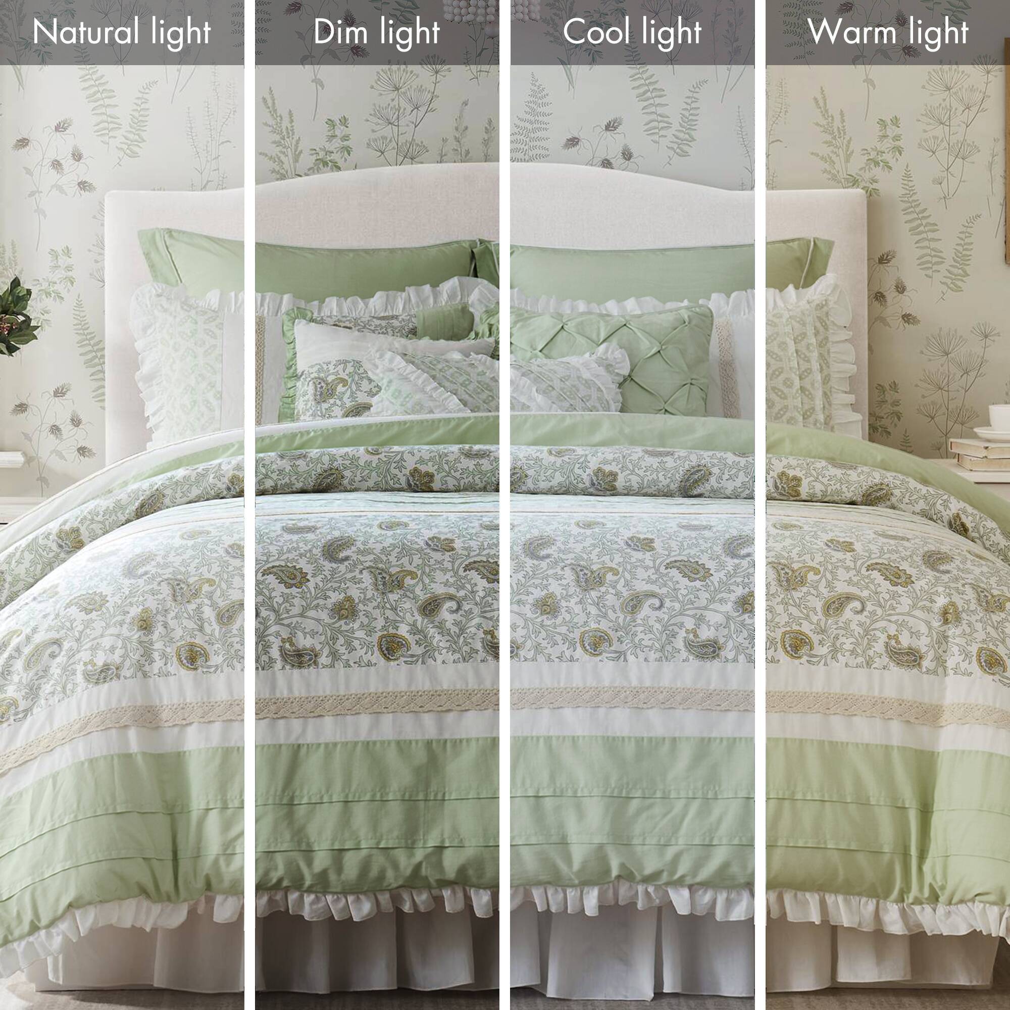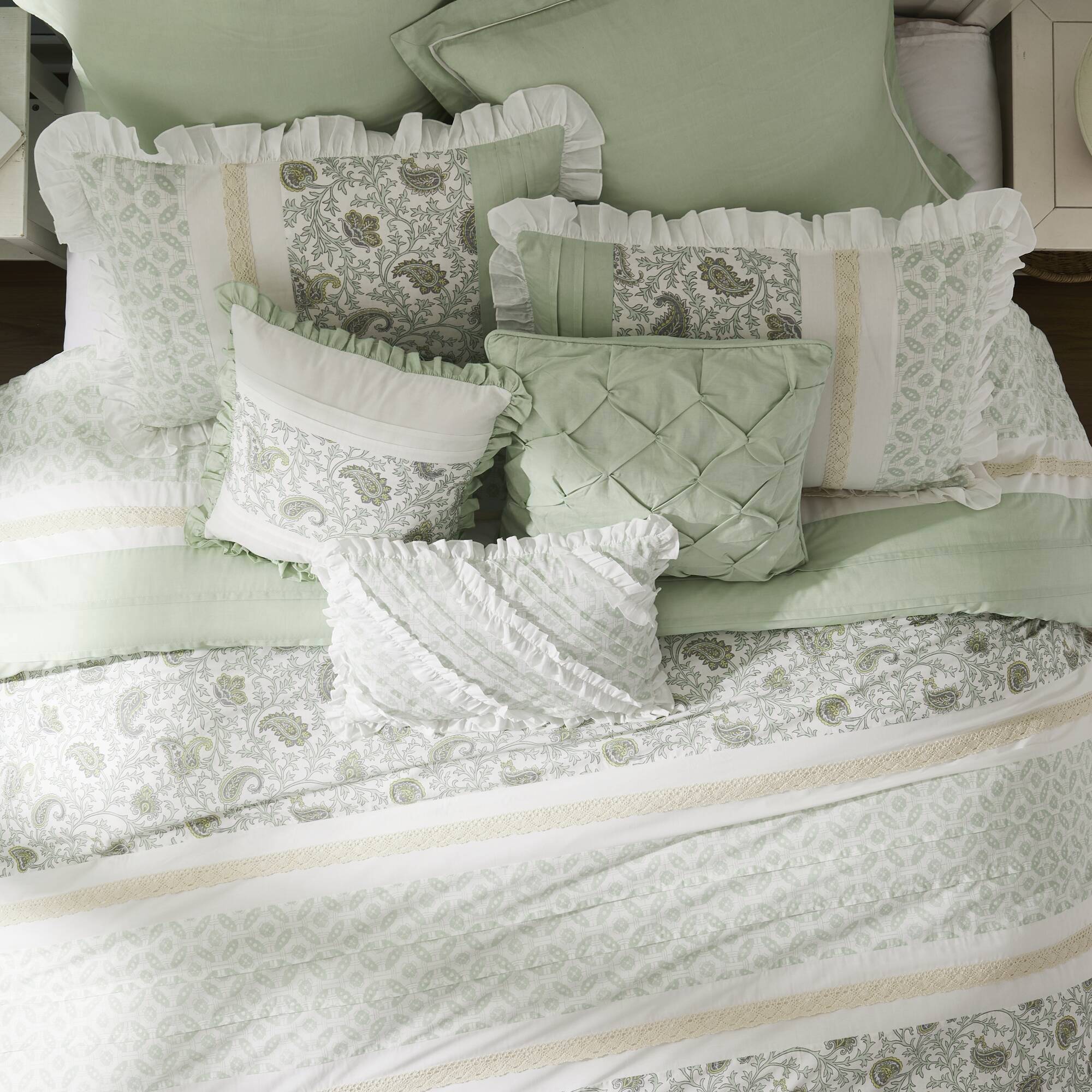 - Design details: Elegant floral pattern with pintucking, lace taping, and ruched flange for cottage-inspired texture and visual depth.