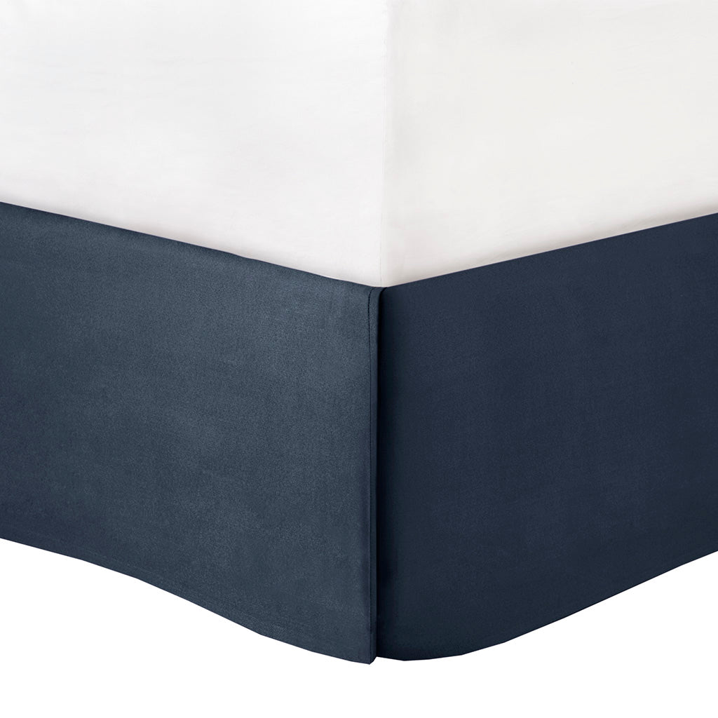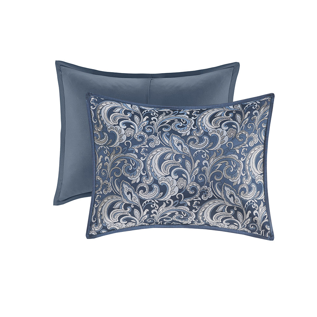 - Design & Materials: Navy, grey, and silver jacquard paisley comforter with a solid navy border; solid navy bedskirt and Euro shams with 2" flanges; decorative pillows feature embroidery and pleating details. Hypoallergenic polyester fill is dustproof and allergen-free.
