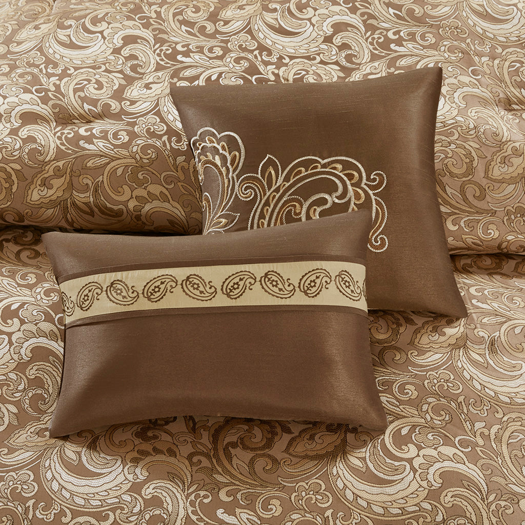 - Complete 24-Piece Set: Comforter, matching pillow shams, solid Euro shams, bed skirt, 4 decorative pillows, 4-piece sheet set, 4 window curtains, 2 paisley valances, and 2 solid tiebacks.