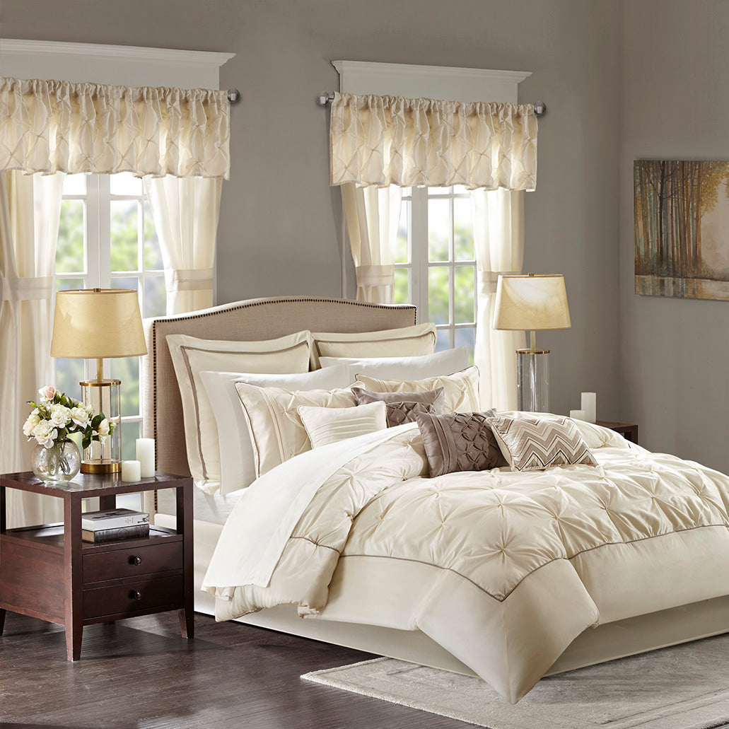 - Complete 24-piece set: Comforter, microfiber sheet set, bed skirt, shams, Euro shams, decorative pillows, window panels, tiebacks, and tufted valances — everything needed for a cohesive bedroom update.