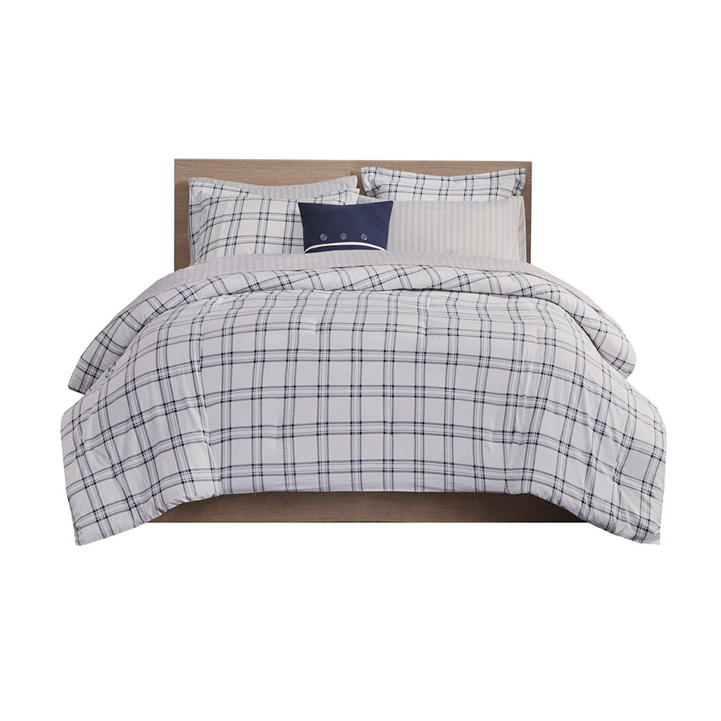 - Reversible Comforter: Navy plaid print on the face and white plaid print on the reverse for two coordinated looks in one.