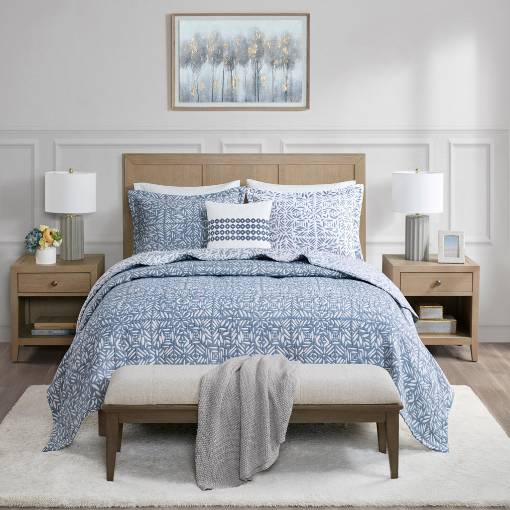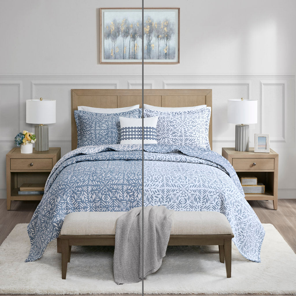 - Reversible design: Two coordinating blue-and-white colorways—flip the quilt to change the bedroom mood without buying a new set.