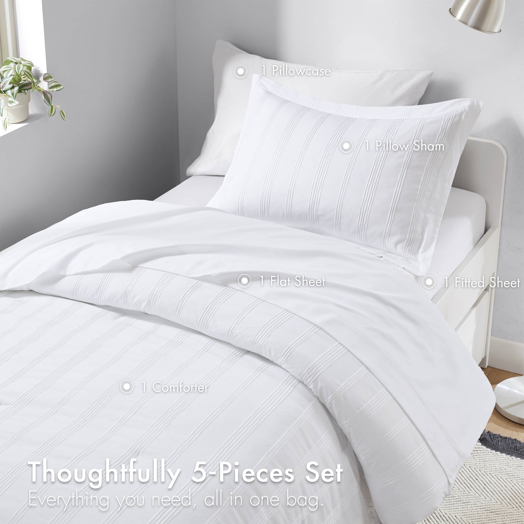 Refresh your bedroom with the Logan Set — a modern, minimalist bedding collection that pairs clean lines with subtle texture for an effortlessly refined look. The woven stripe adds a soft dimensional accent while the brushed microfiber reverse ensures a cozy, lived-in feel. Thoughtfully constructed for everyday comfort, durability, and easy care, this set is ideal for dorms, guest rooms, first homes, or anytime you want a polished, low-fuss bed.