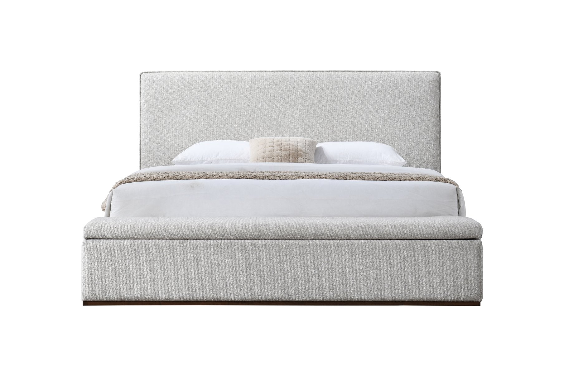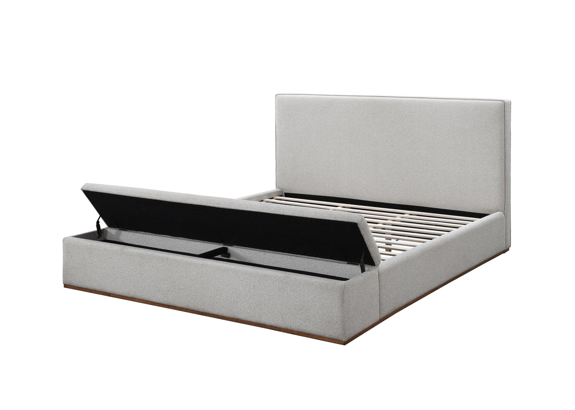 Transform your bedroom into a calm, organized retreat with this beige linen Eastern King bed featuring built-in storage. Combining clean modern lines, durable construction, and soft upholstery, it delivers both style and function—no box spring required. The neutral beige linen makes it easy to pair with a variety of decor while the walnut-toned rubberwood legs add a warm, natural touch.