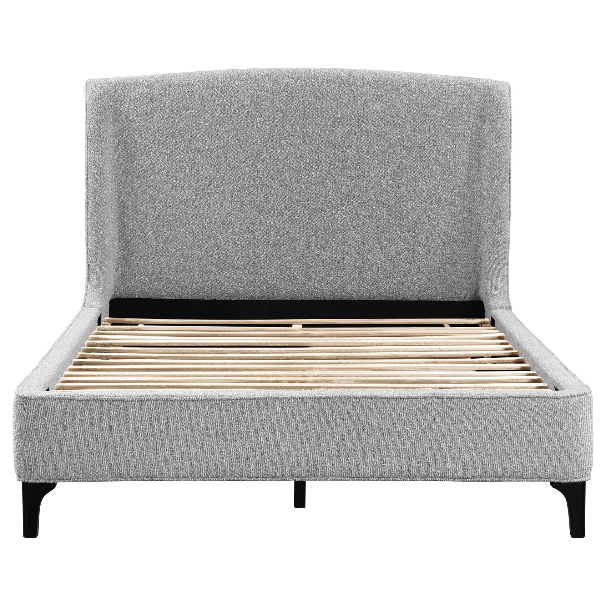 Bring contemporary comfort and understated elegance to your bedroom with this upholstered platform bed. Its gently curved headboard and footboard, wrapped in soft light-grey fabric, create a welcoming focal point while the low-profile silhouette and splayed bracket feet introduce subtle retro charm. Designed for both style and everyday function, the bed provides supportive slat construction (no box spring required) and a clean, versatile look that pairs easily with modern or transitional décor.