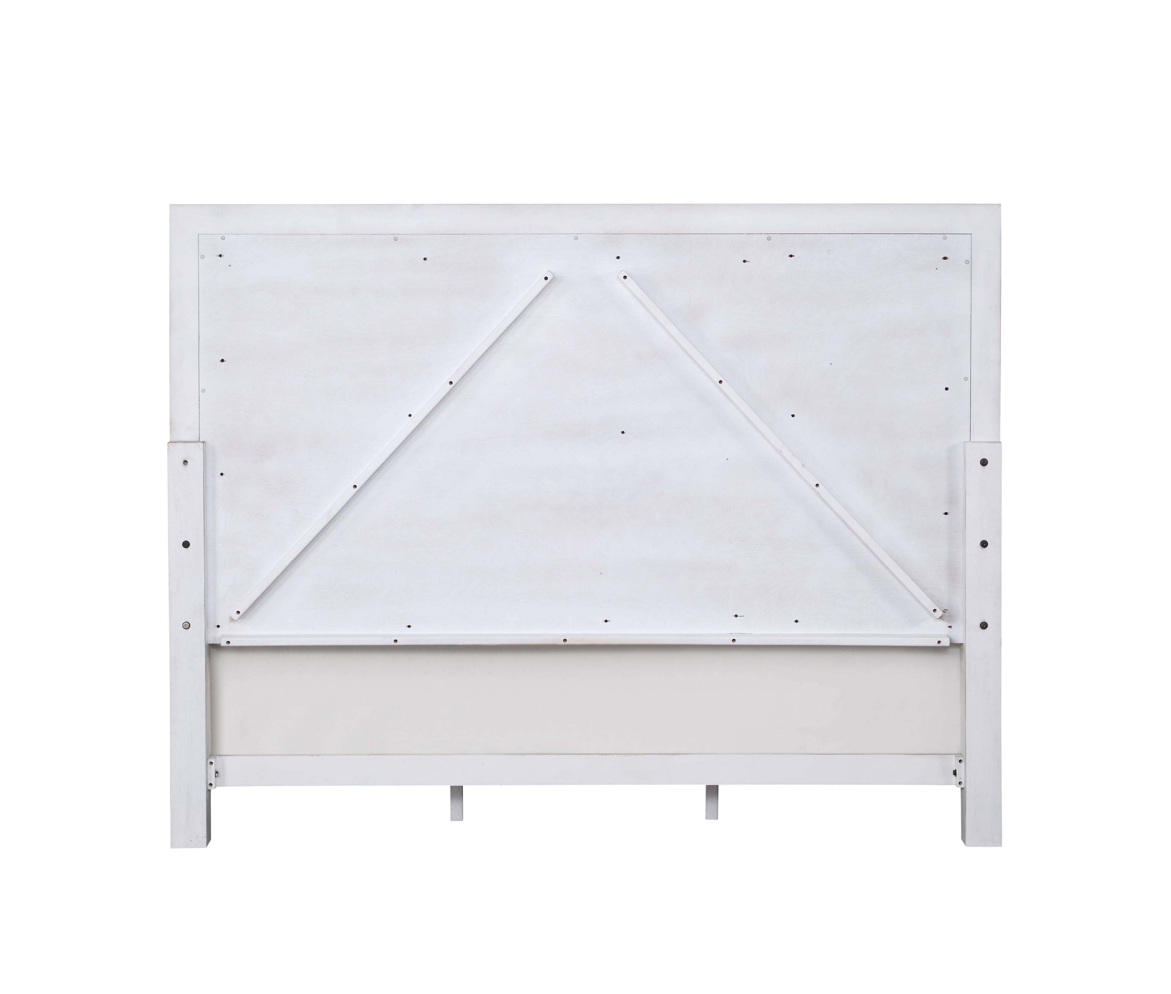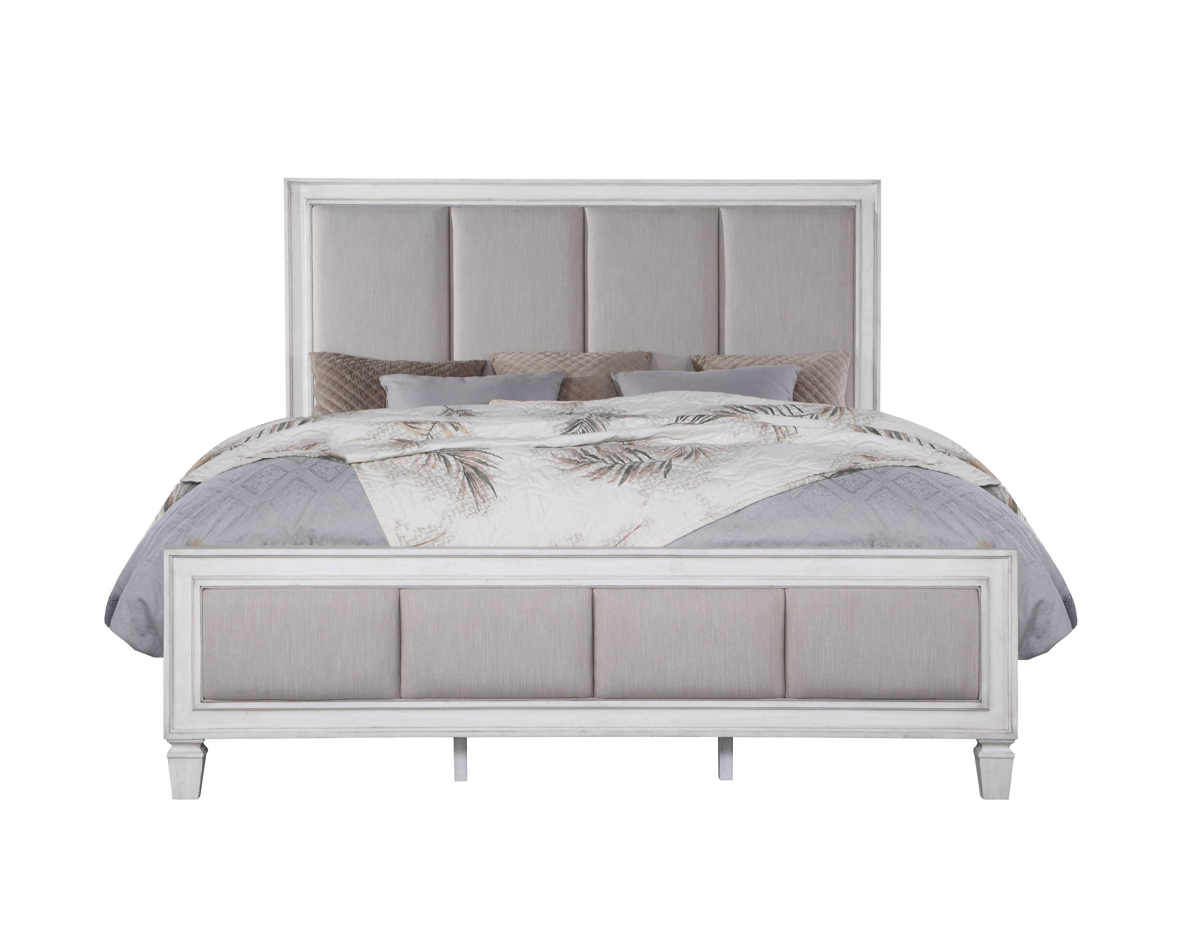 Bring serene, transitional style to your master bedroom with this Eastern King bed crafted in light gray linen upholstery and finished in rustic gray and weathered white. The softly padded headboard and footboard combine comfort with refined farmhouse charm, while durable poplar construction and reinforced supports ensure long-lasting stability. Designed to pair with your existing mattress and box spring, this bed becomes a restful, elegant centerpiece that complements a wide range of décor.