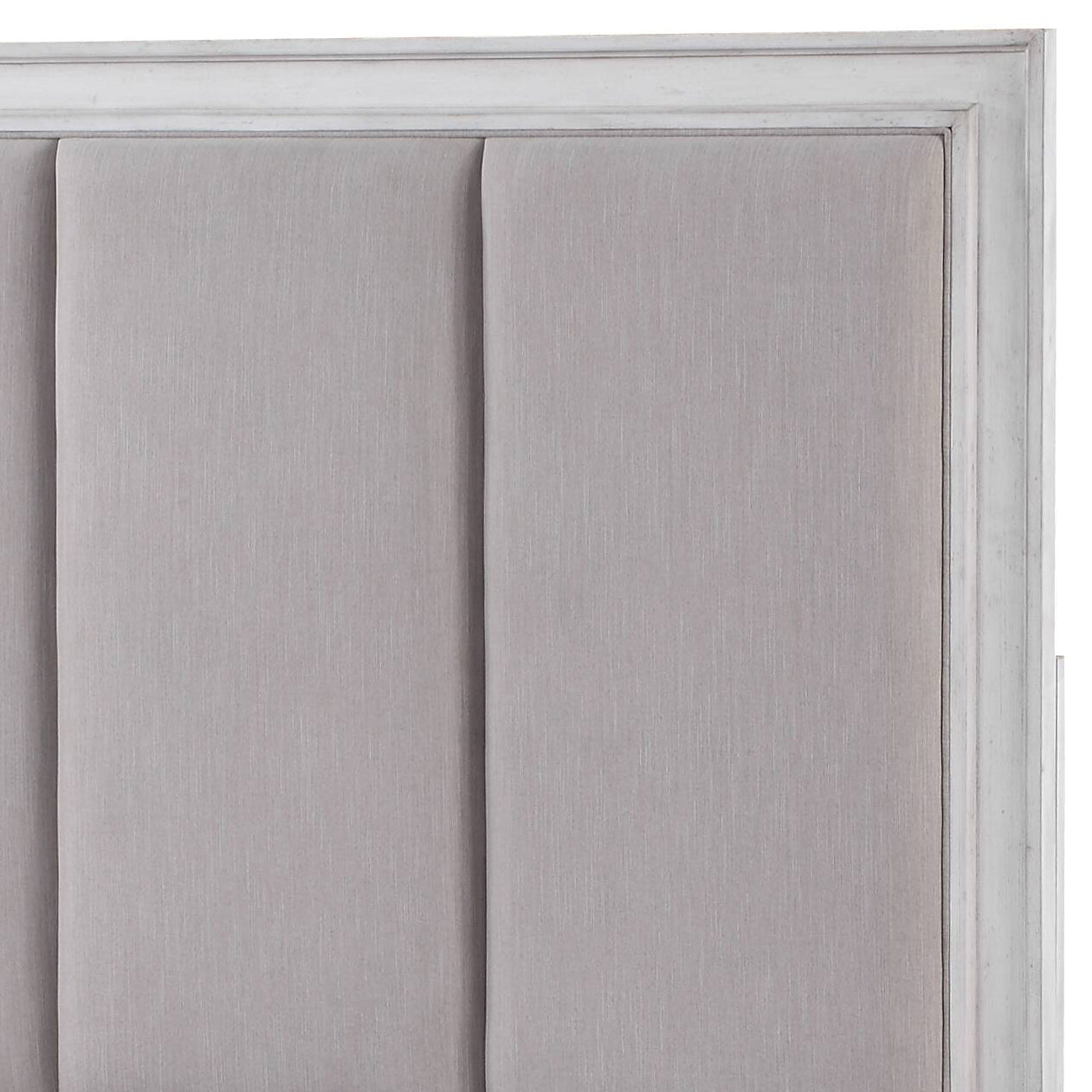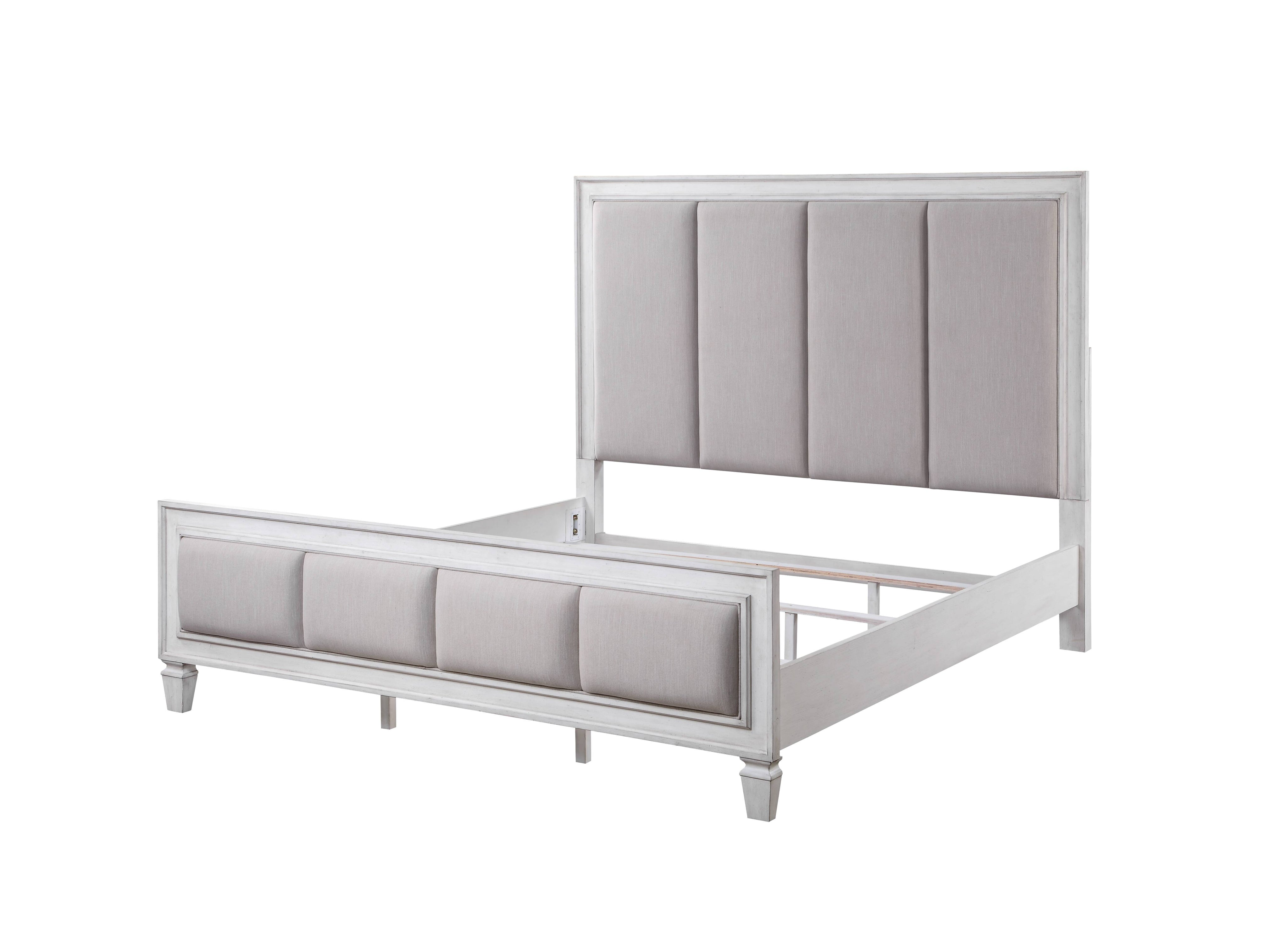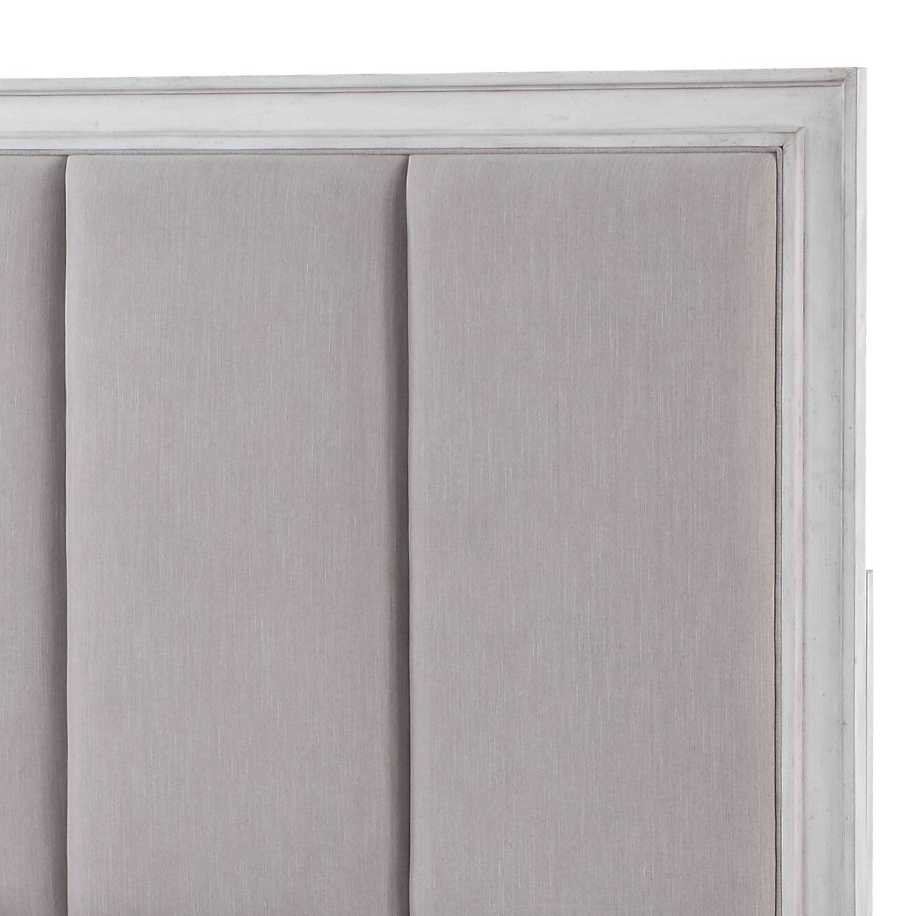 - The Eastern King Bed in Light Gray Linen with a Rustic Gray and Weathered White Finish brings an understated elegance to any bedroom with its transitional style.