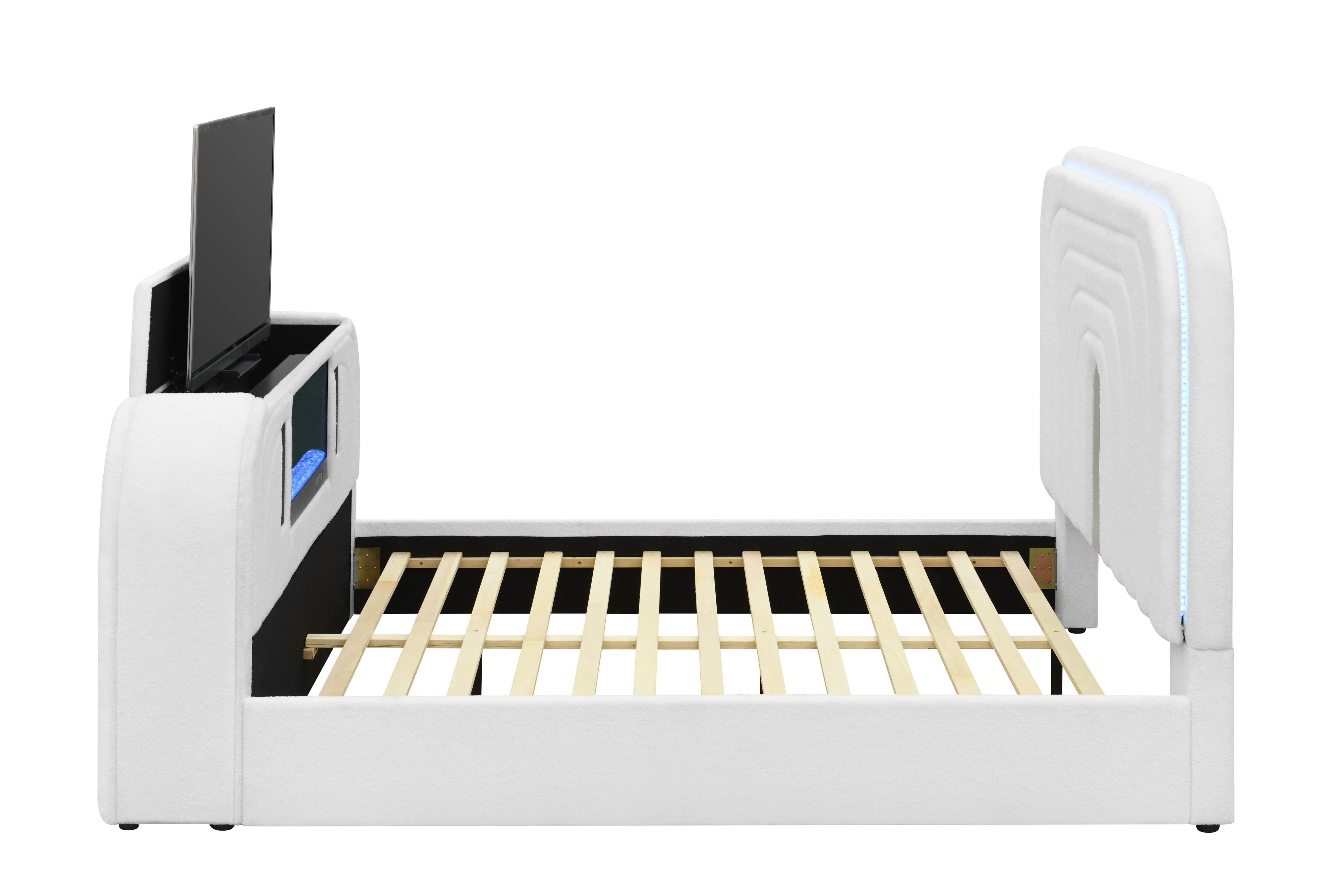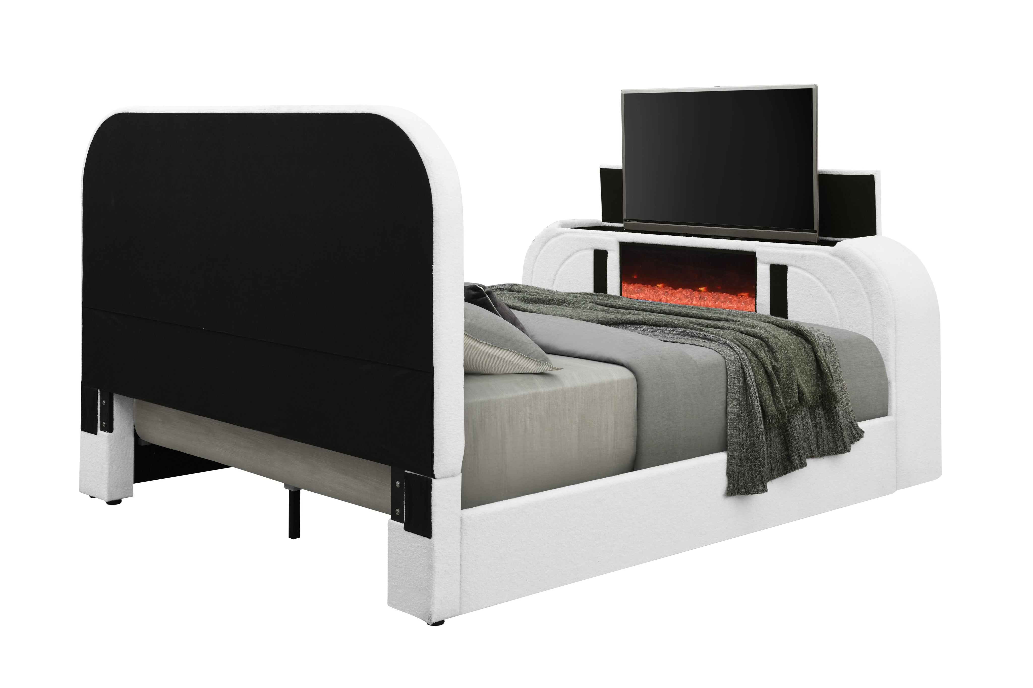Experience luxury and modern convenience with the Shelyn White Teddy Sherpa & Chrome EK Bed — a fully integrated bedroom centerpiece that blends plush comfort, ambient LED lighting, built-in media, and smart fireplace features. Designed for style and functionality, this bed eliminates the need for a box spring and includes a motorized TV lift, Bluetooth speakers, and an app-controlled fireplace so you can create the perfect sleep and entertainment environment with minimal effort.