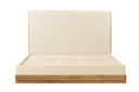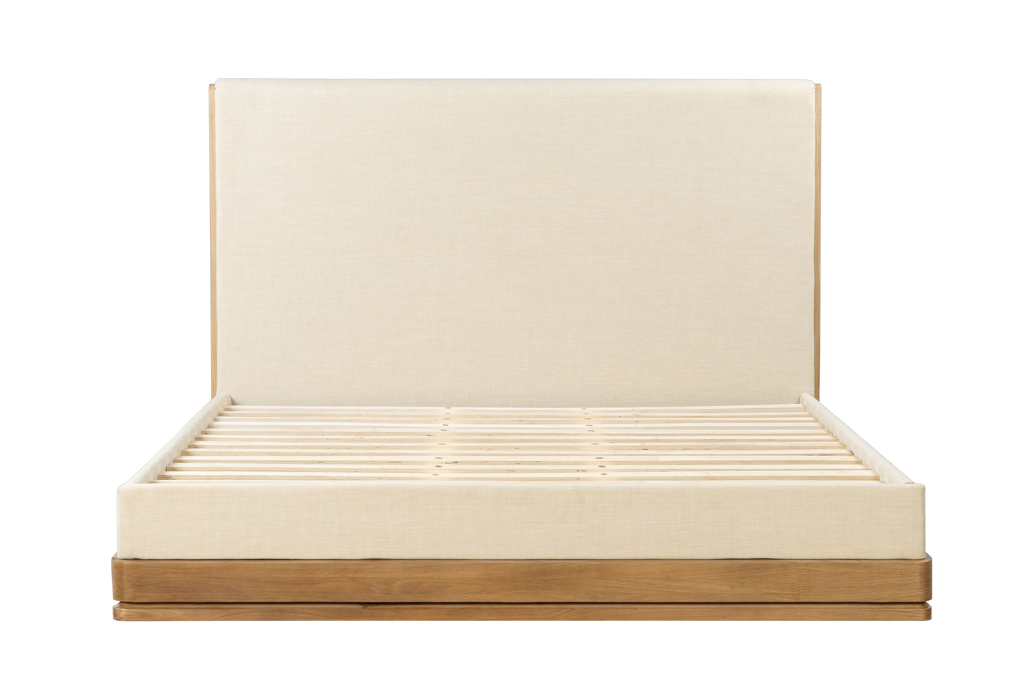 A modern and elegantly crafted platform bed that blends warm oak tones with soft beige upholstery for a refined bedroom centerpiece. The Zoey design offers sturdy construction, integrated slat support that eliminates the need for a box spring, and a versatile aesthetic that complements contemporary and transitional decor.
