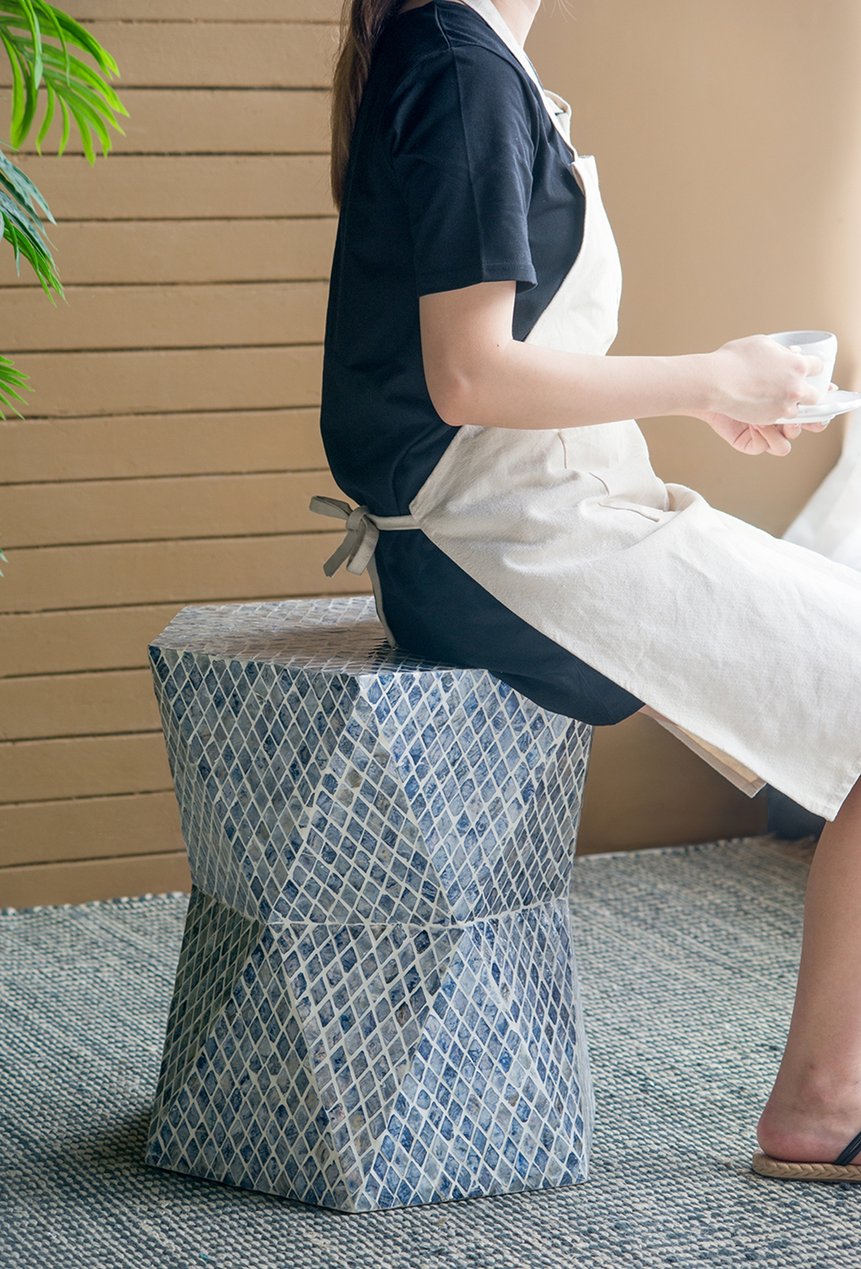 Add a touch of modern coastal elegance to any room with this tapered blue Capiz pedestal stool. Its clean geometric silhouette and shimmering shell inlay create a sculptural accent that doubles as a convenient side table or extra seat. Ideal for entryways, living rooms, bedrooms, or as a stylish display surface for plants and décor.