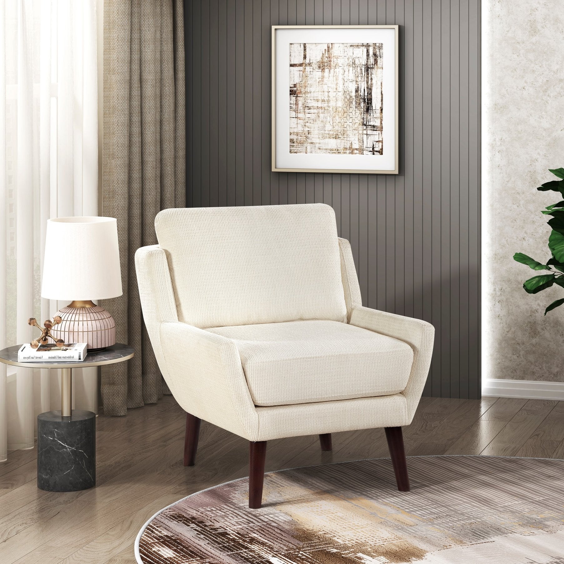 Add a refined mid-century modern touch to your living space with this beige chenille accent chair. Combining durable construction with plush comfort, it features pocket-coil support and high-density foam for long-lasting seating, removable covers for easy cleaning, and solid wood legs to complete a contemporary look that fits bedrooms, living rooms, or reading nooks.