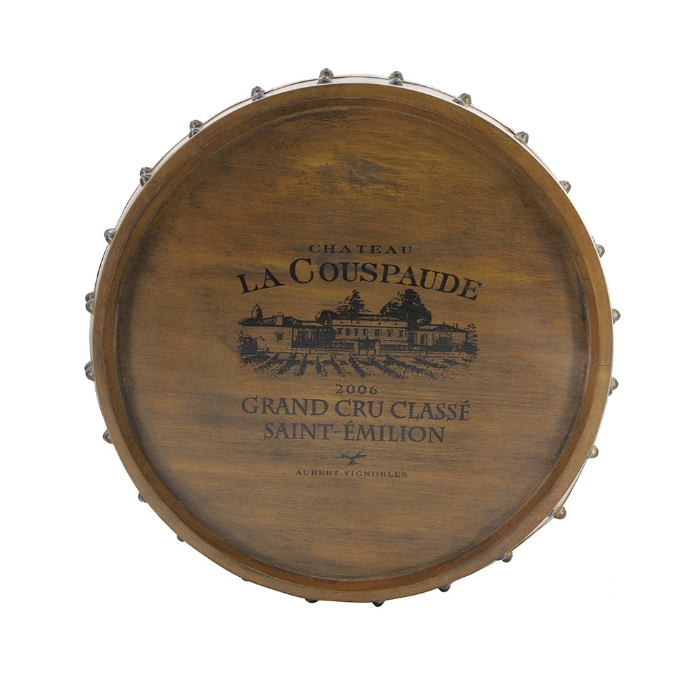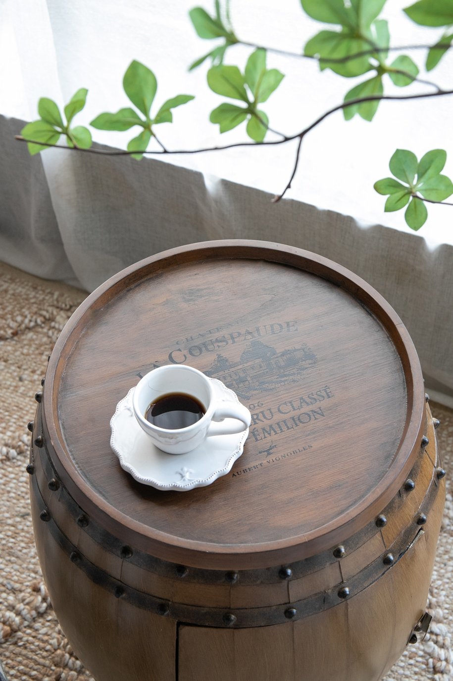 - The Napa barrel is a multi-use table with interior storage made of wood and wrought iron bands.