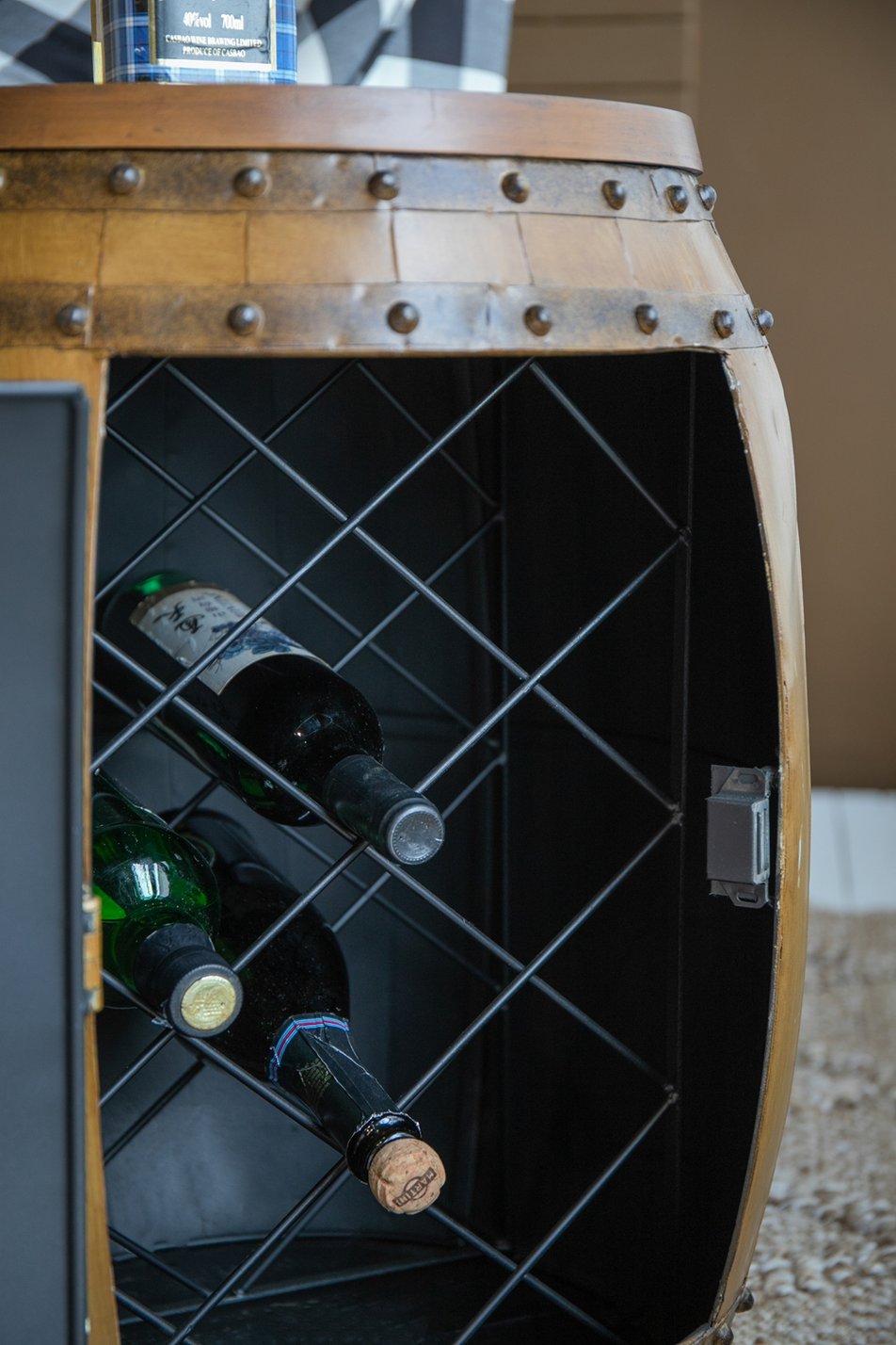 - Not only does this rustic wine barrel add an interesting side table, it opens to reveal an interior wine rack for storing favorite reserves.