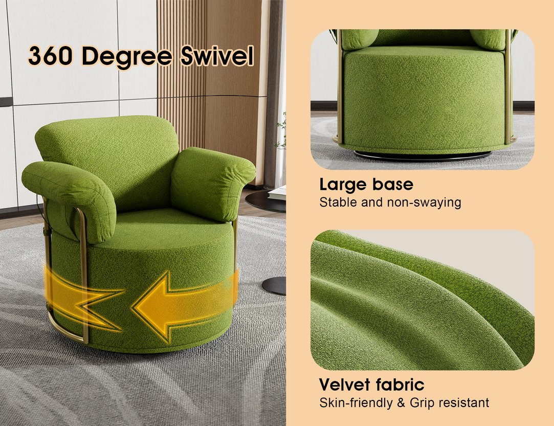 Enjoy modern comfort with a chic, multifunctional swivel chair designed for lounging, reading, or accenting any room. With plush cushioning, soft boucle fabric, and a stylish gold metal base, this wide upholstered armchair blends contemporary luxury with everyday durability — perfect for living rooms, bedrooms, offices, or cozy corners.