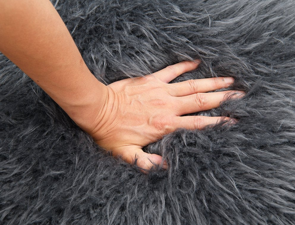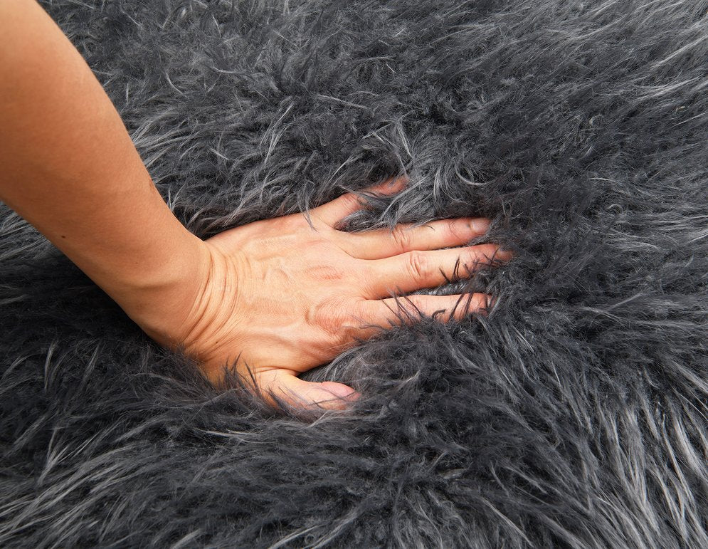 - Upholstery: Charcoal gray “yeti” faux-fur for a soft, tactile surface that’s cozy and stylish.