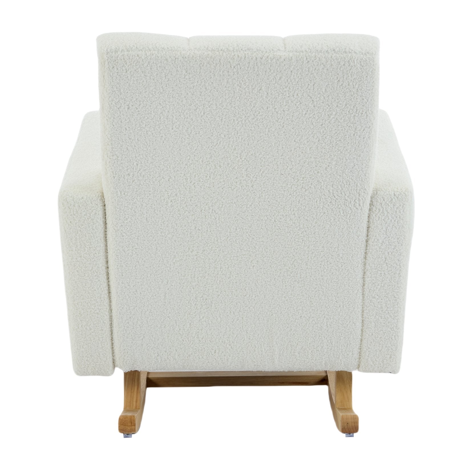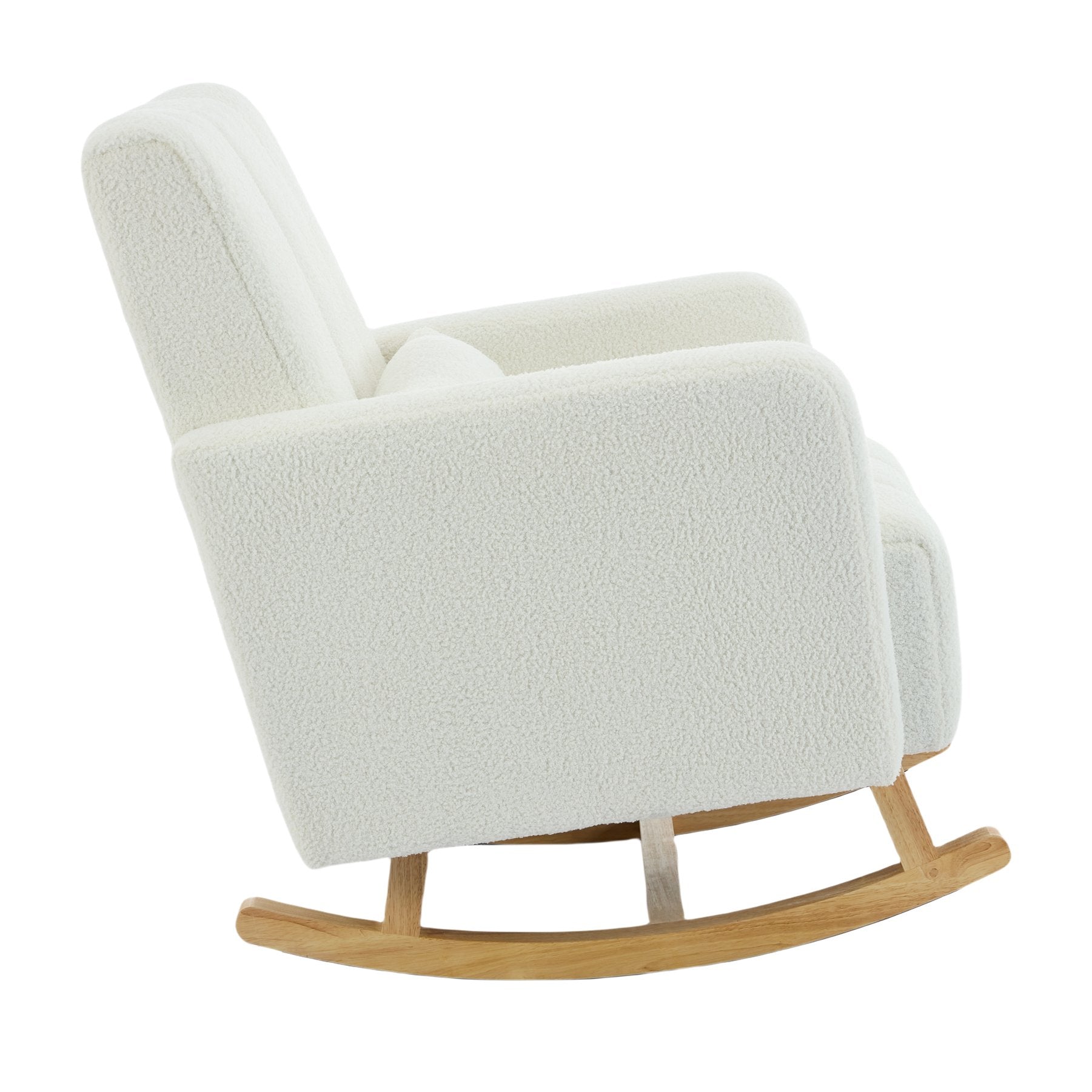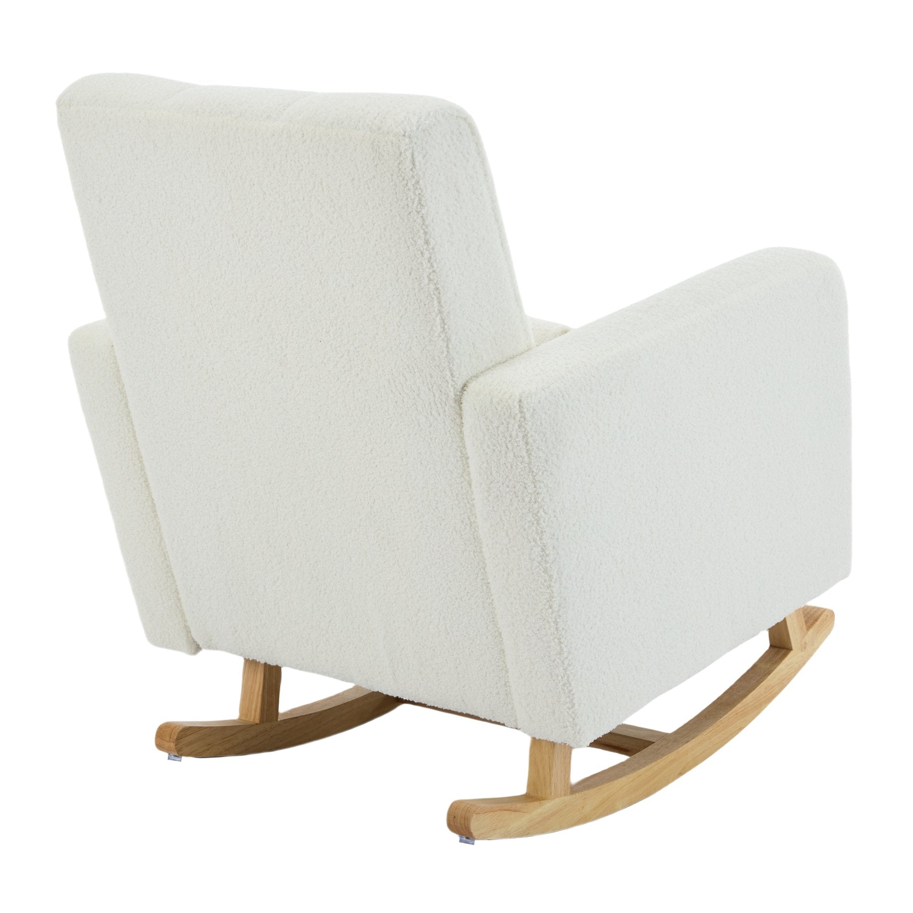 - Stylish Details: The chair features vertical stitching on the backrest, adding a touch of elegance to its design. The nature wooden rockers complement the white teddy velvet, creating a visually appealing contrast.