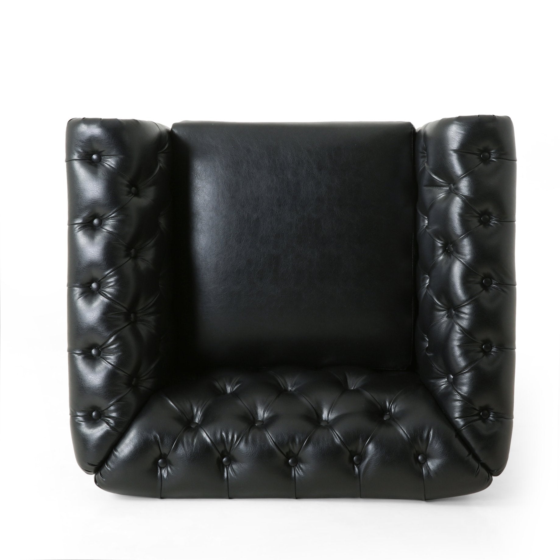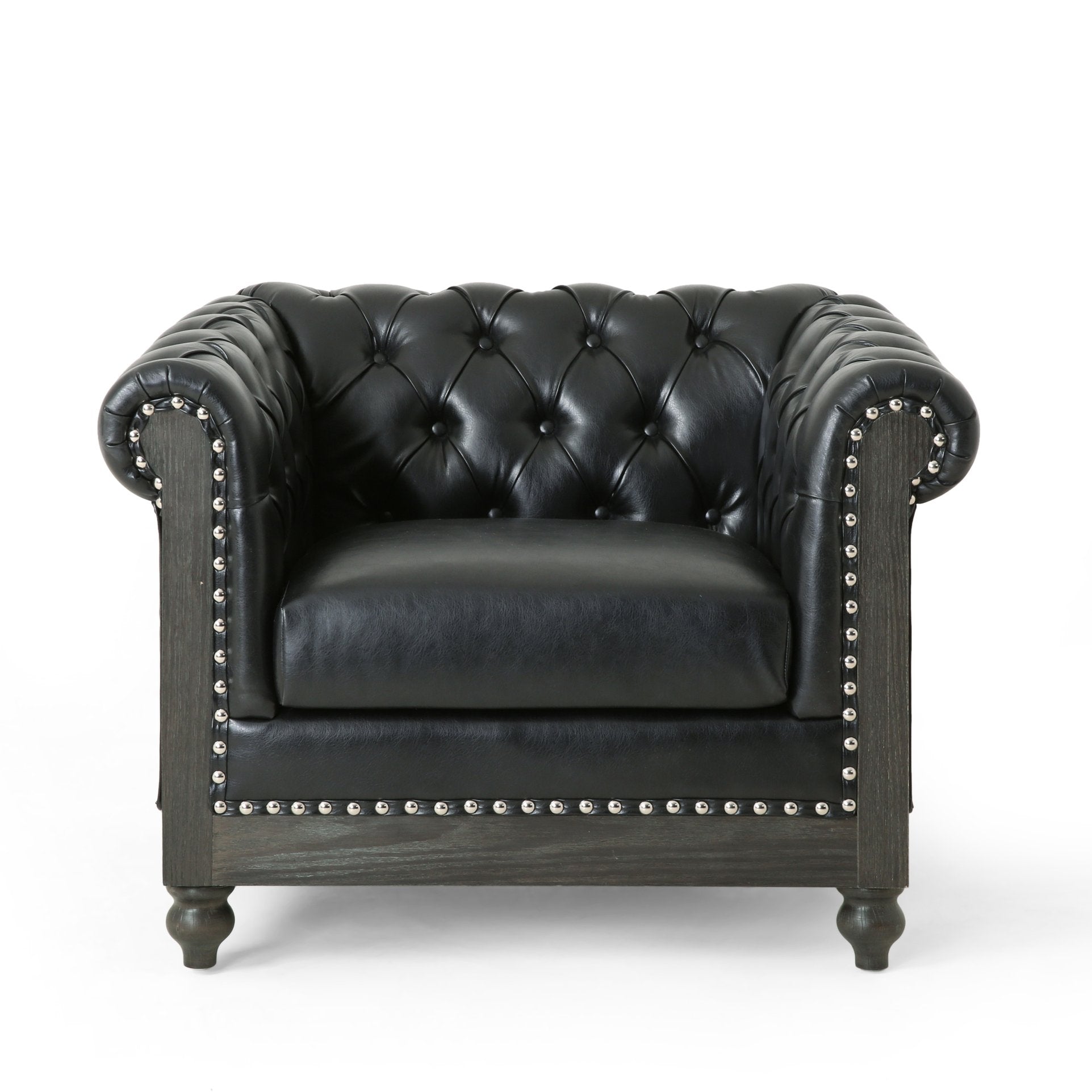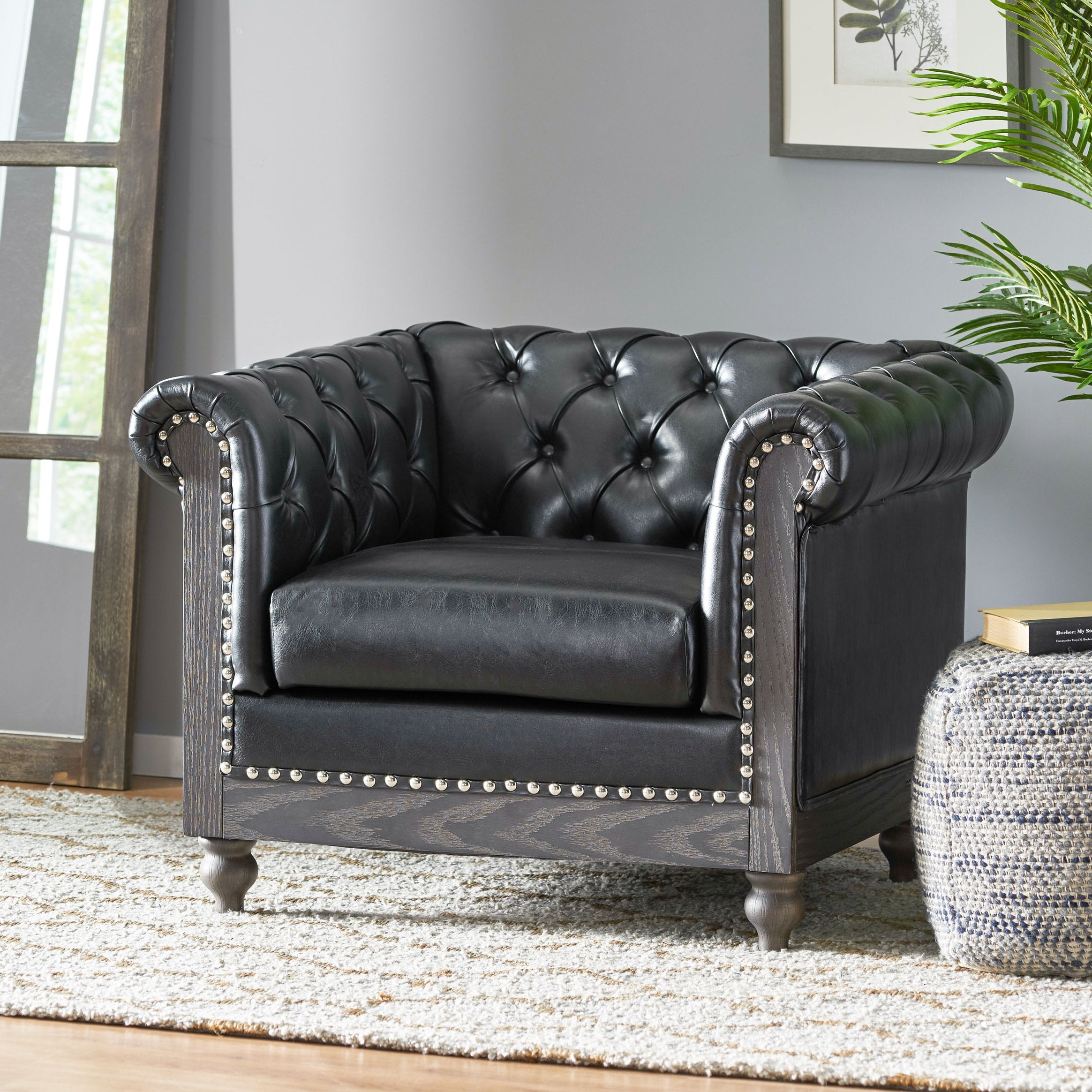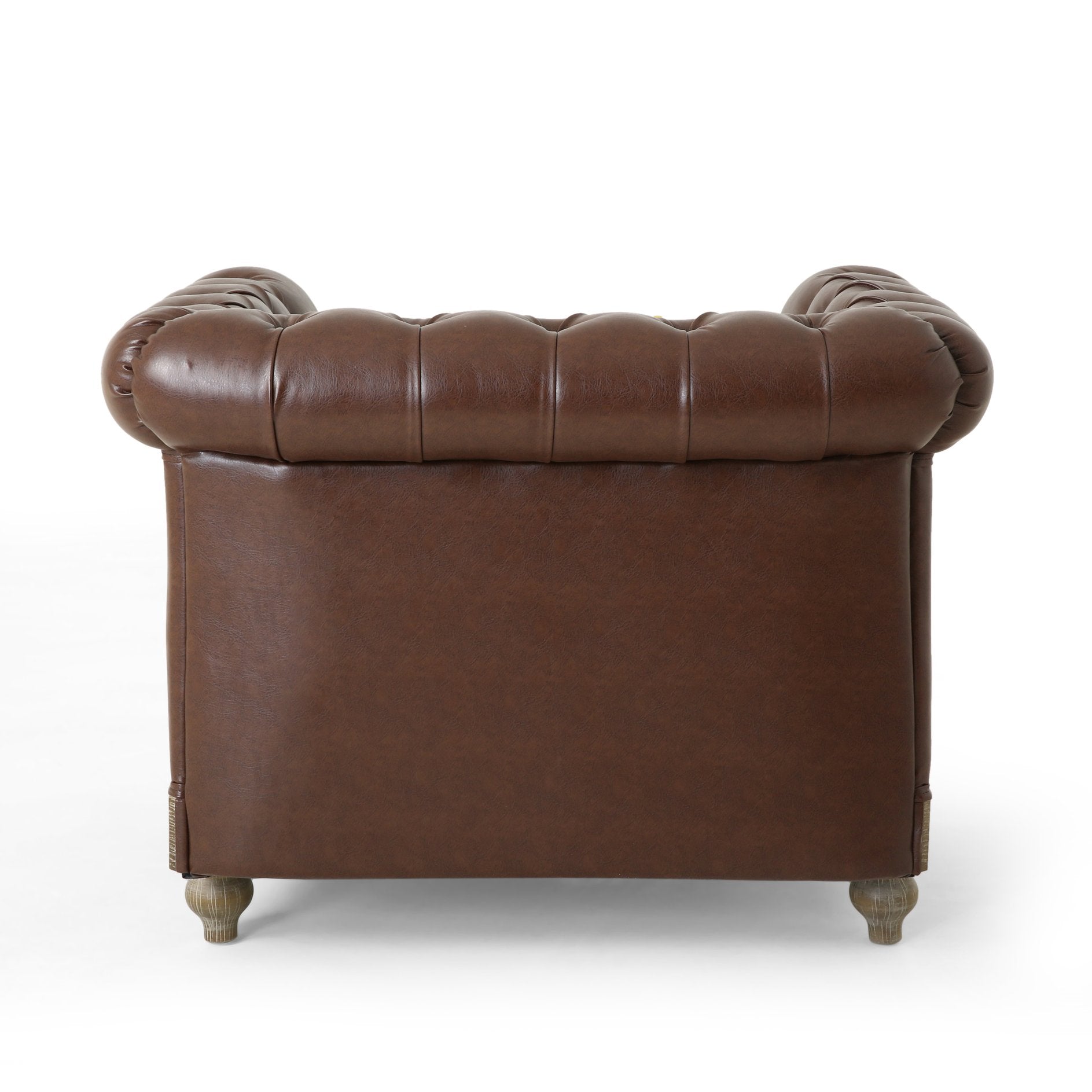 Elevate your living space with a timeless club chair that blends classic Chesterfield styling with warm, rustic charm. Upholstered in light brown PU for an inviting look and easy maintenance, this piece delivers sophisticated details—deep button tufting, nailhead trim, scrolled tuxedo arms and turned legs—while providing comfortable, supportive seating for reading, relaxing, or entertaining.