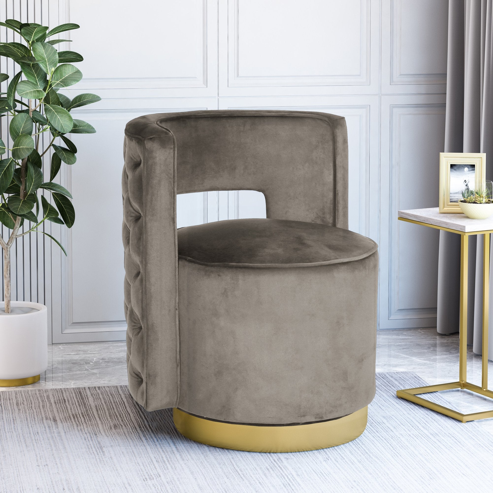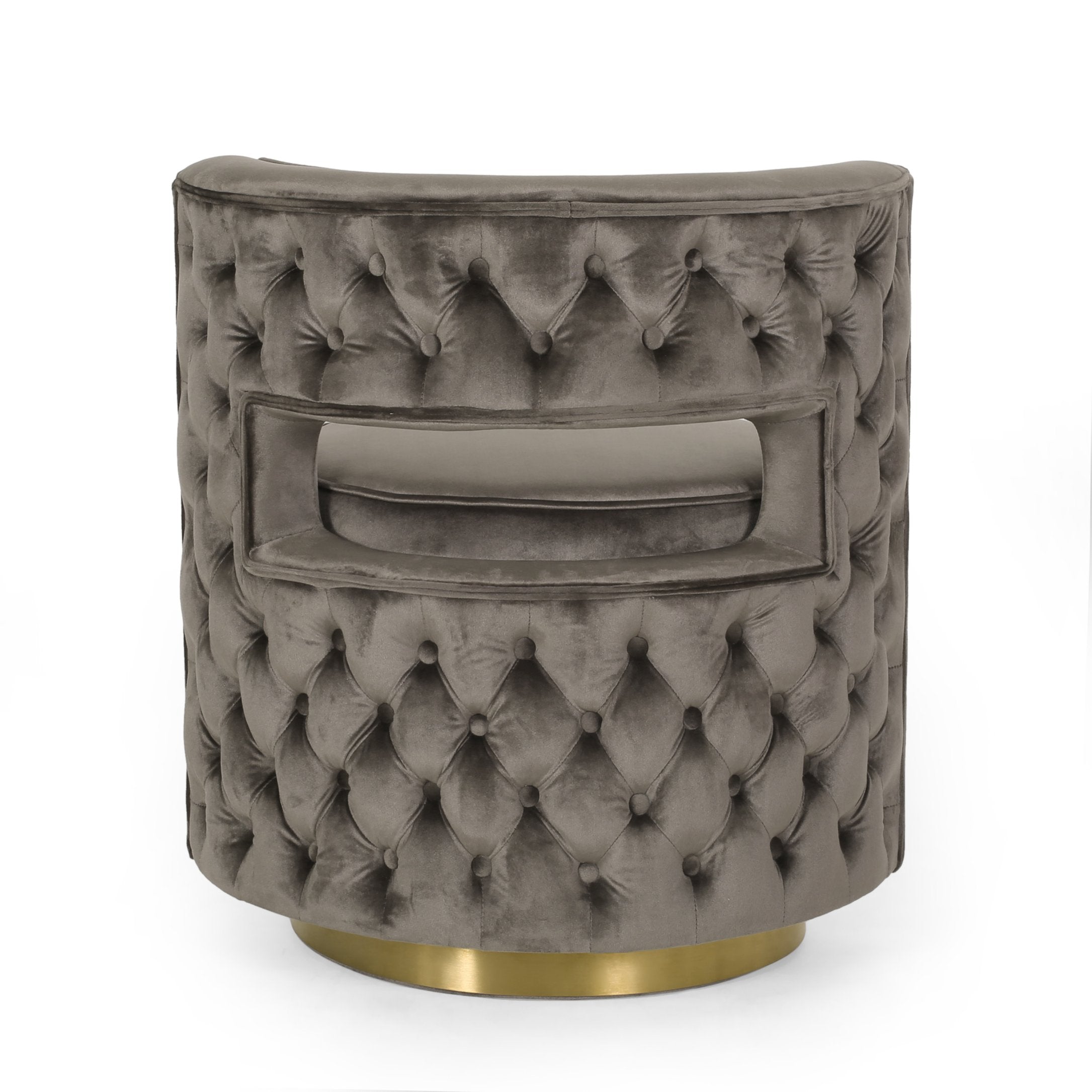 Elevate your living room or lounge with a chic swivel arm chair that combines modern glam styling with everyday comfort. Upholstered in soft grey velvet with button-tufted diamond stitching and an open-back silhouette, this chair makes a sophisticated focal point while the 360° swivel and sturdy metallic base add function and flair.