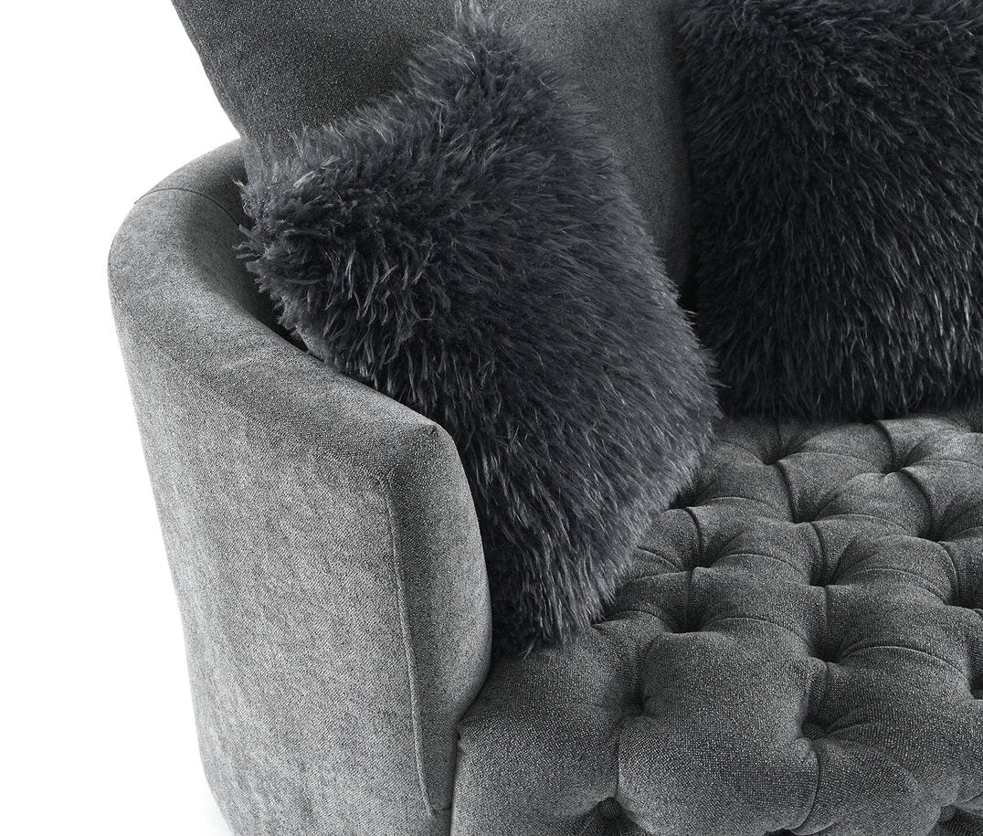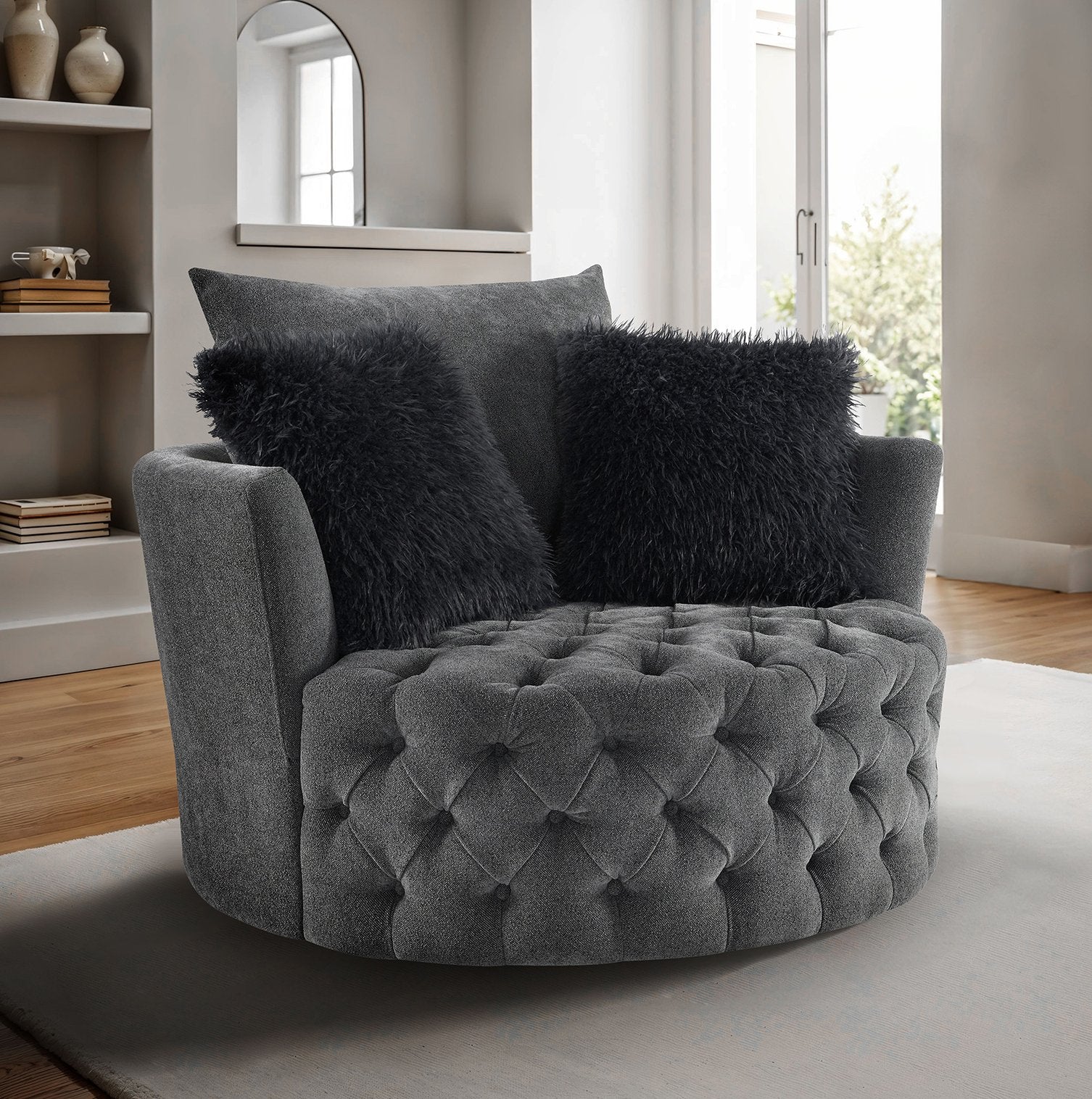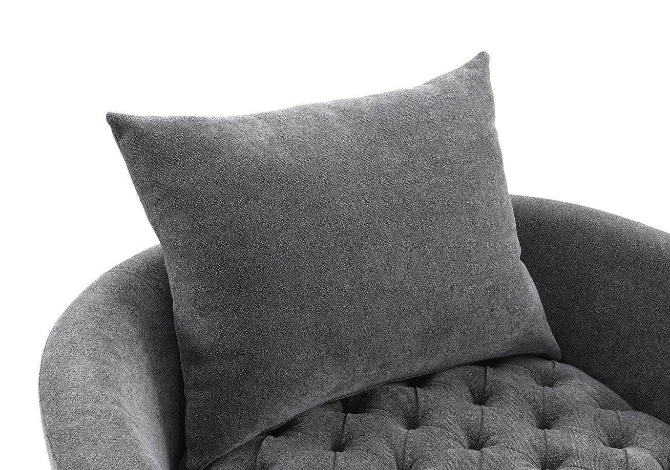 Elevate your living space with this transitional swivel chair that blends modern functionality and timeless comfort. Upholstered in rich dark gray fabric with a channel/button-tufted back and elegant barrel-style arms, this accent piece provides a refined focal point while offering 360° rotation for flexible seating. Ideal for primary living rooms, reading nooks, or conversational groupings, it pairs beautifully with throw pillows or a coordinating ottoman.