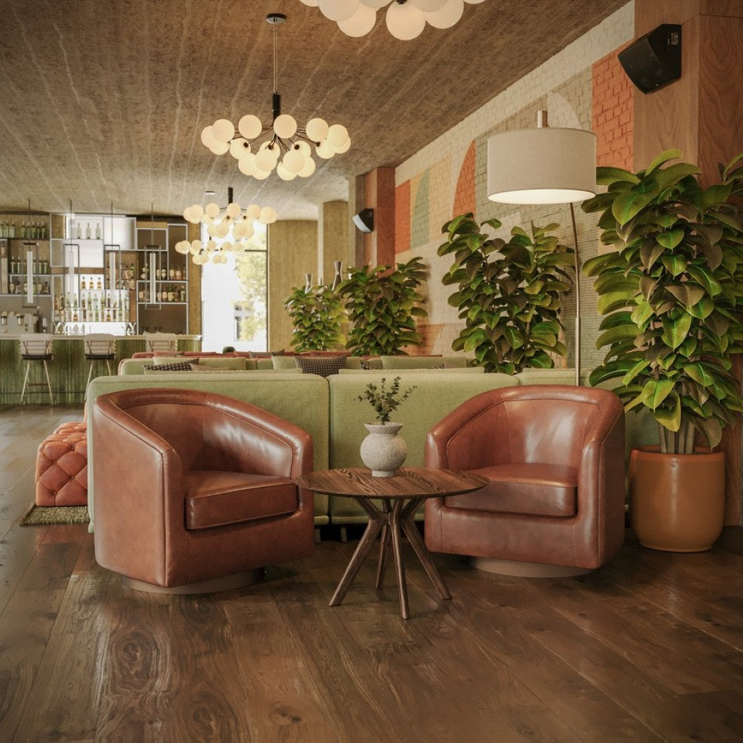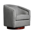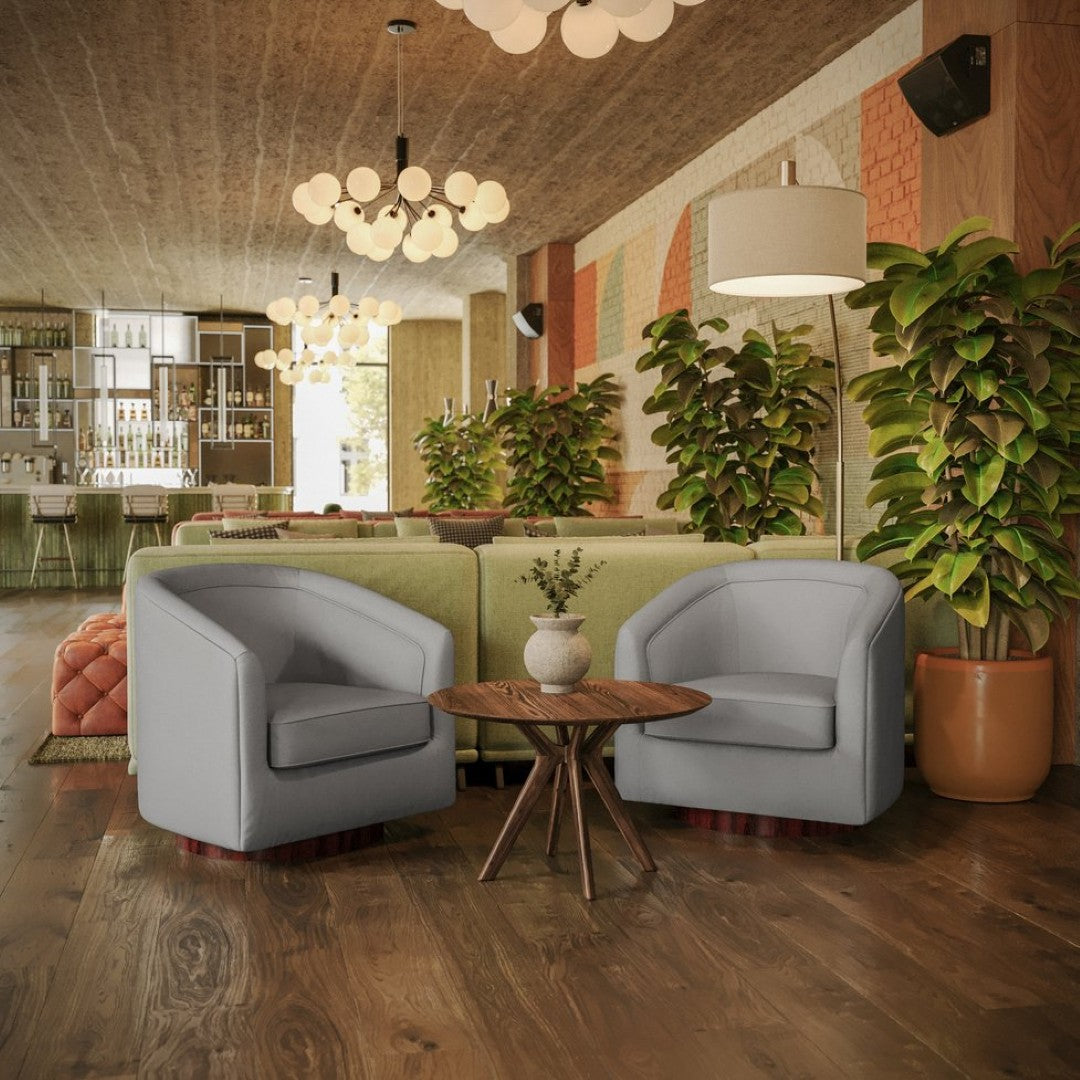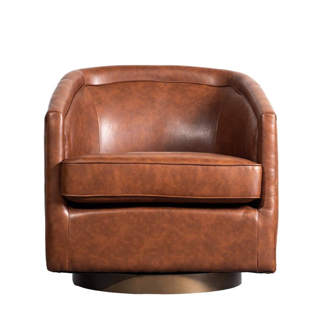 Give your lounge, lobby, or office a refined yet welcoming focal point with this club-style barrel accent armchair. Upholstered in durable Brown LeatherSoft, it combines classic barrel lines and sloped armrests with a smooth 360° swivel base for conversational flexibility and easy movement. The mid-back profile and high-density foam seat deliver comfortable support for extended use, while commercial-grade construction and a powder-coated steel base ensure reliable performance in hospitality or residential settings.