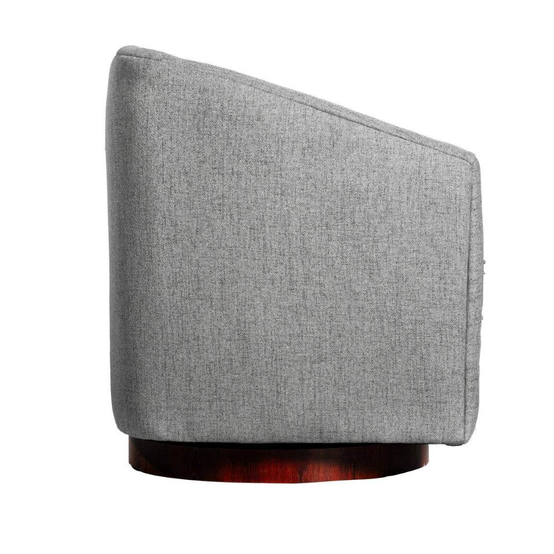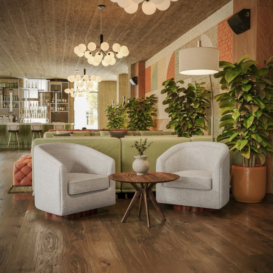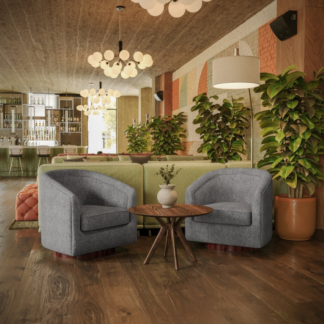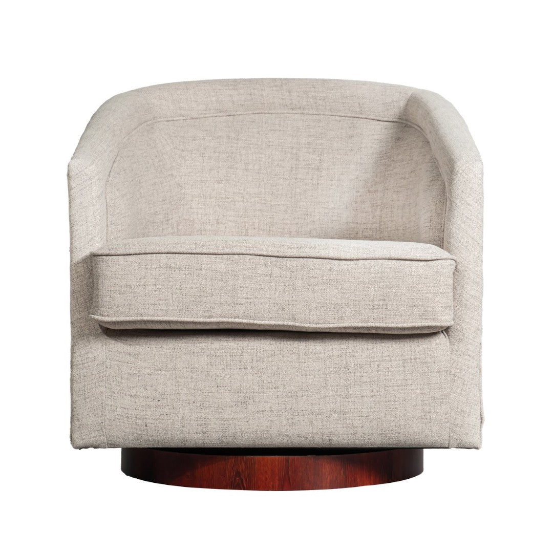 - Design: Classic sloped armrests and rounded barrel silhouette for an inviting look