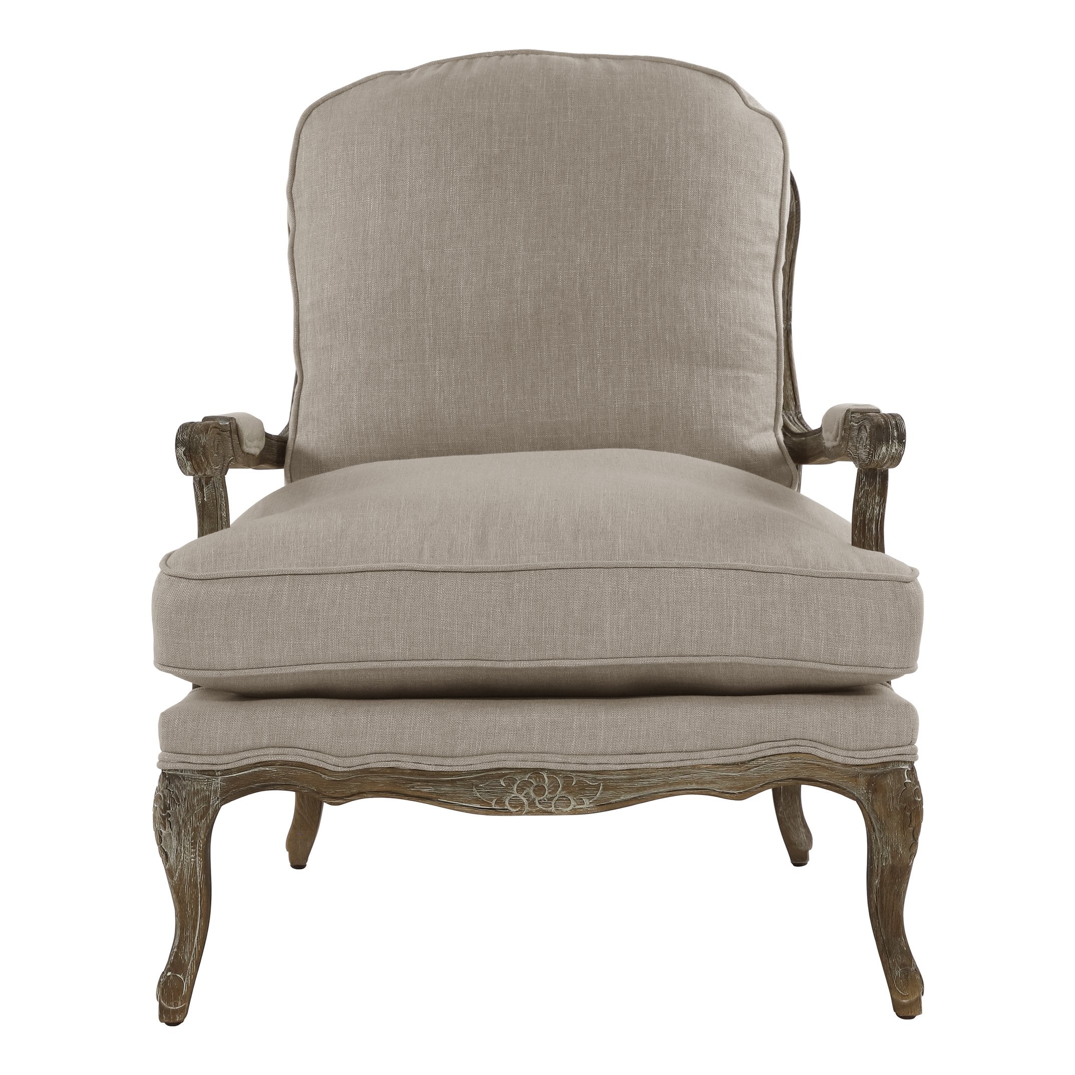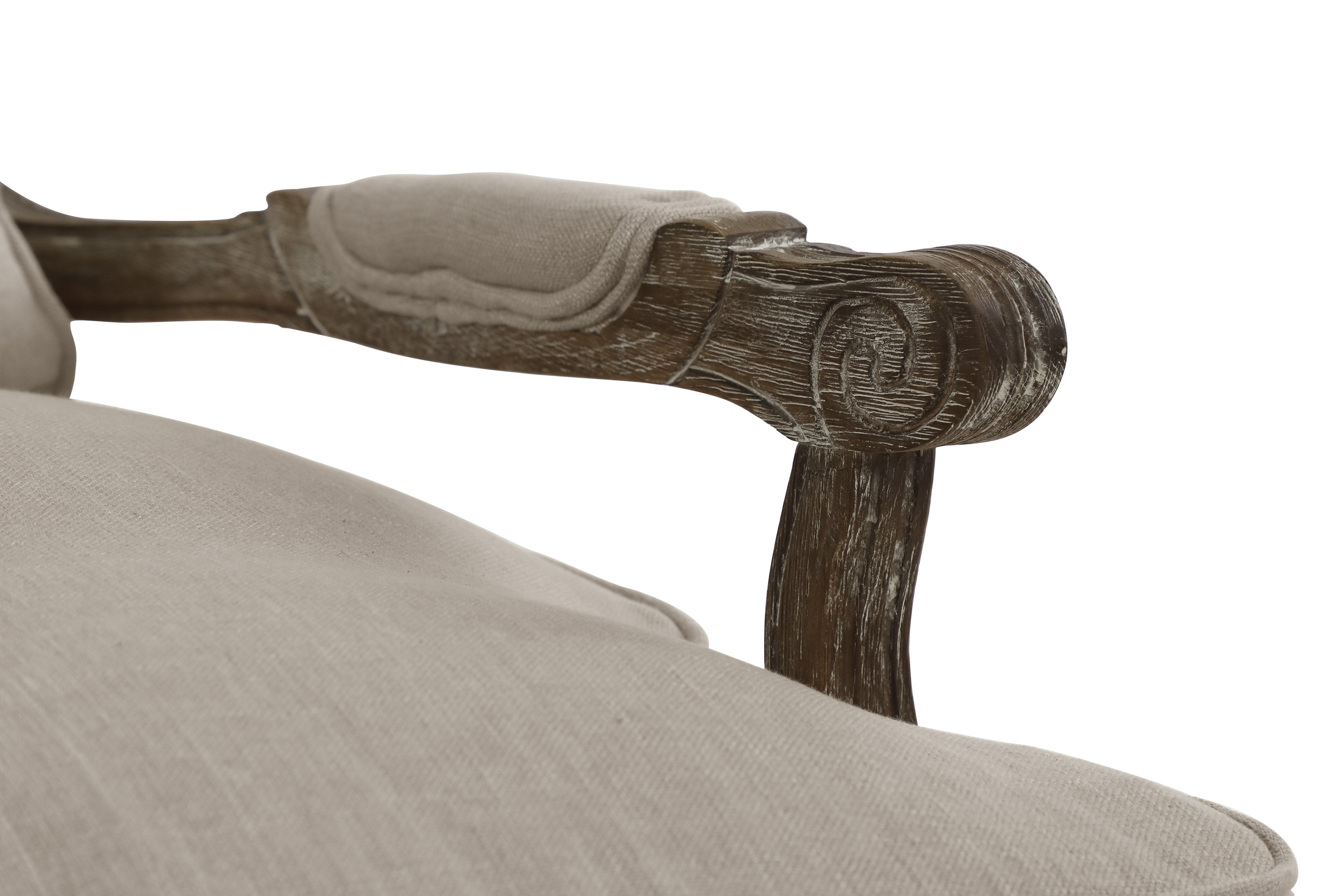 Elevate your living space with this Formal Luxury Accent Chair, where classic craftsmanship meets sumptuous comfort. Thoughtfully designed with intricate wood carvings, a woven rattan back, and plush feather-down seating wrapped in a natural-tone textured fabric, this chair adds refined elegance and a cozy retreat to any room. Its gray weathered finish highlights the wood grain for a timeless, sophisticated look that pairs easily with both traditional and transitional decor.