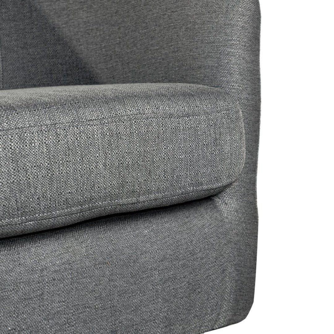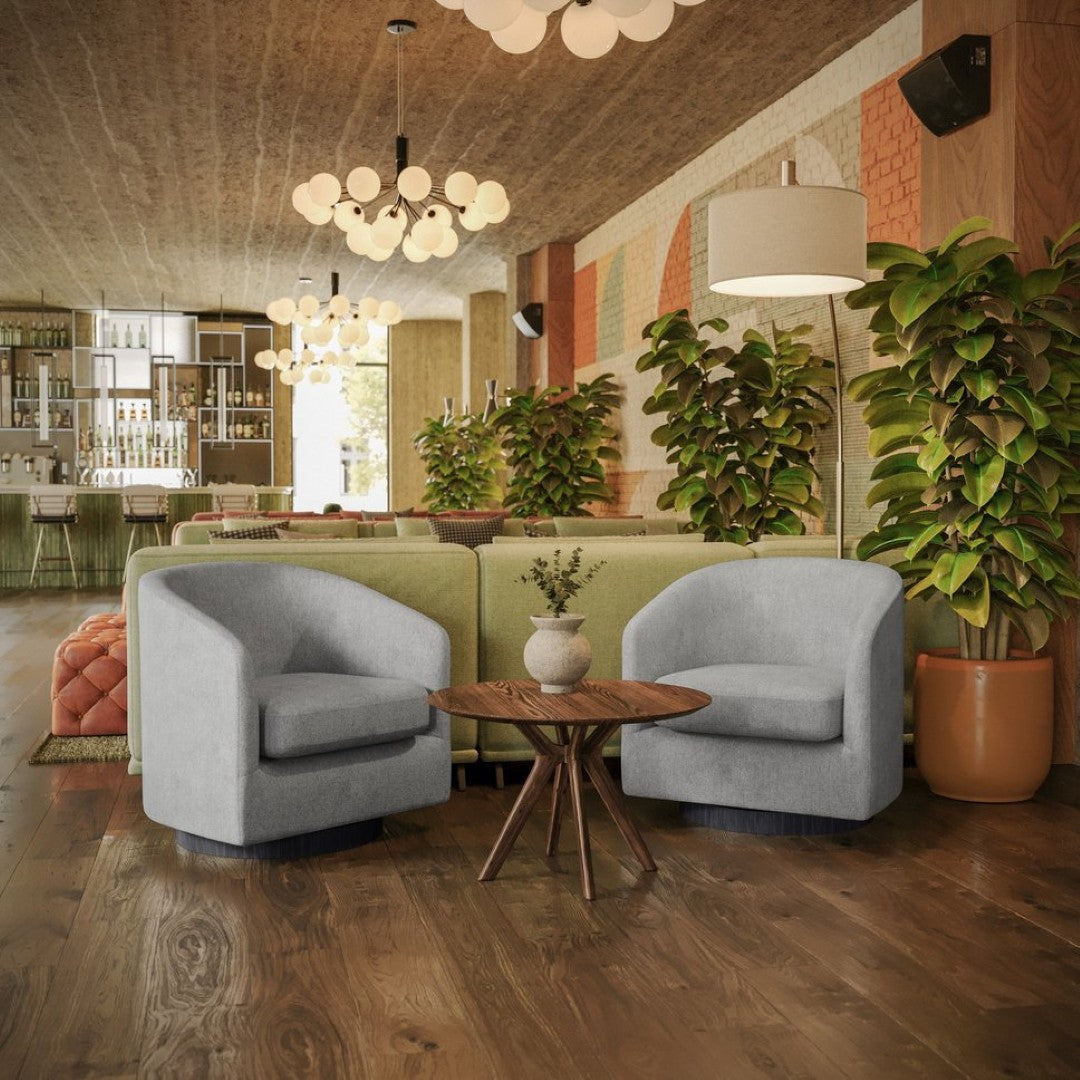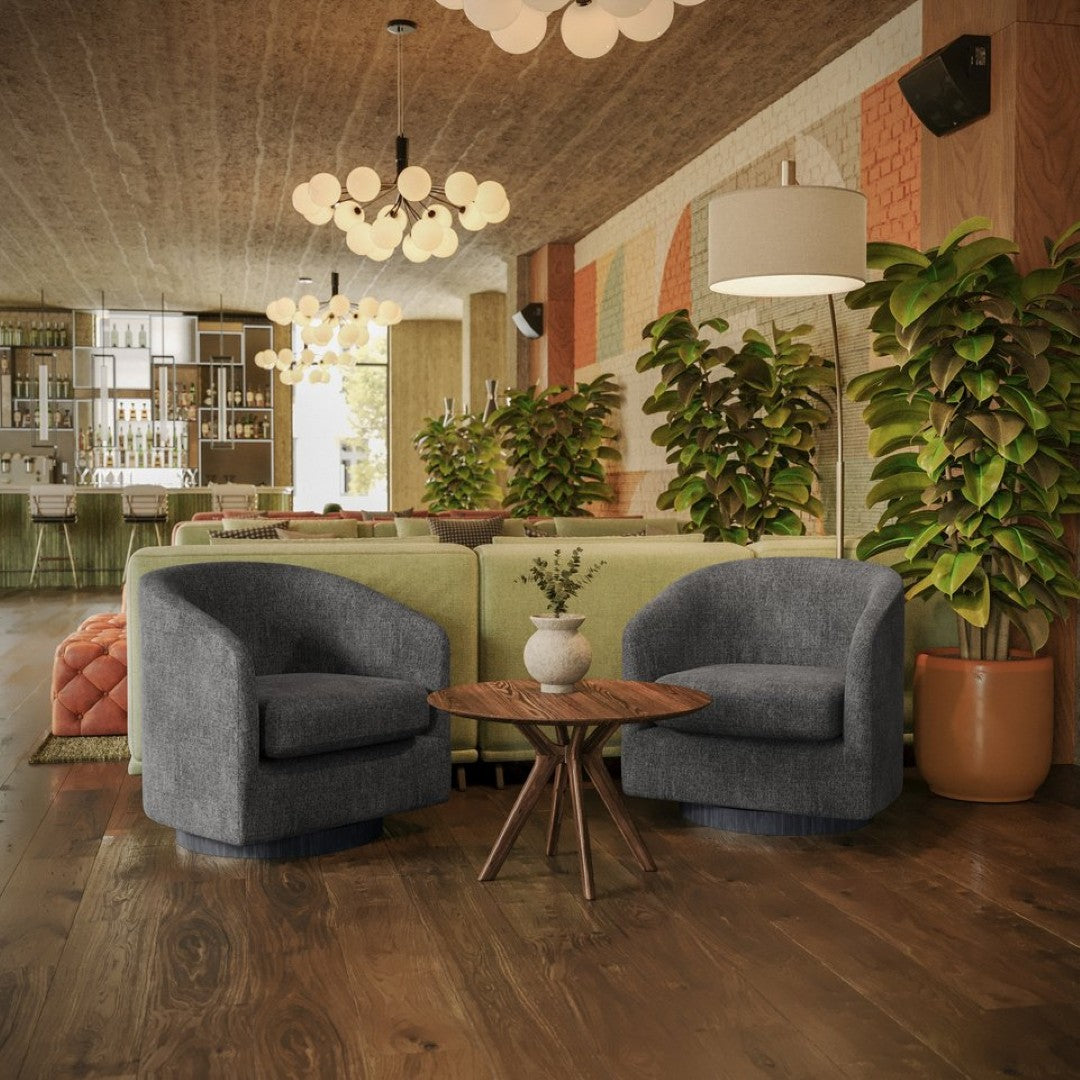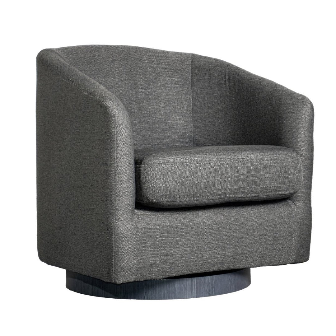 Bring a touch of classic club styling and modern convenience to your lobby, lounge, office, or home with this commercial-grade barrel accent armchair. Upholstered in soft, durable dark gray fabric and built on a sturdy metal swivel base, it blends comfort, endurance, and easy maintenance—ideal for hospitality settings, waiting areas, and high-traffic residential spaces.