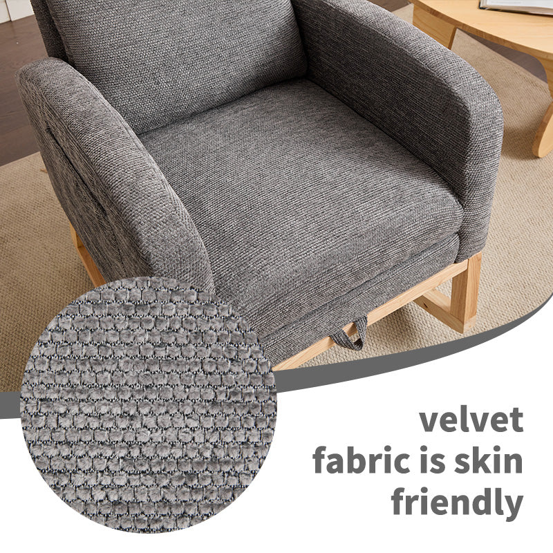 Sink into soothing comfort with this modern rocking armchair — designed for nurseries, living rooms, or any cozy corner that needs a stylish, supportive seat. Upholstered in soft, breathable polyester and built on a solid wood base, the chair combines gentle rocking motion with ergonomic support for long-lasting relaxation. Practical details like a side pocket and non-slip foot pads make it as functional as it is comfortable.