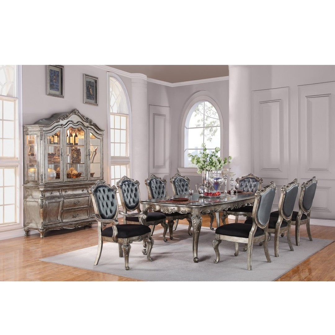 - Finish & Color: Silver grey fabric with antique platinum wood finish — coordinates with neutral and metallic palettes